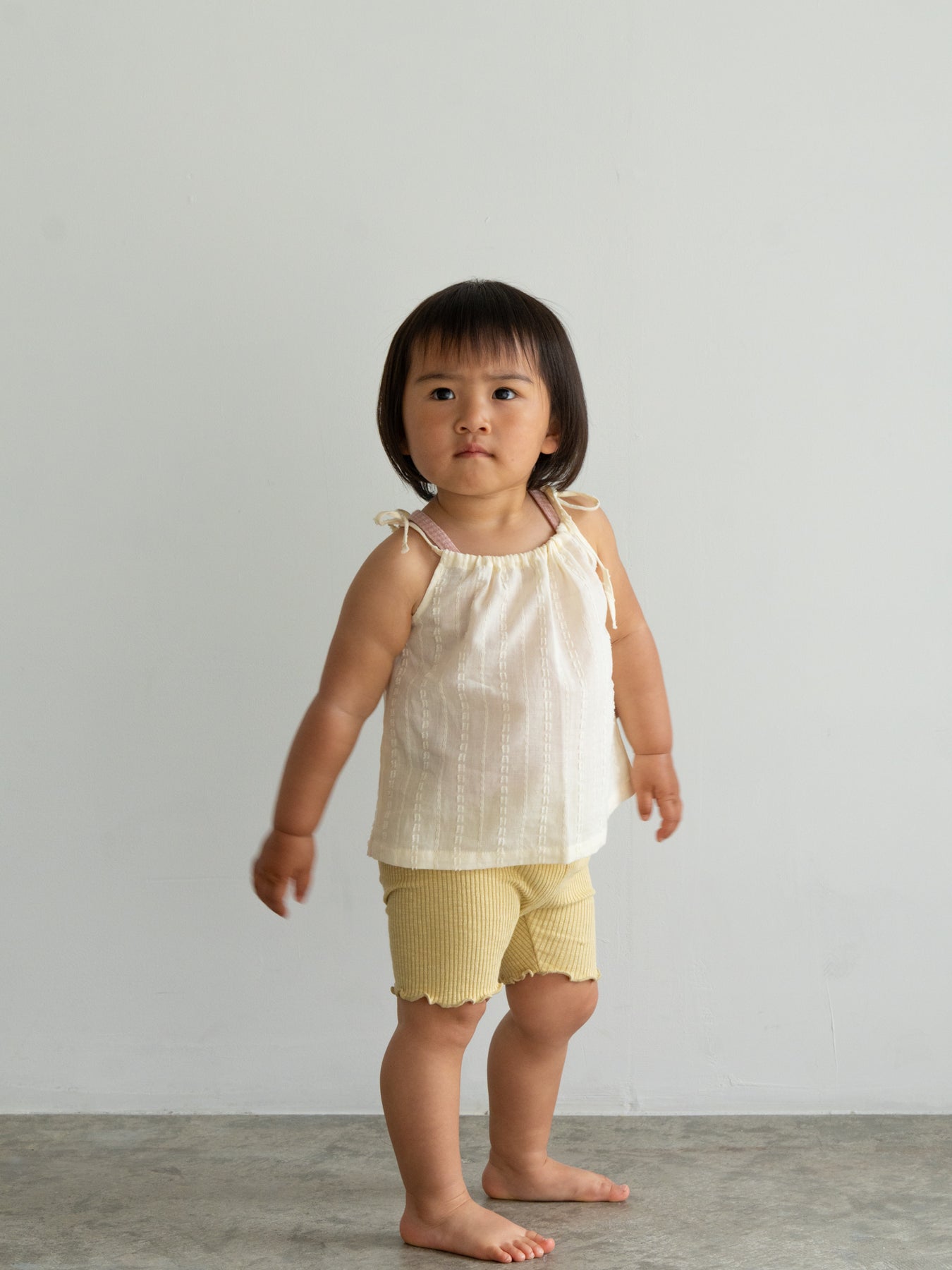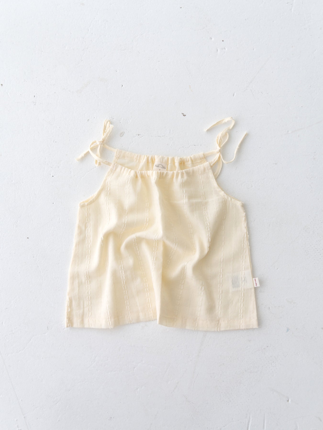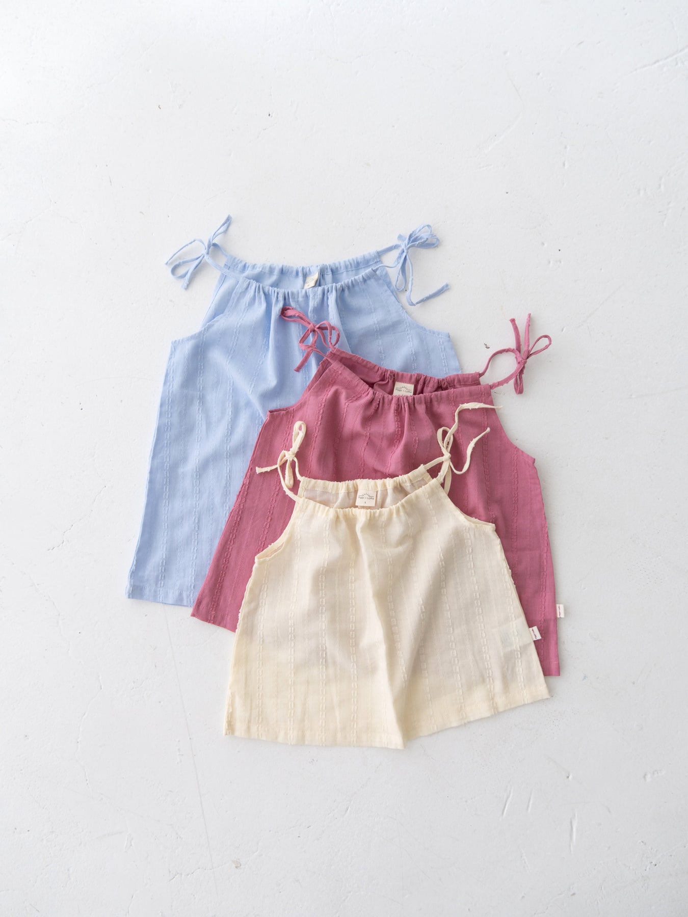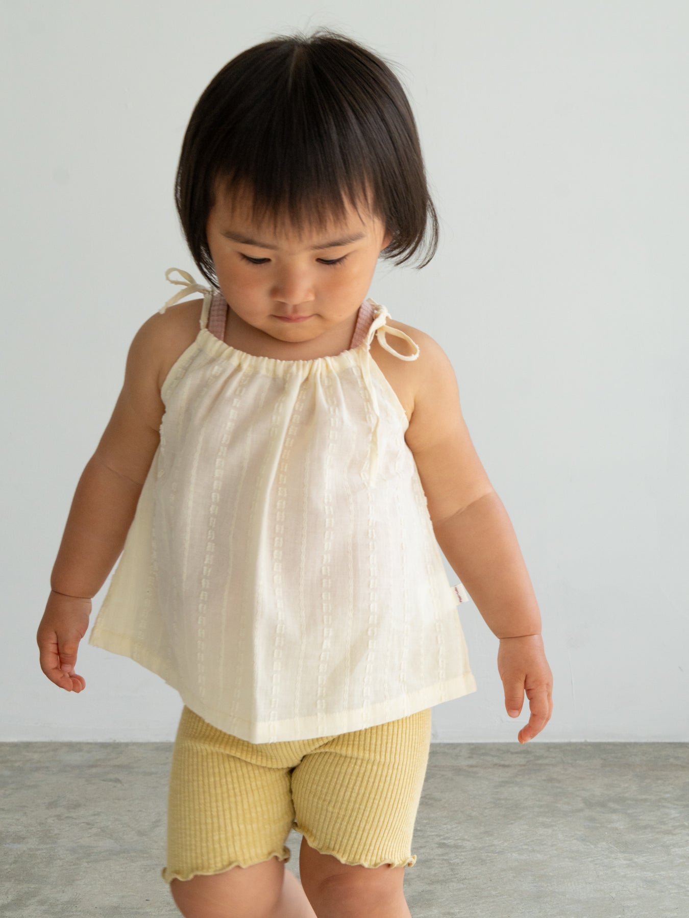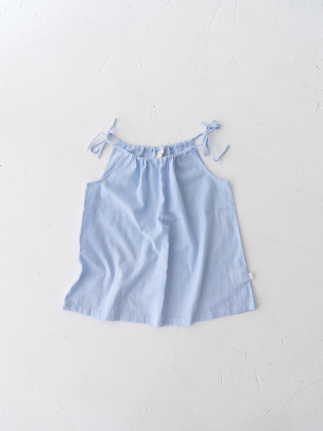 華奢なショルダーストラップは長さ調整が可能なので、成長に合わせて長くご愛用いただけます。暑い日は一枚でさらりと、肌寒い日はTシャツの上にレイヤードしても可愛い万能デザイン。