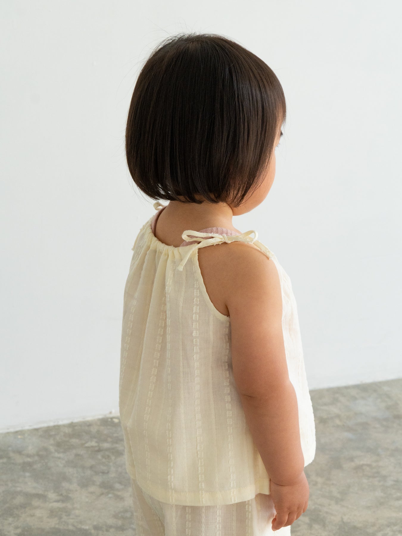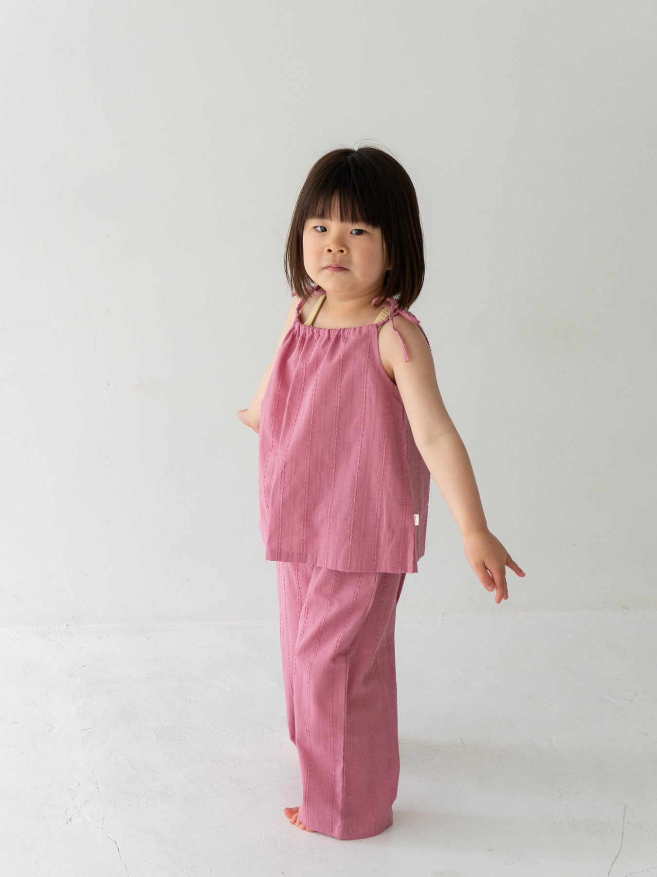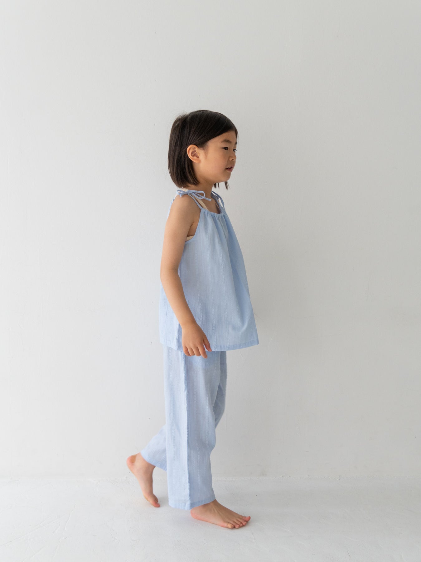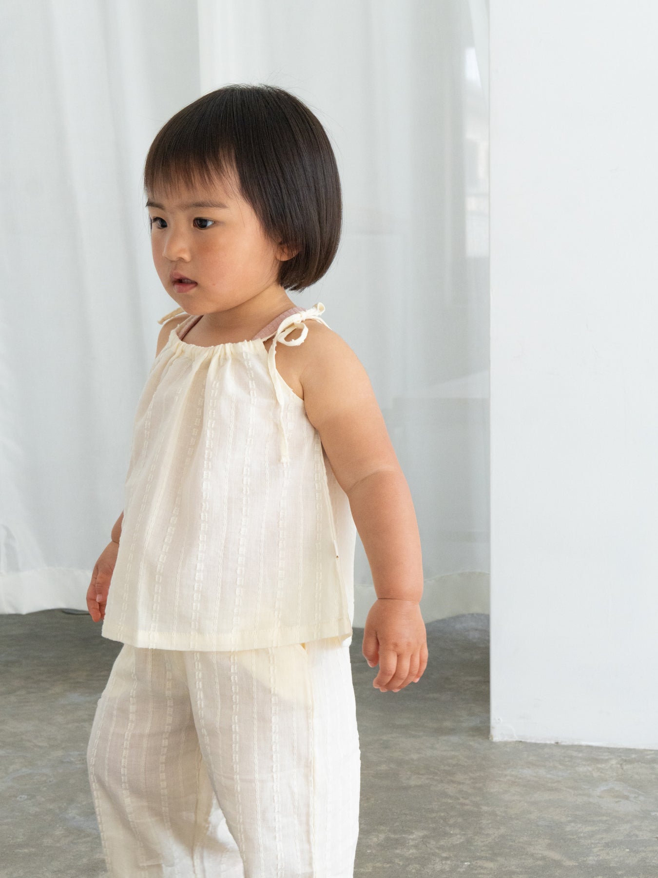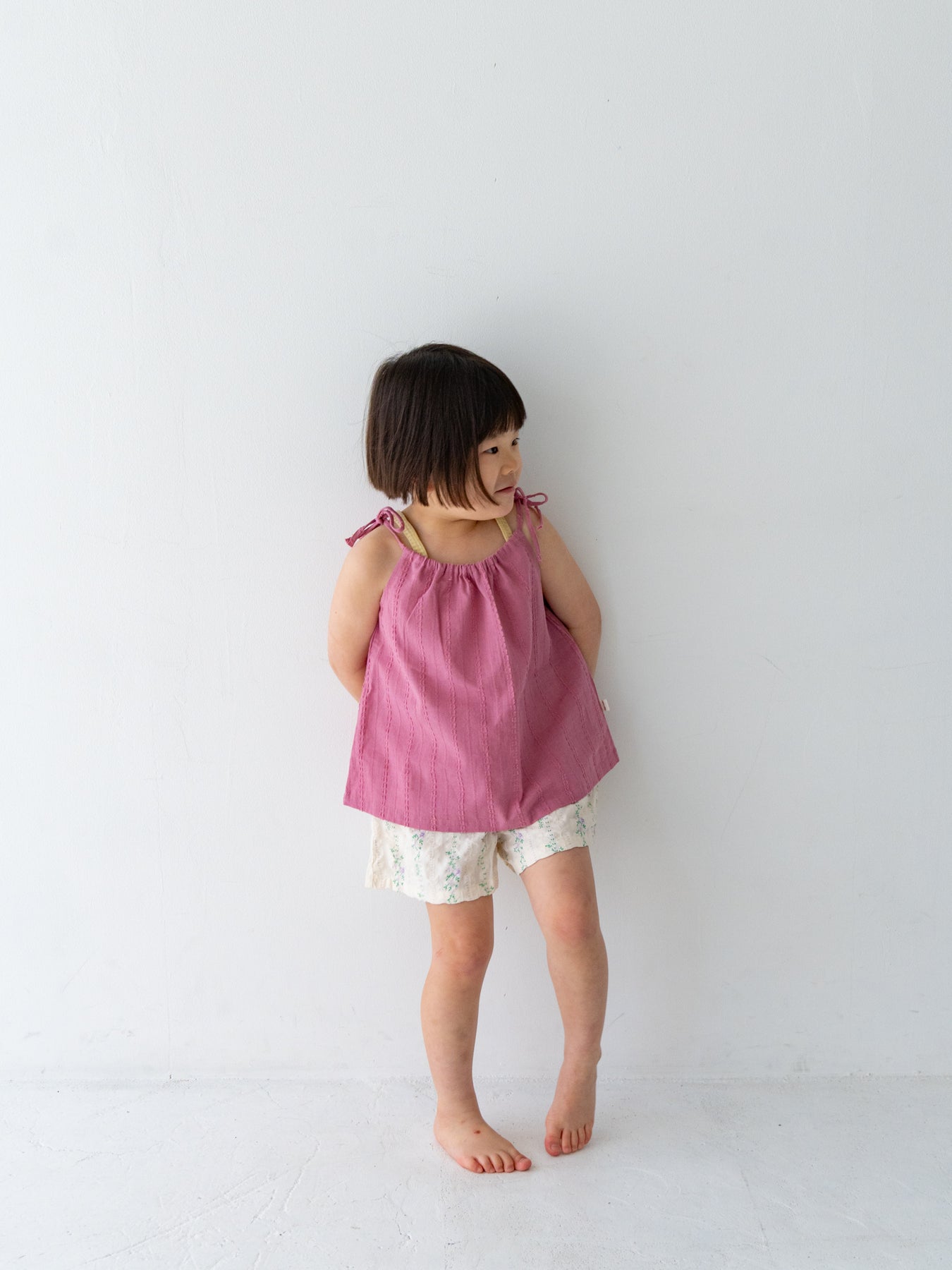 華奢なショルダーストラップは長さ調整が可能なので、成長に合わせて長くご愛用いただけます。暑い日は一枚でさらりと、肌寒い日はTシャツの上にレイヤードしても可愛い万能デザイン。