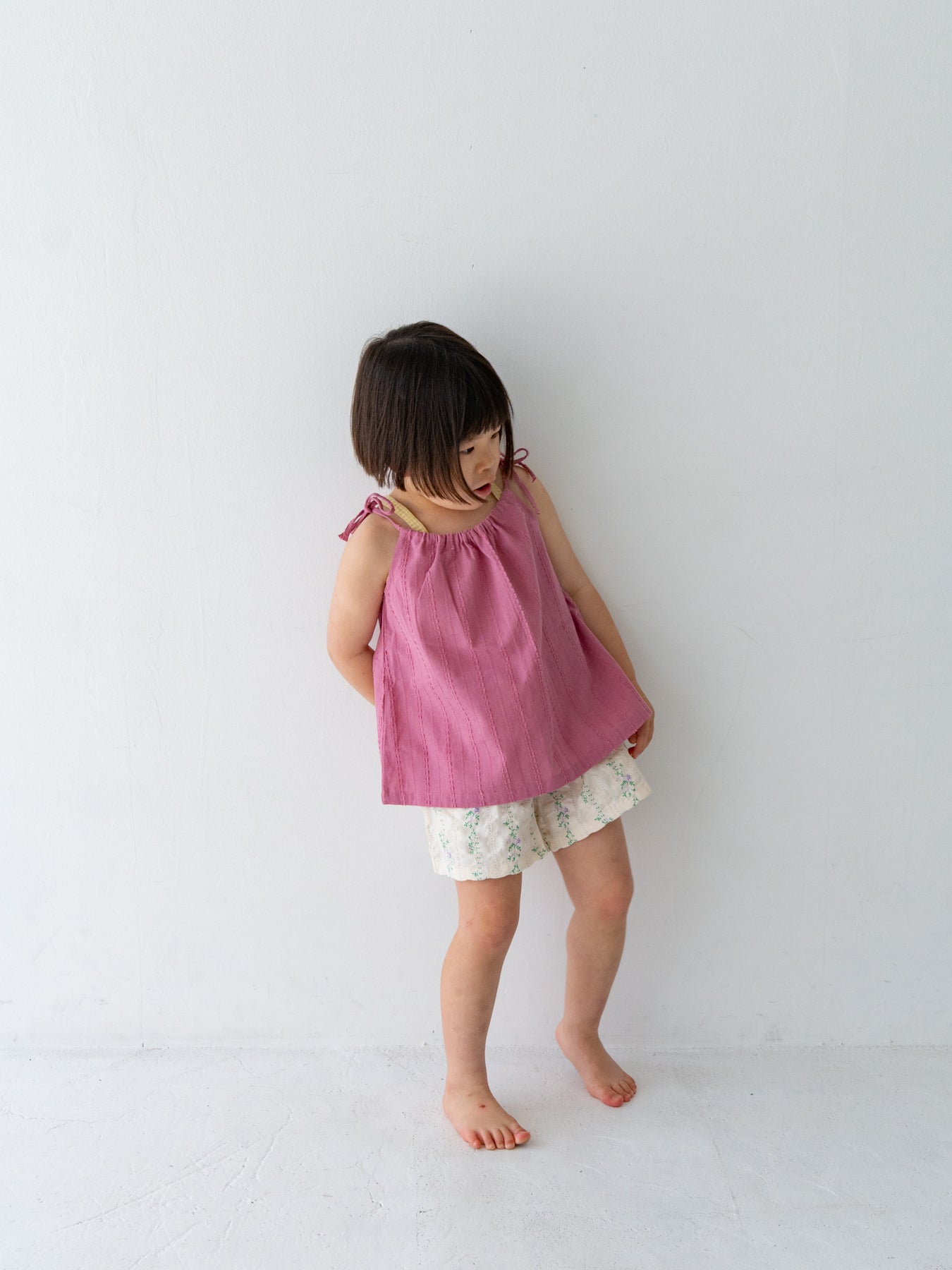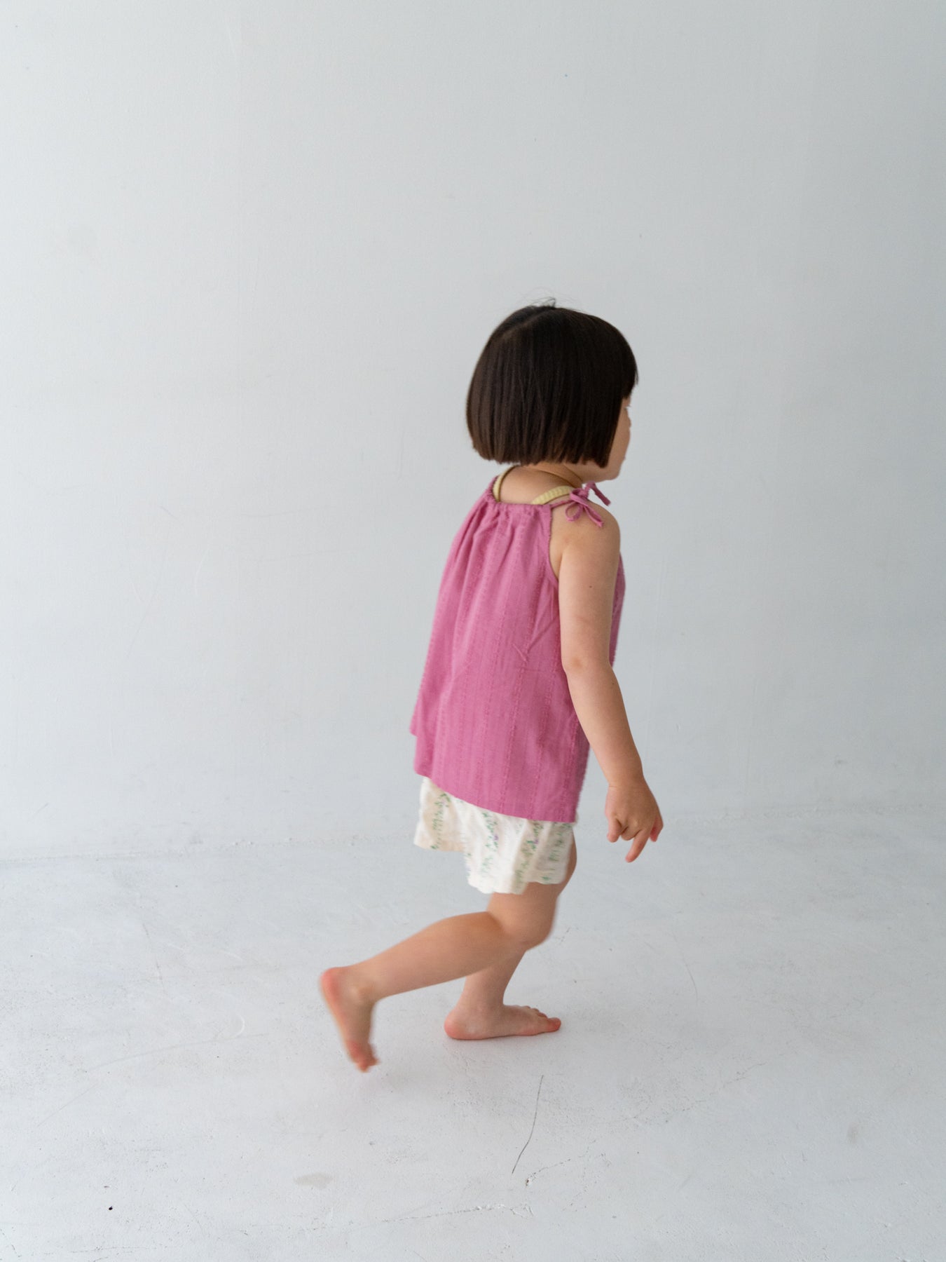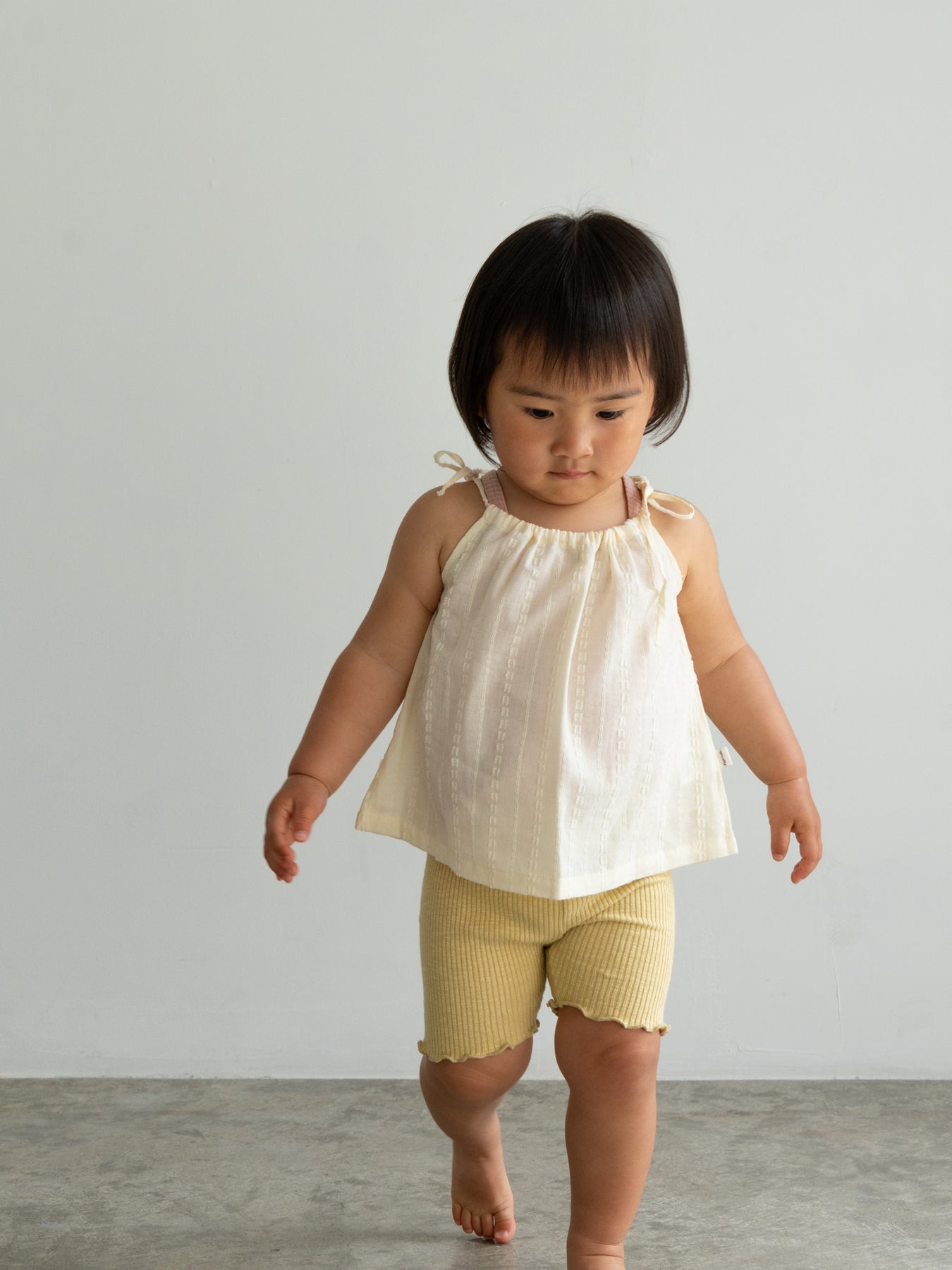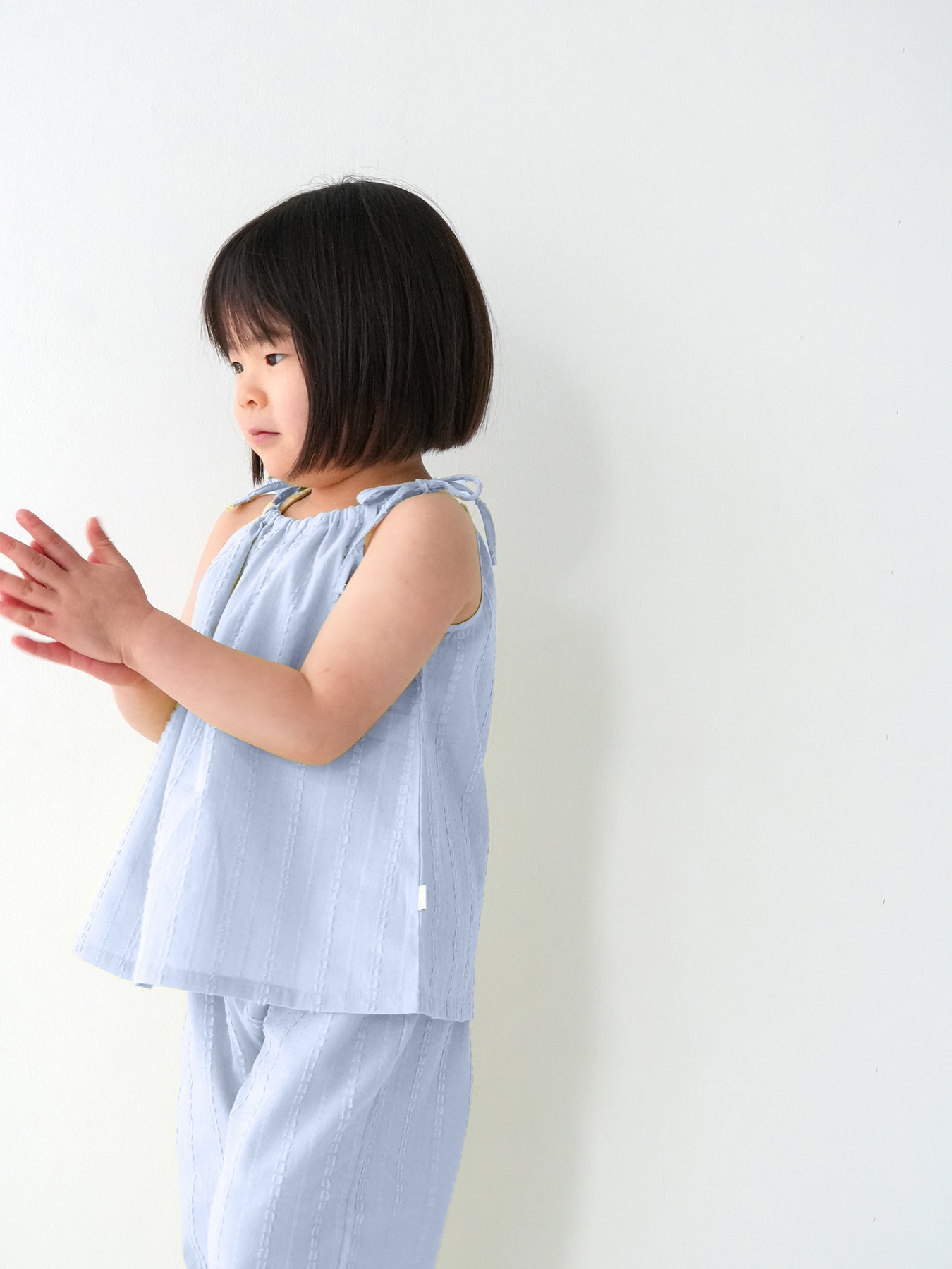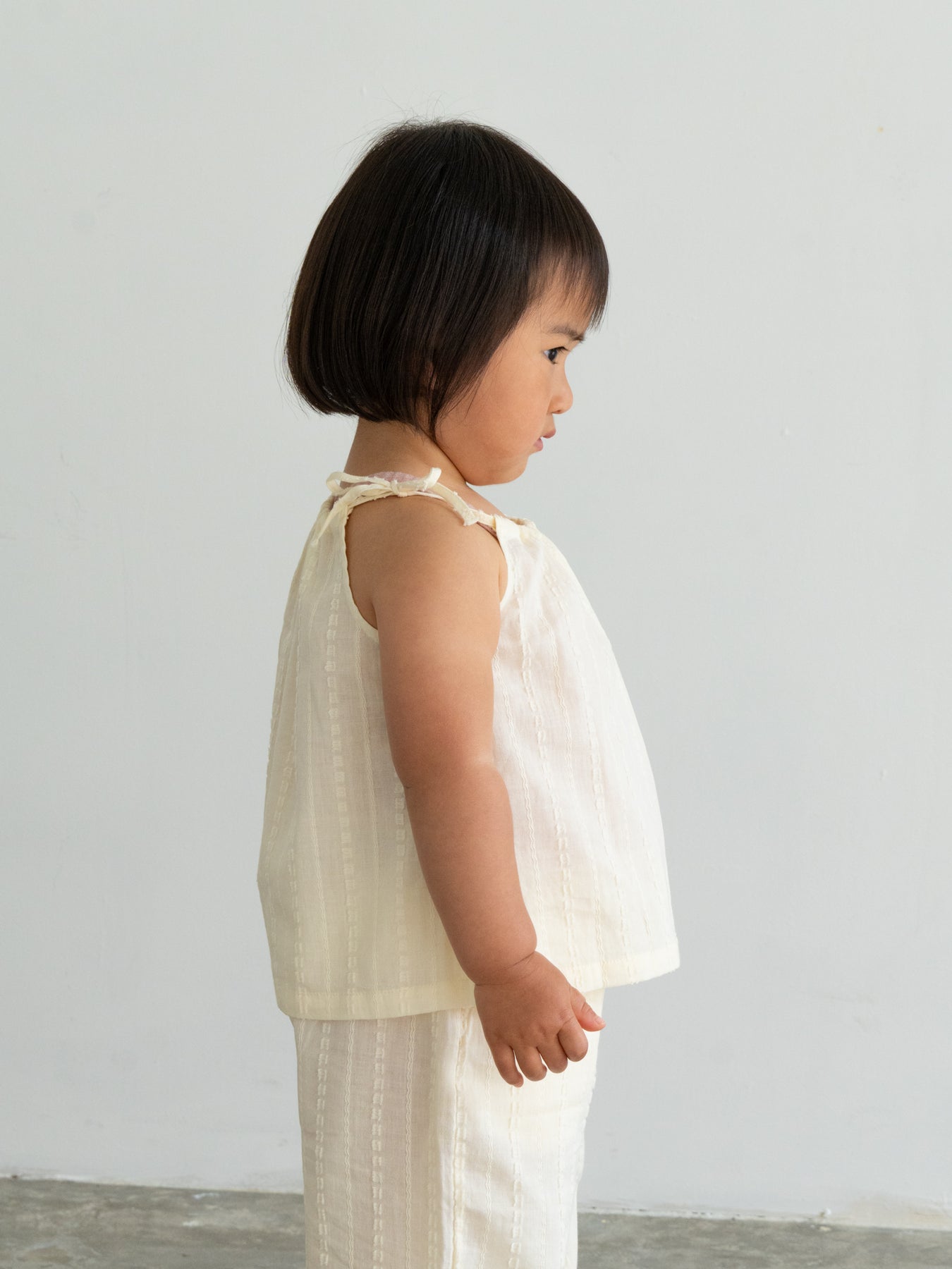 華奢なショルダーストラップは長さ調整が可能なので、成長に合わせて長くご愛用いただけます。暑い日は一枚でさらりと、肌寒い日はTシャツの上にレイヤードしても可愛い万能デザイン。