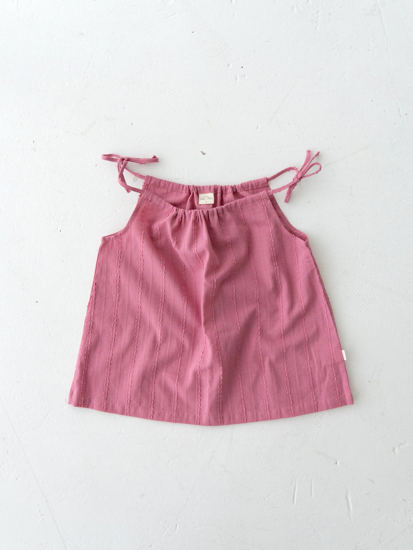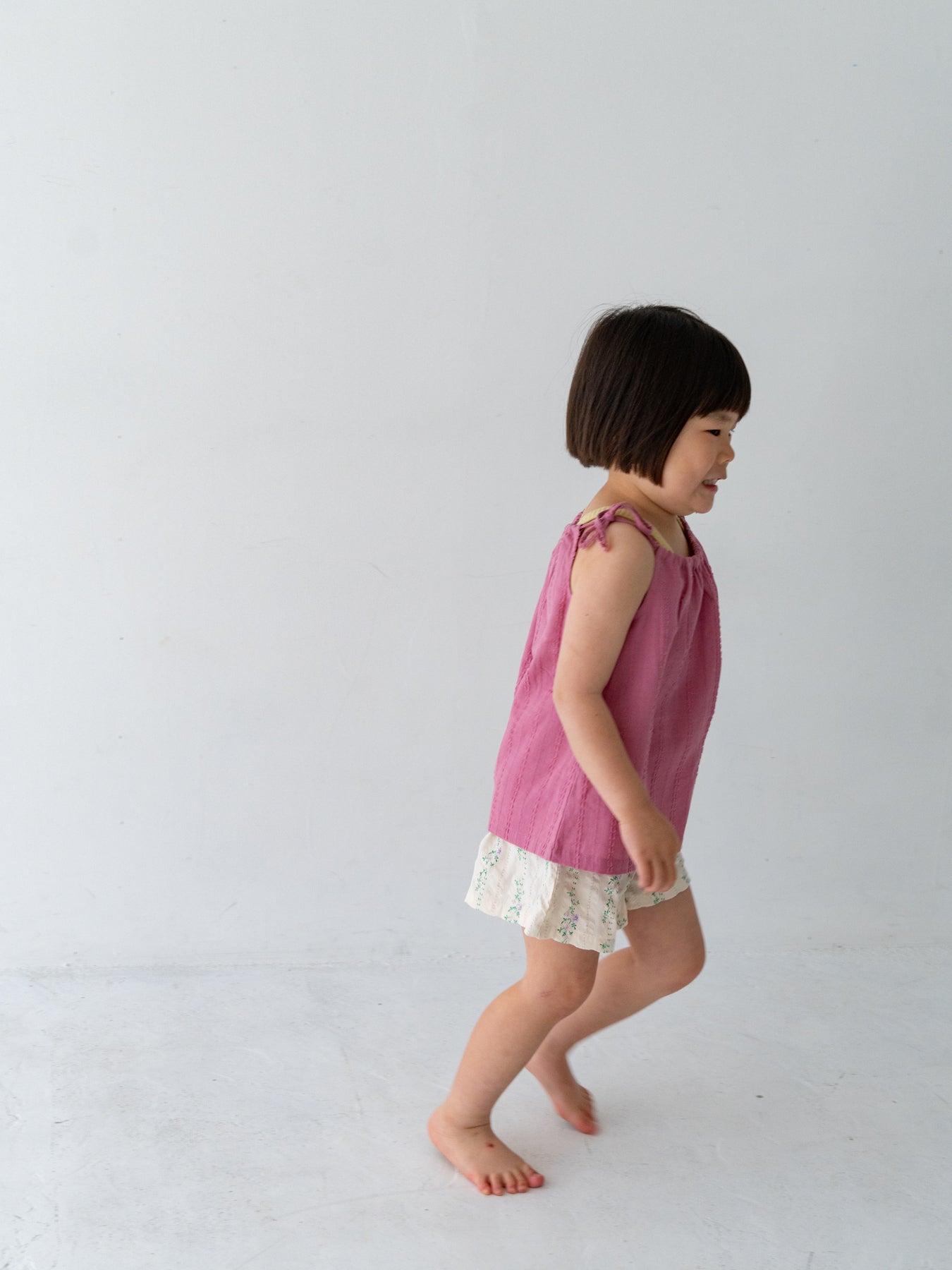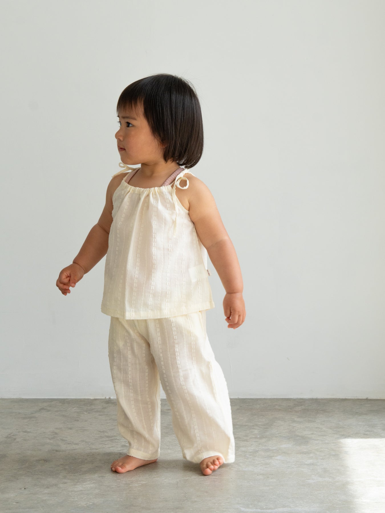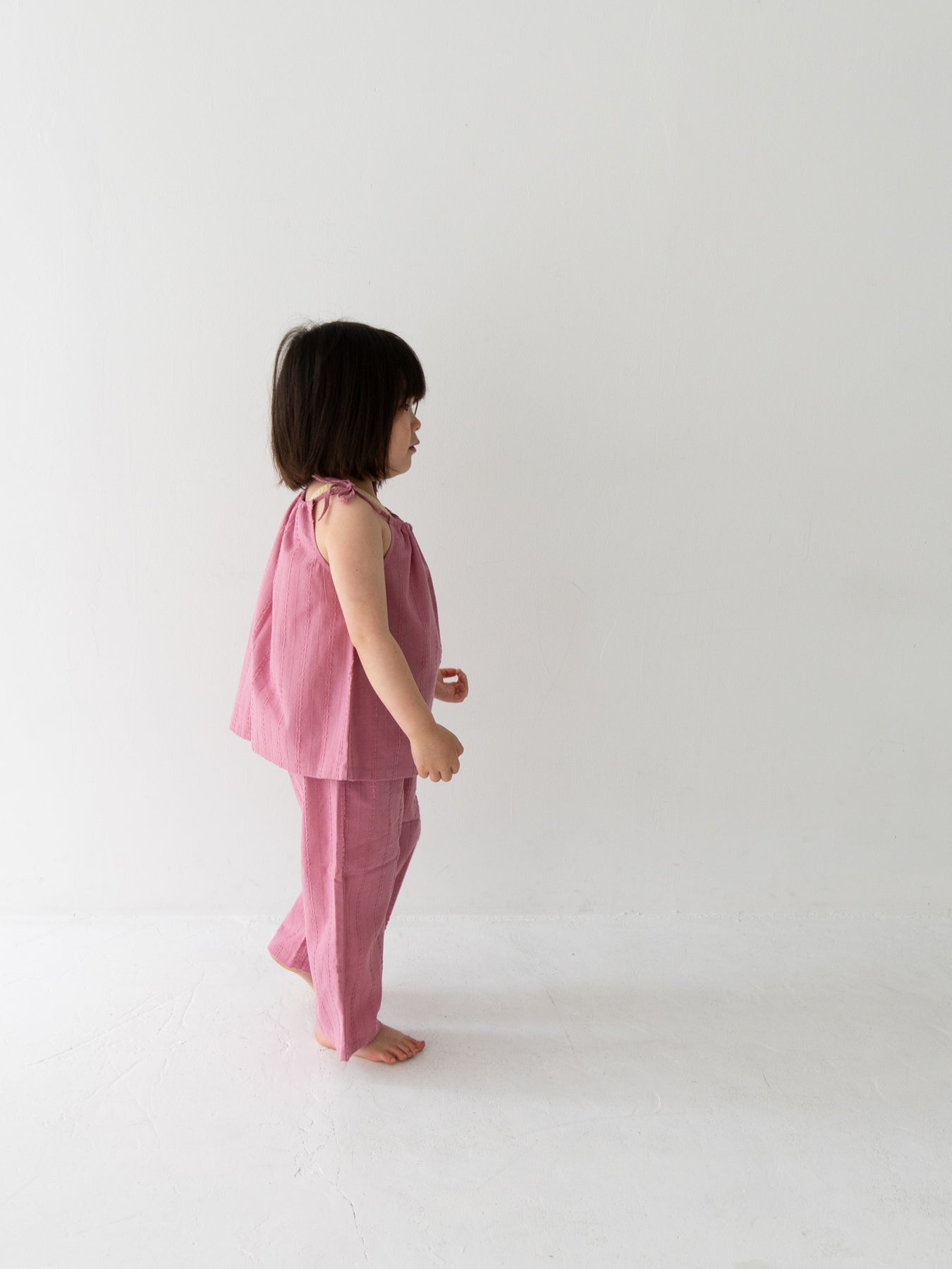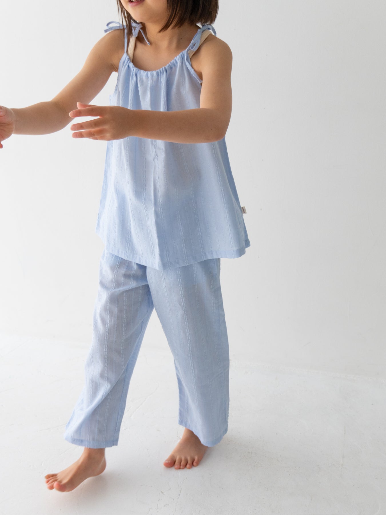 華奢なショルダーストラップは長さ調整が可能なので、成長に合わせて長くご愛用いただけます。暑い日は一枚でさらりと、肌寒い日はTシャツの上にレイヤードしても可愛い万能デザイン。