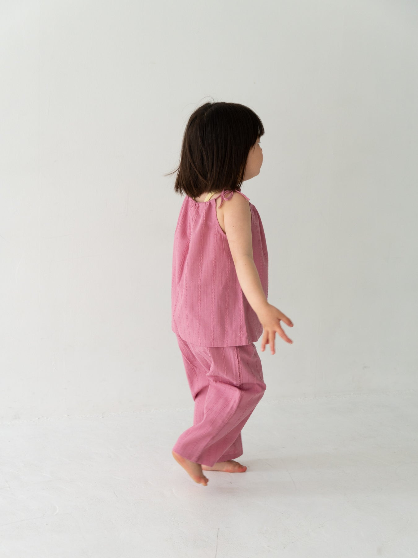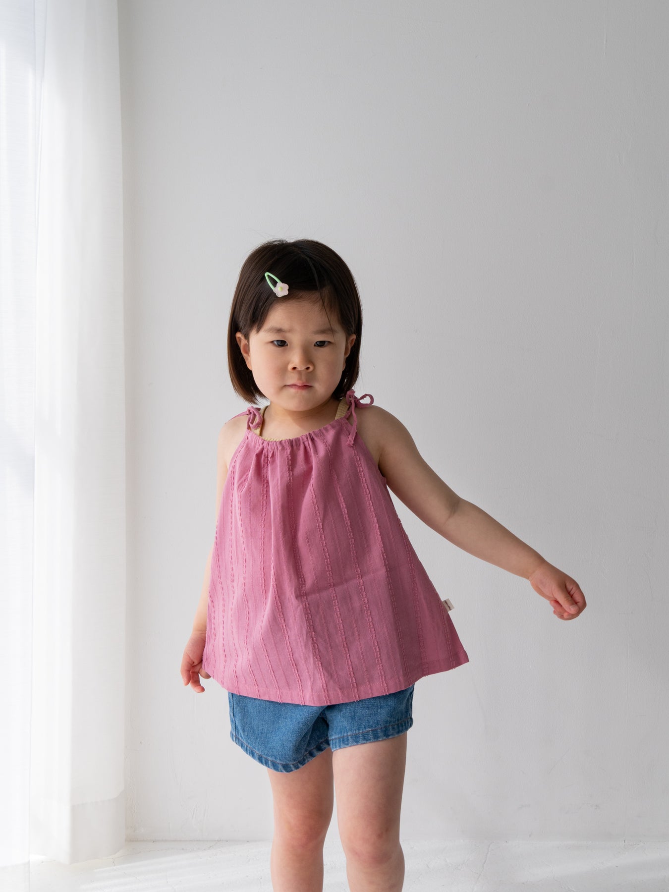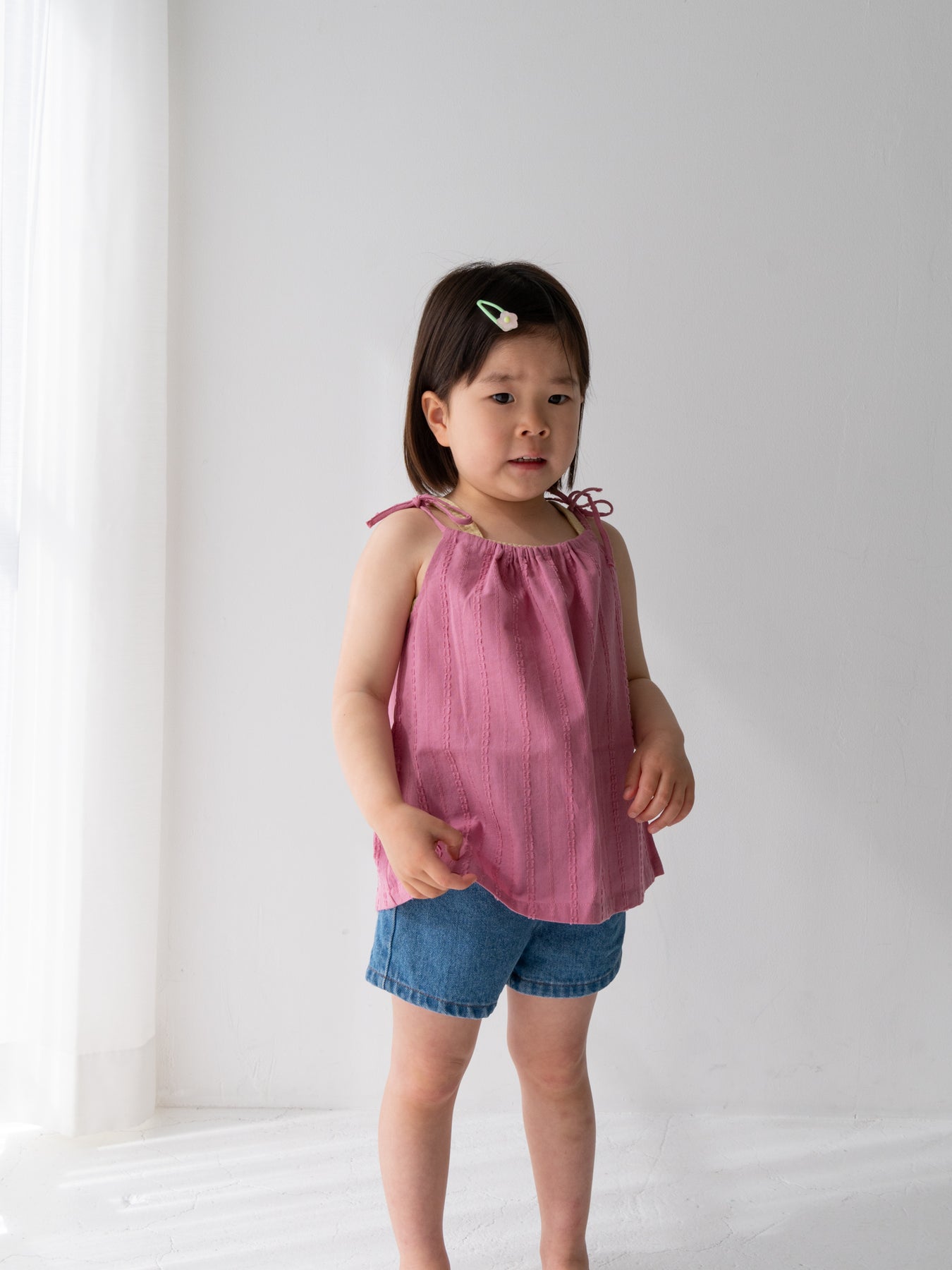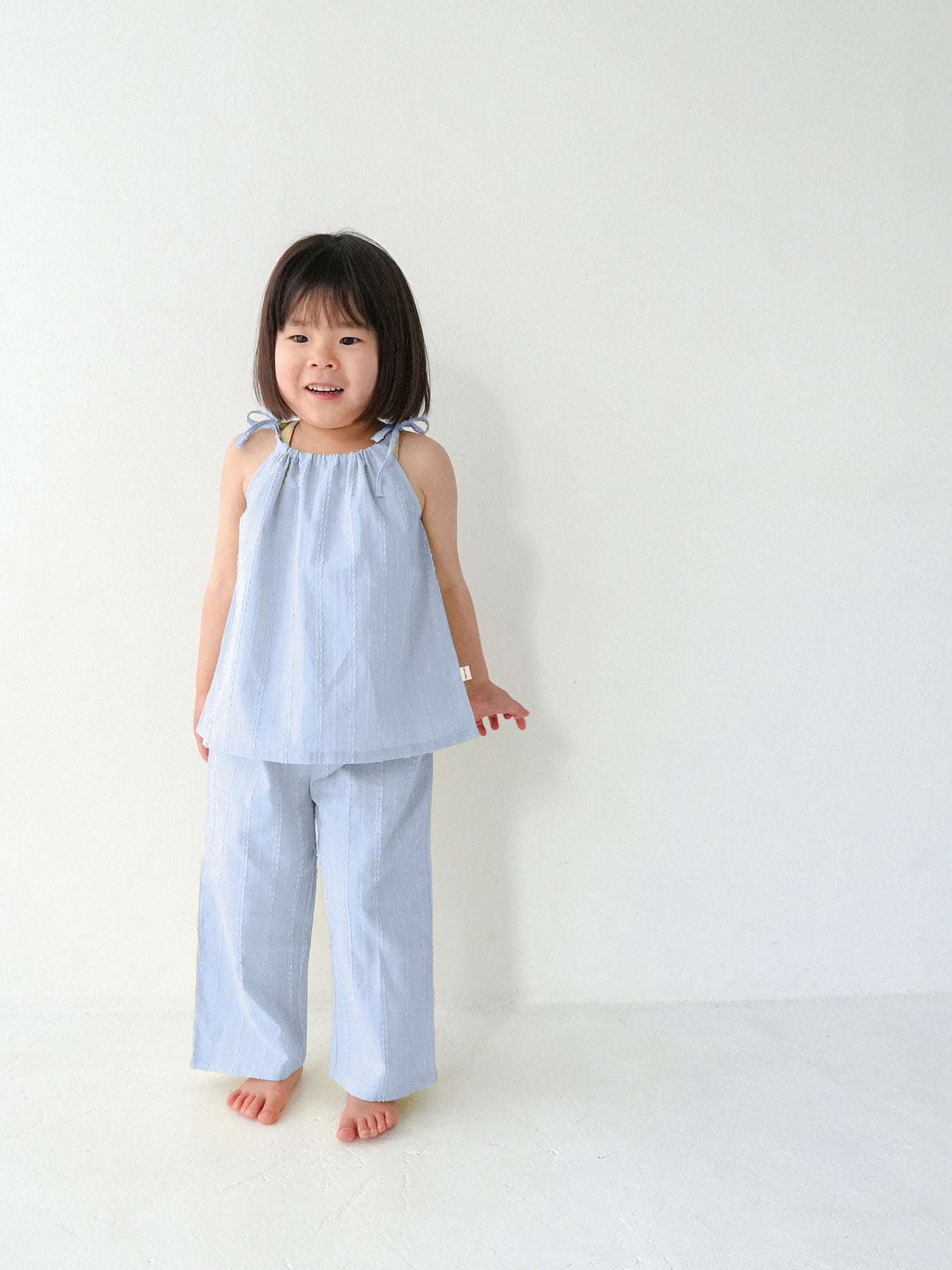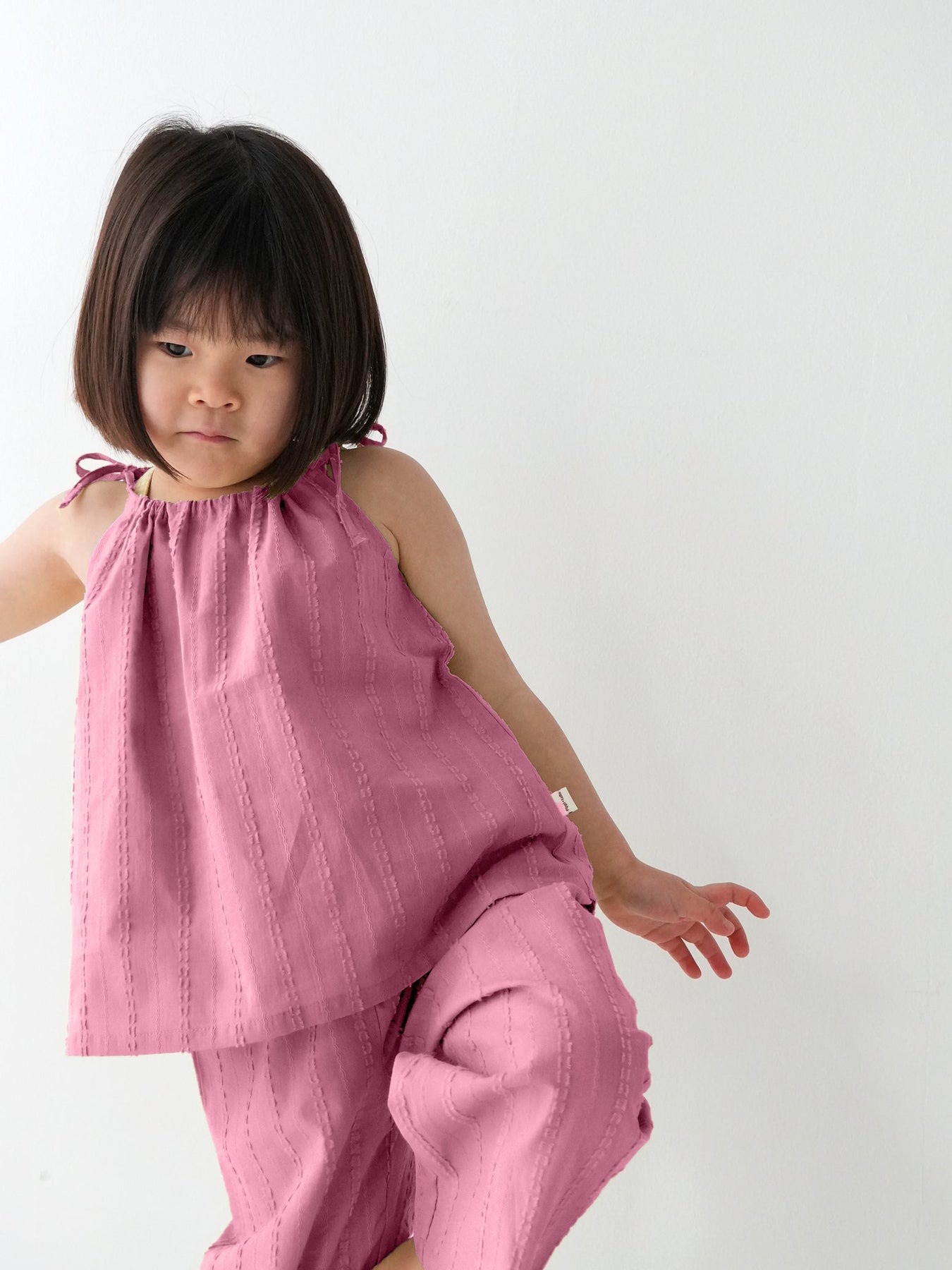 華奢なショルダーストラップは長さ調整が可能なので、成長に合わせて長くご愛用いただけます。暑い日は一枚でさらりと、肌寒い日はTシャツの上にレイヤードしても可愛い万能デザイン。