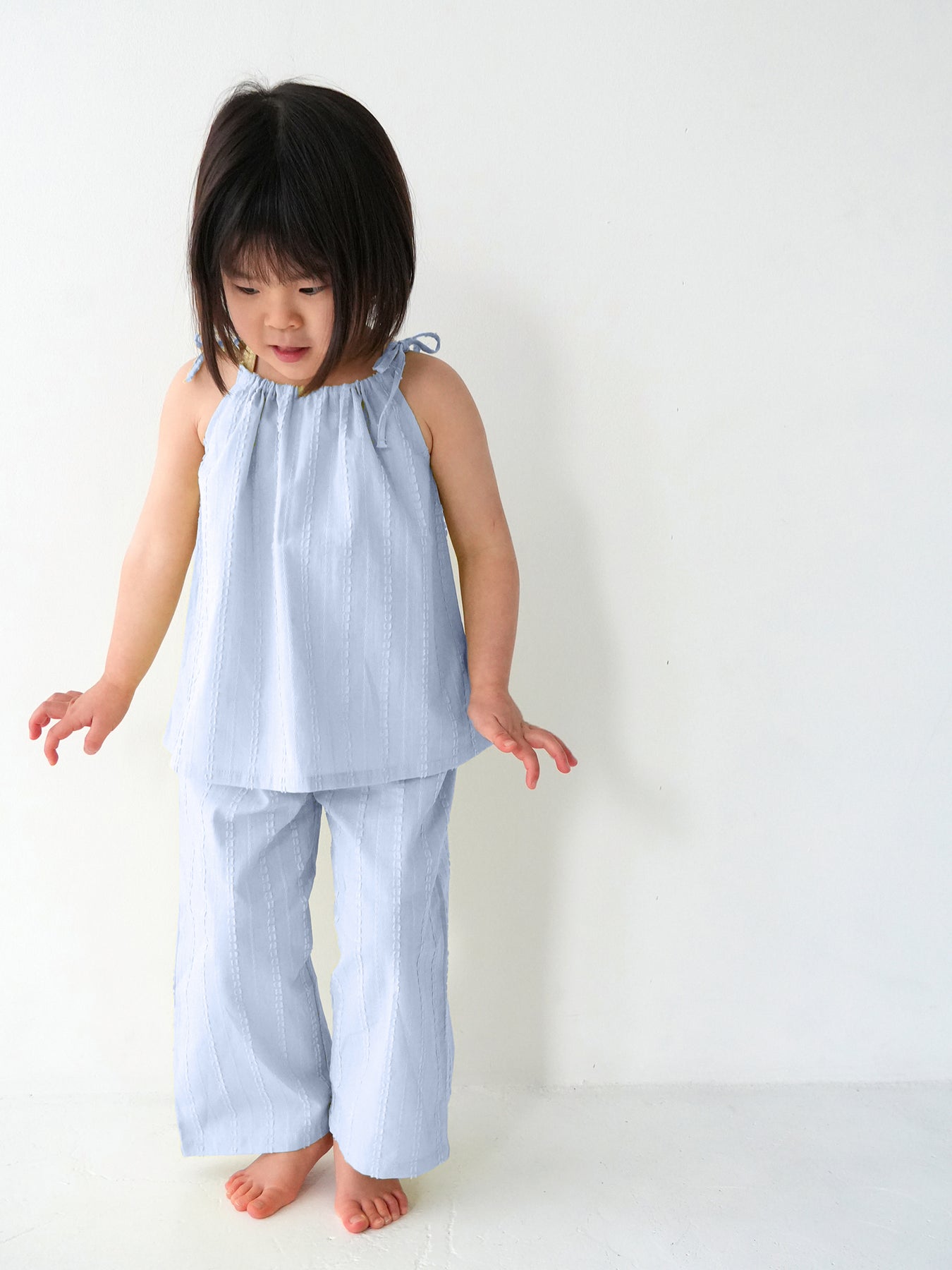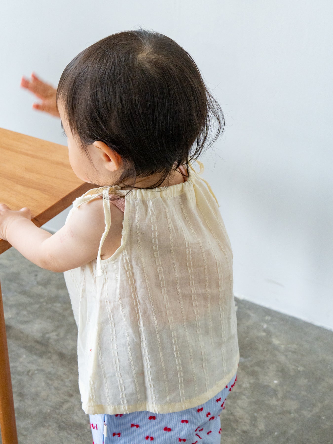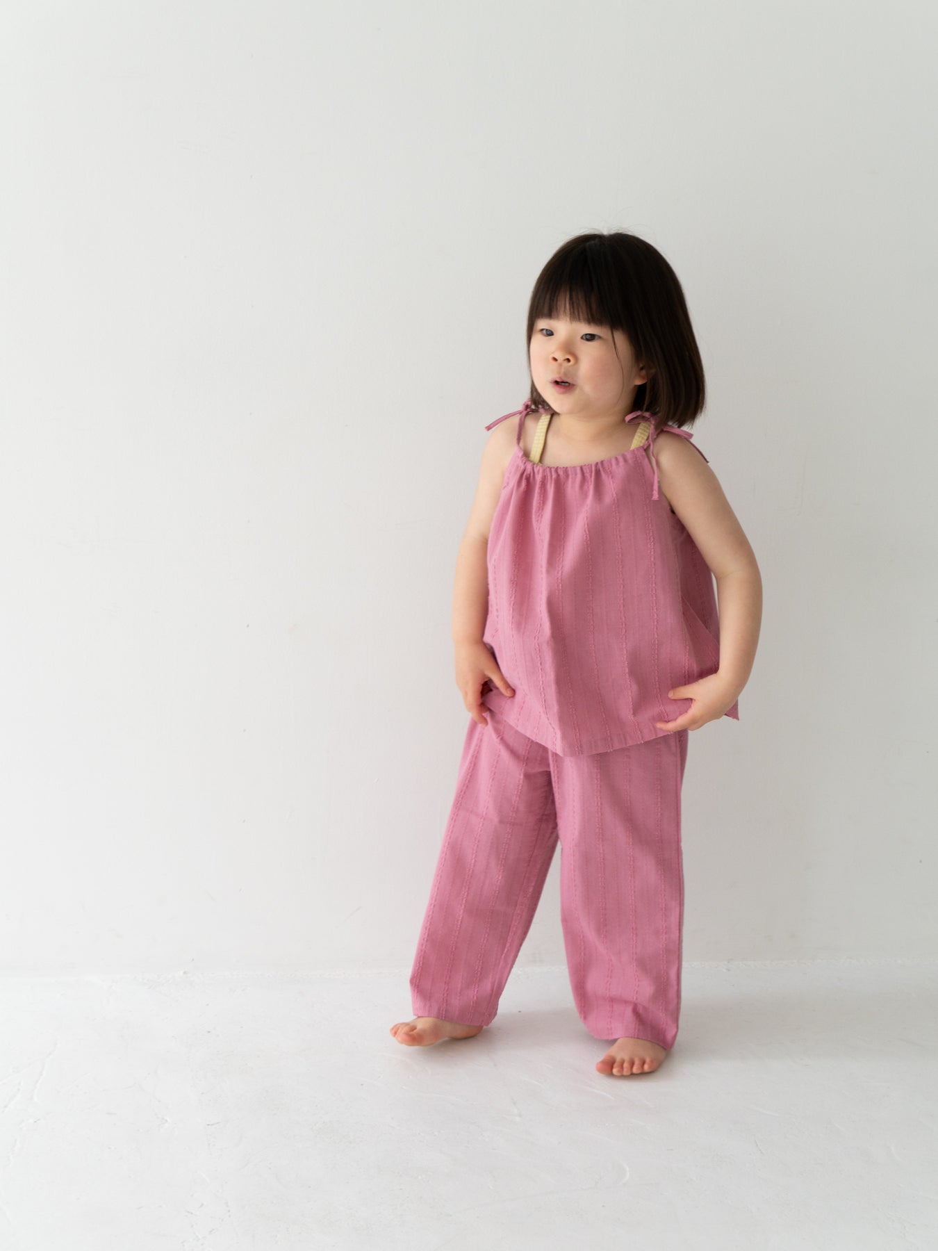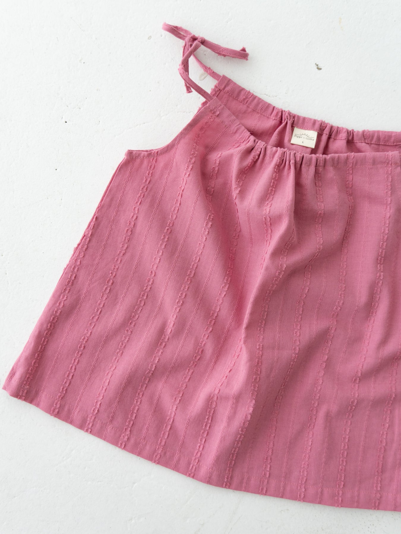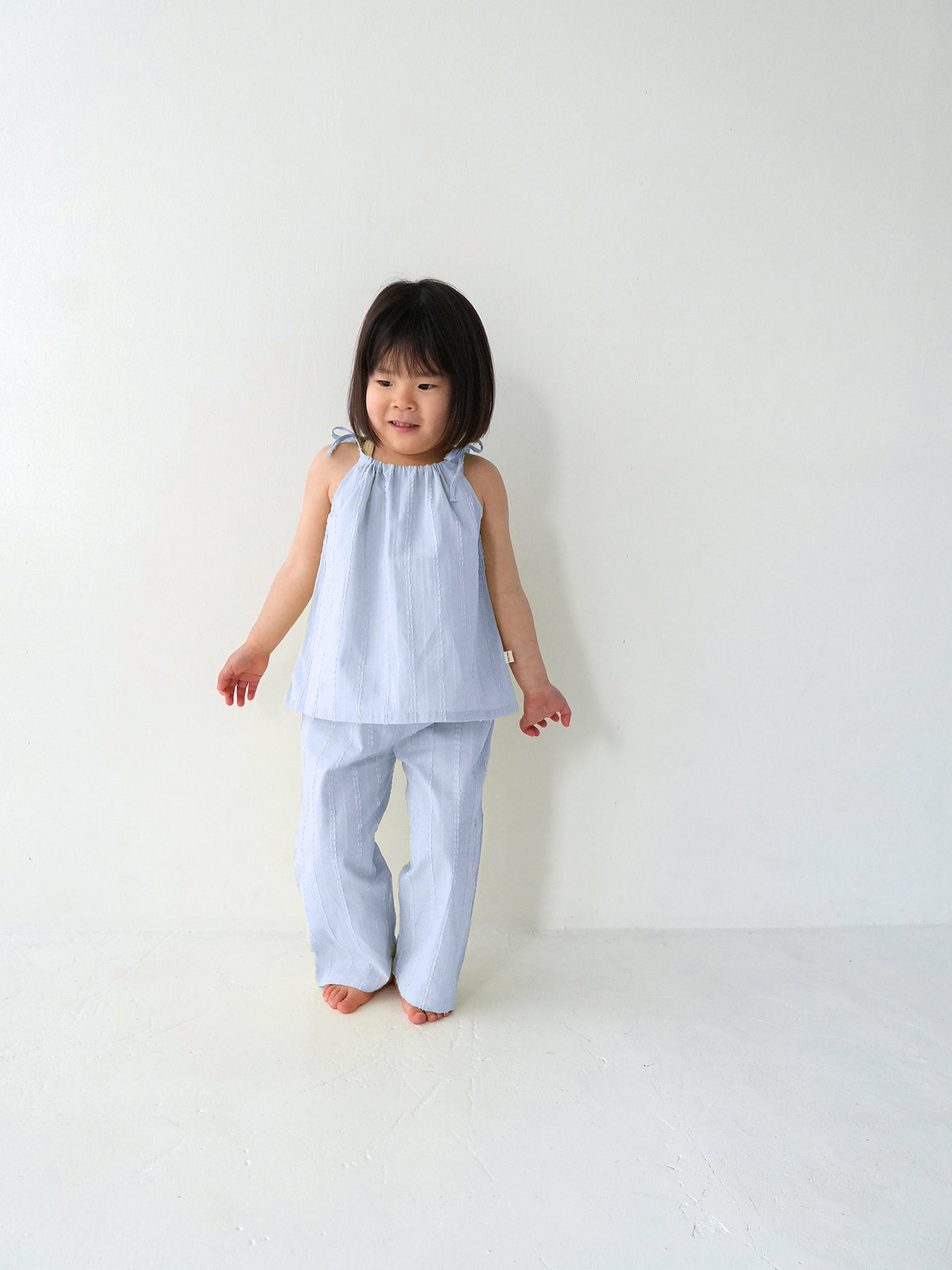 華奢なショルダーストラップは長さ調整が可能なので、成長に合わせて長くご愛用いただけます。暑い日は一枚でさらりと、肌寒い日はTシャツの上にレイヤードしても可愛い万能デザイン。