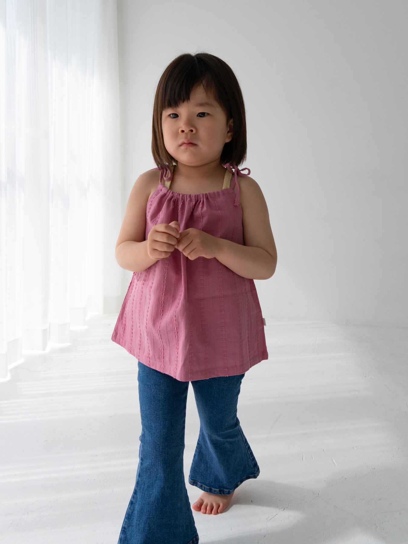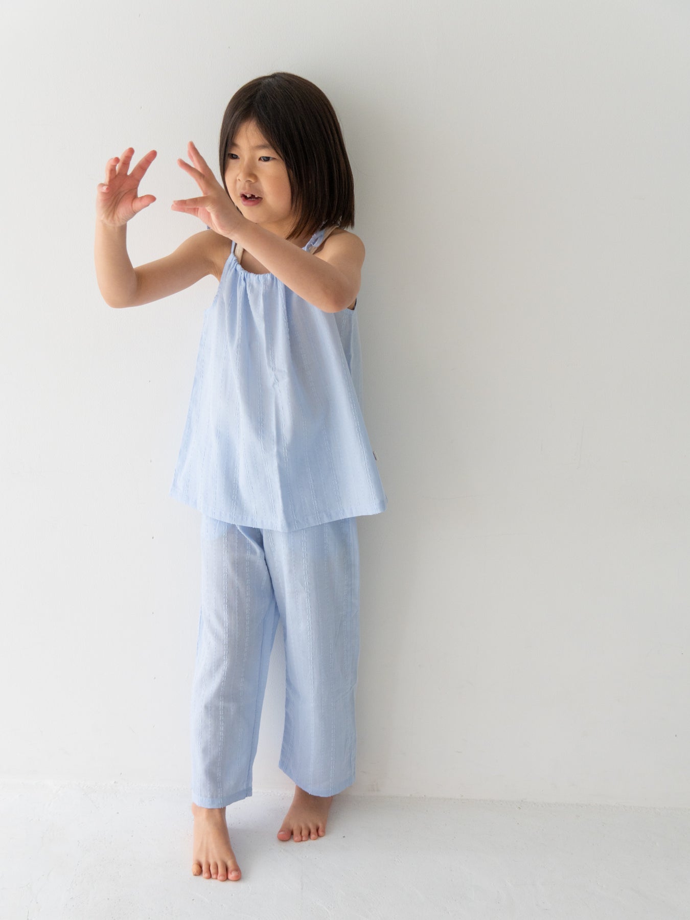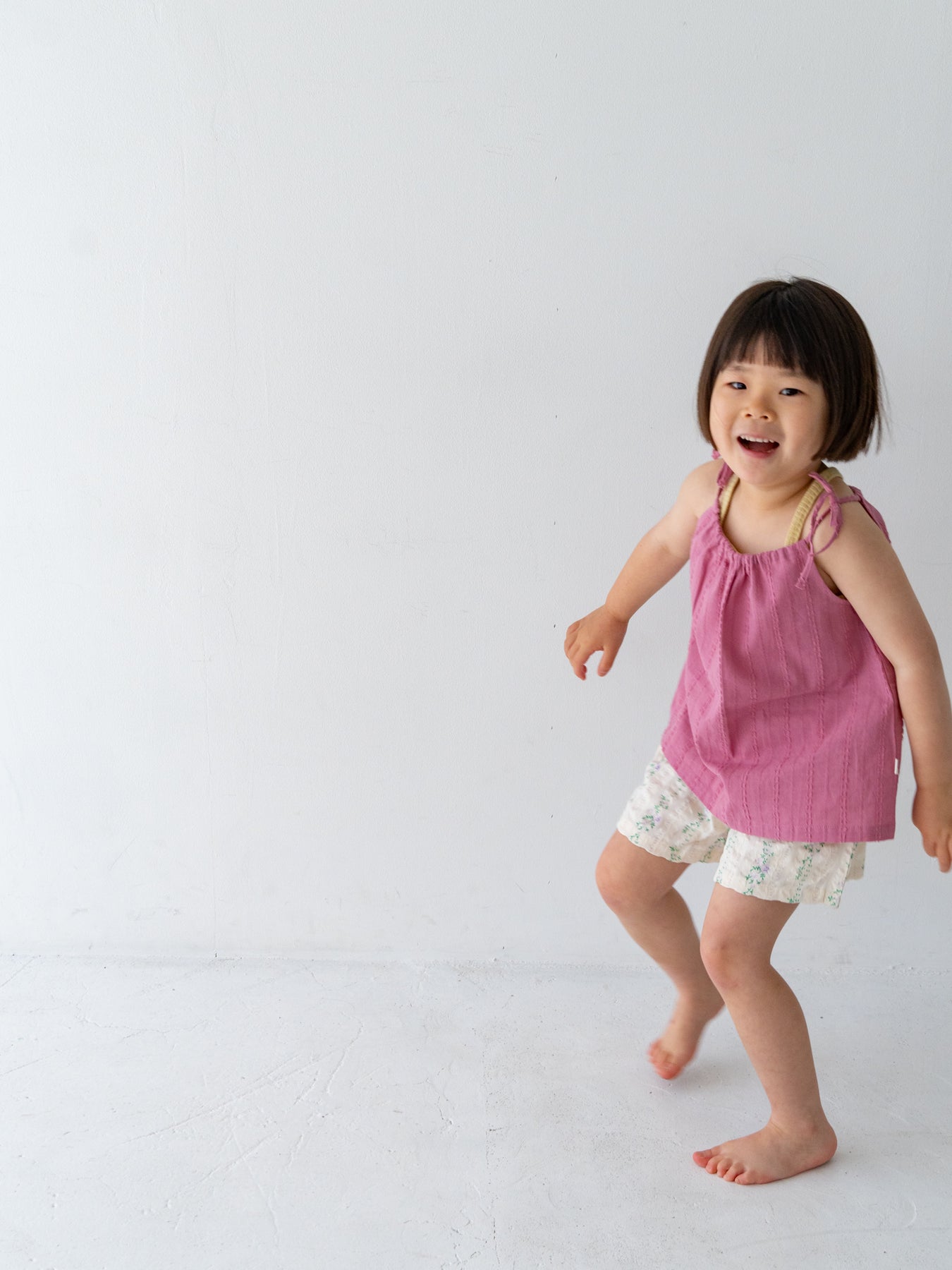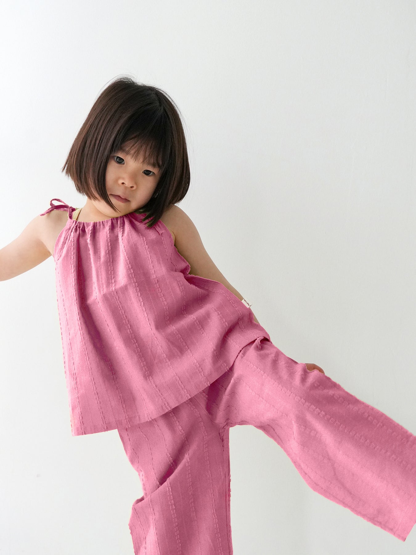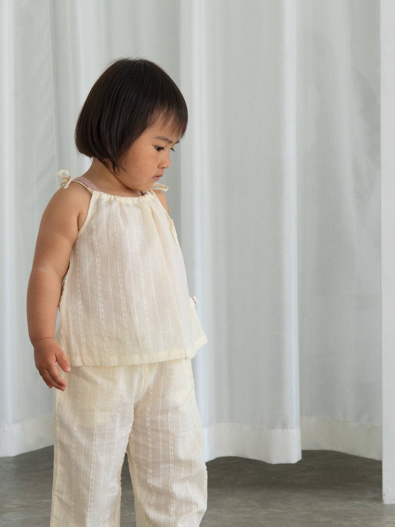 華奢なショルダーストラップは長さ調整が可能なので、成長に合わせて長くご愛用いただけます。暑い日は一枚でさらりと、肌寒い日はTシャツの上にレイヤードしても可愛い万能デザイン。