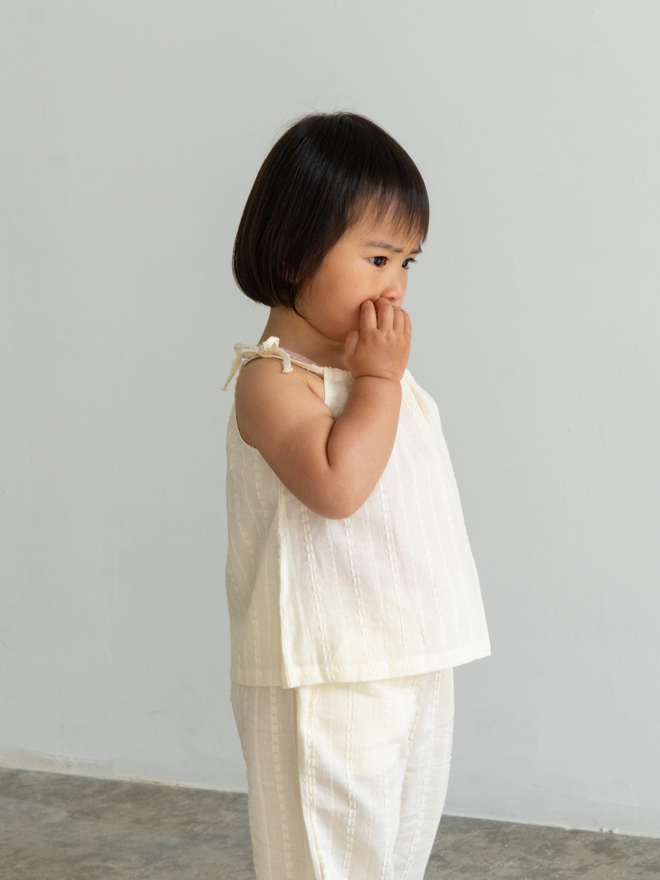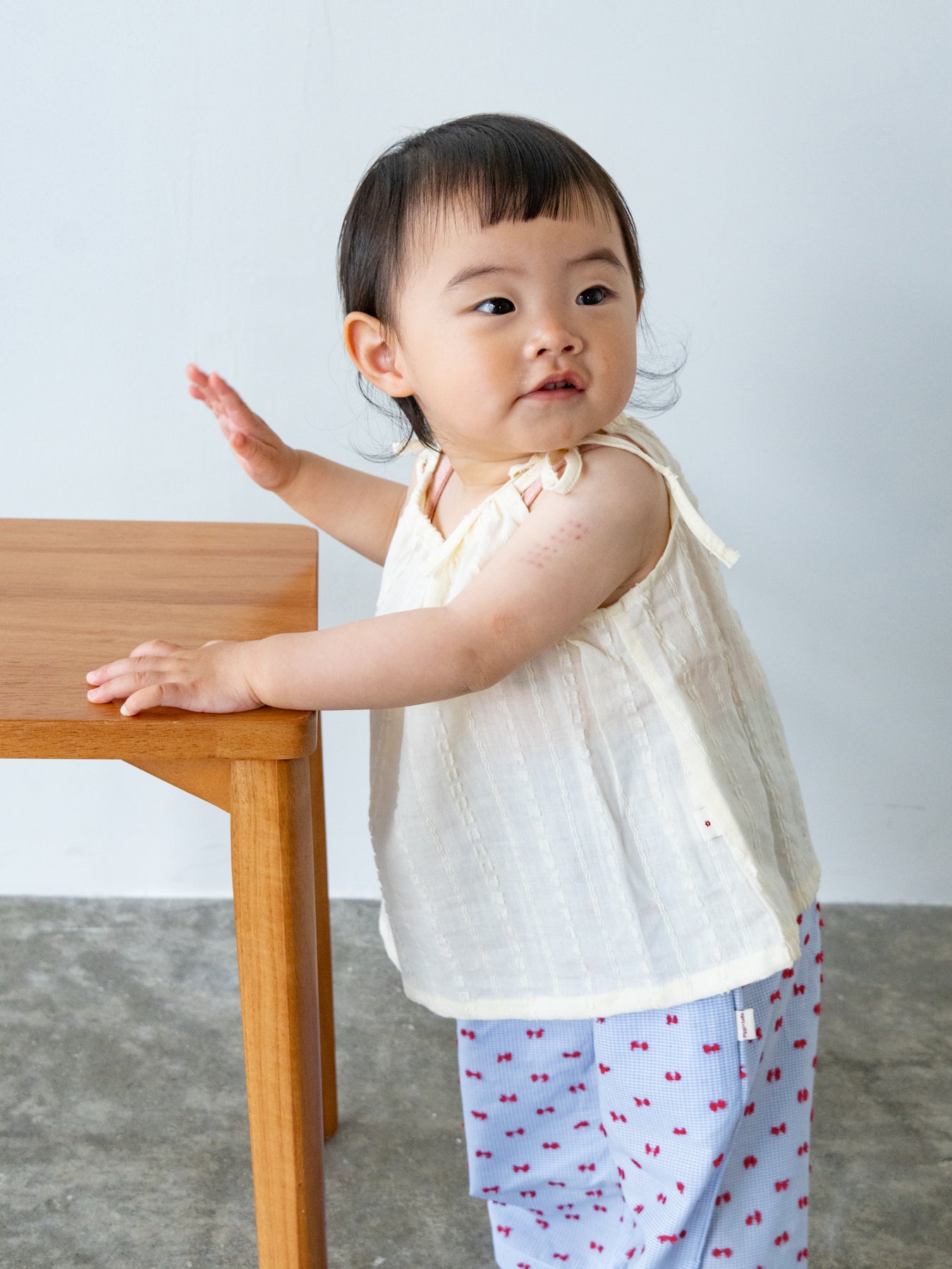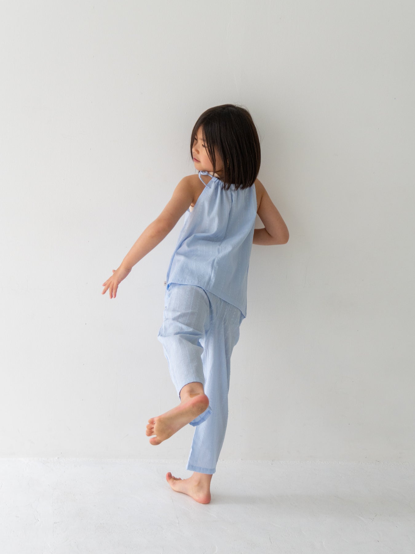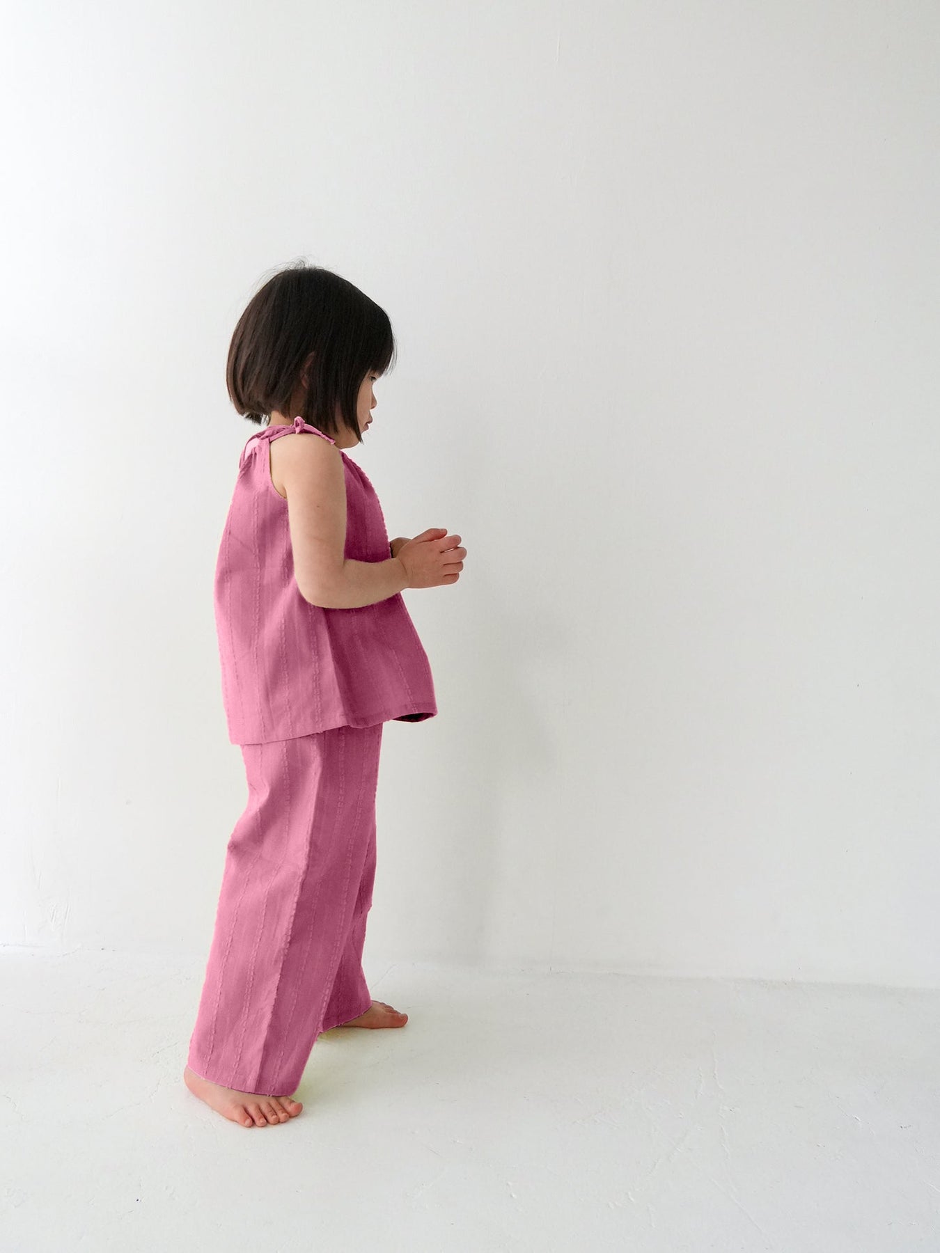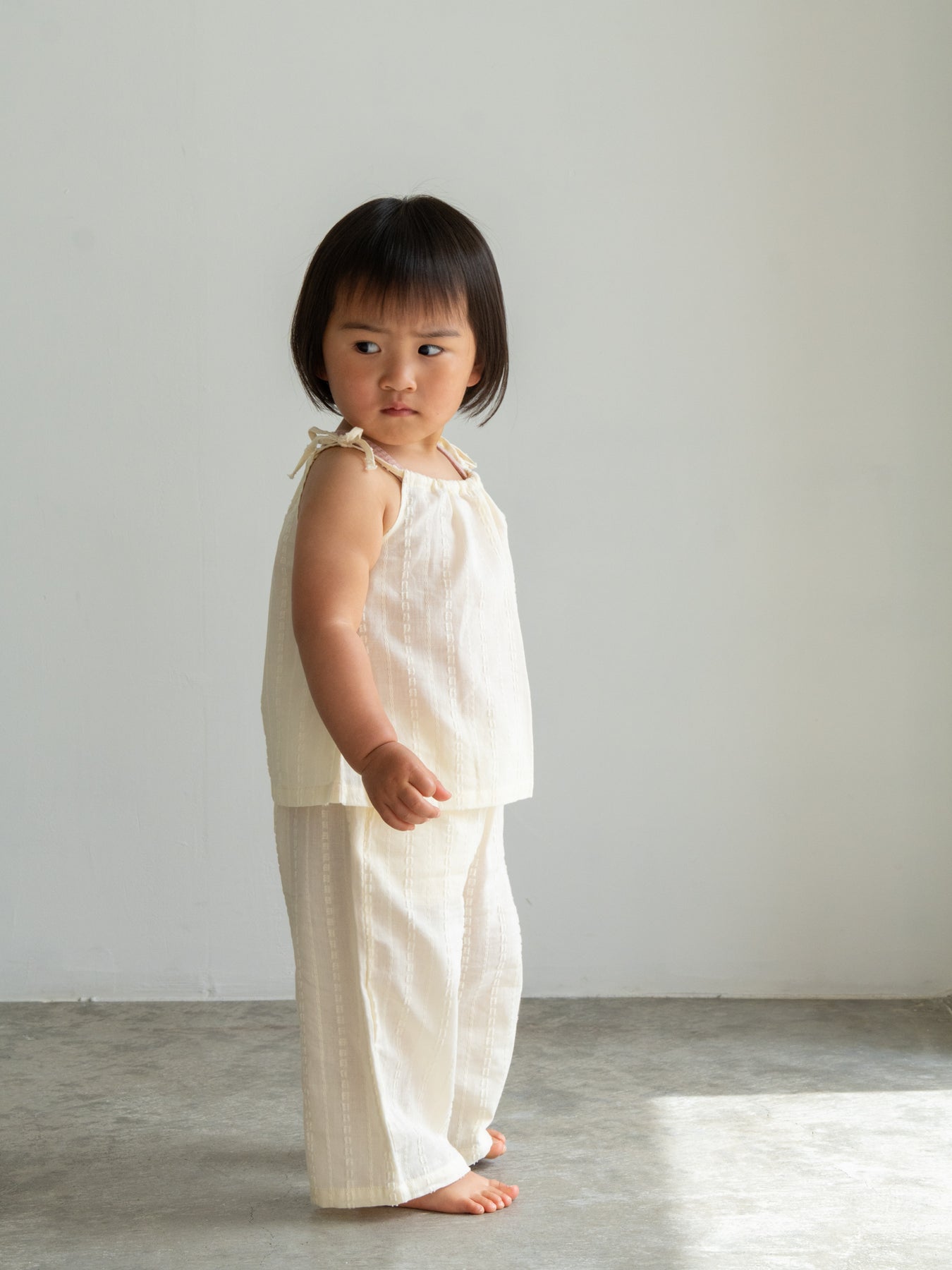華奢なショルダーストラップは長さ調整が可能なので、成長に合わせて長くご愛用いただけます。暑い日は一枚でさらりと、肌寒い日はTシャツの上にレイヤードしても可愛い万能デザイン。