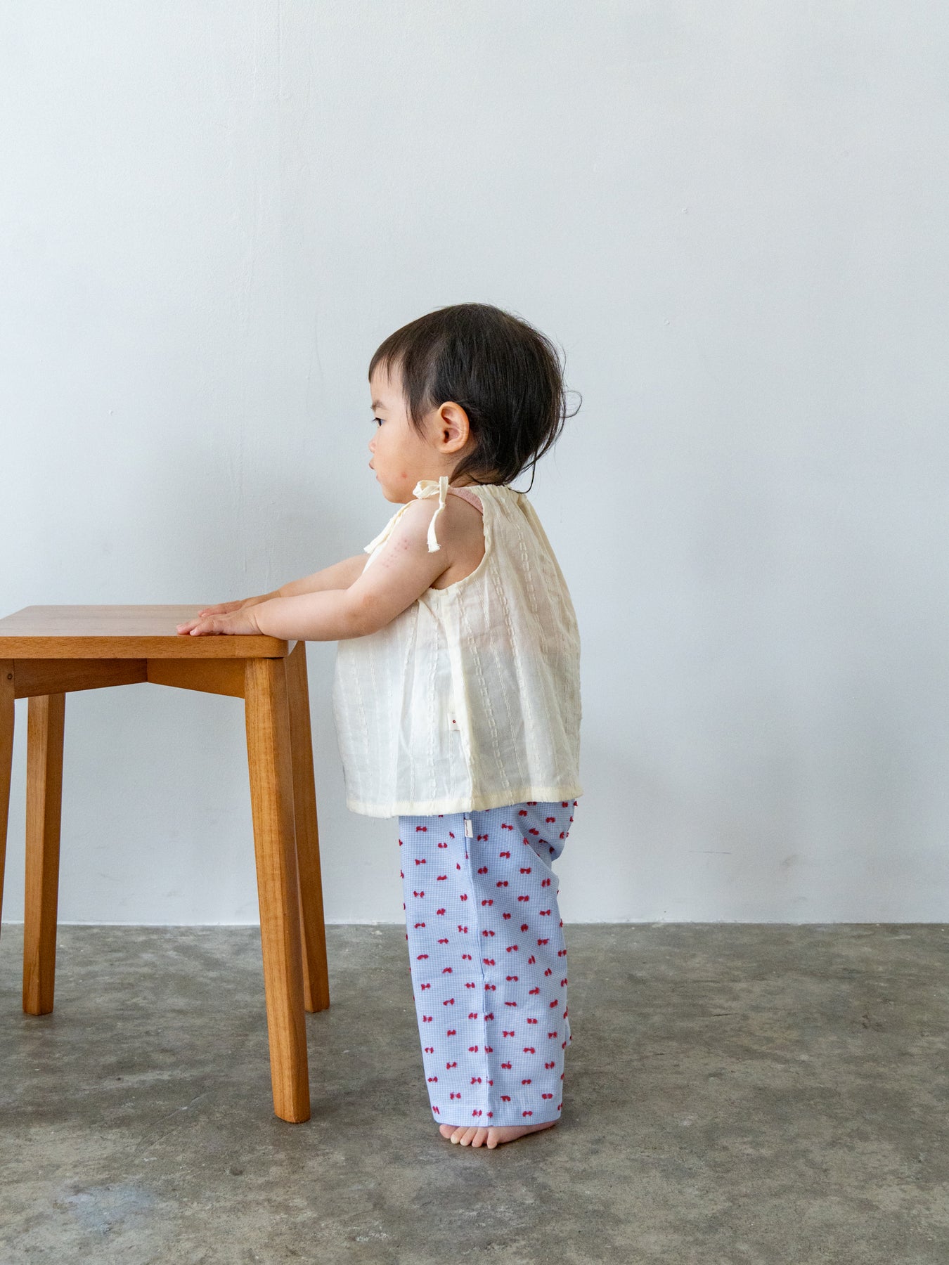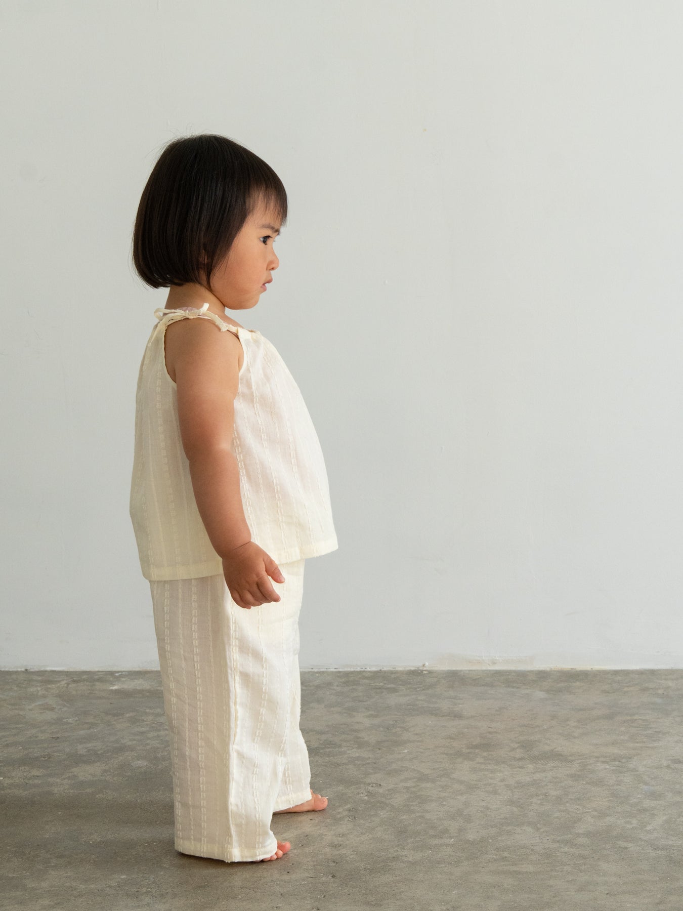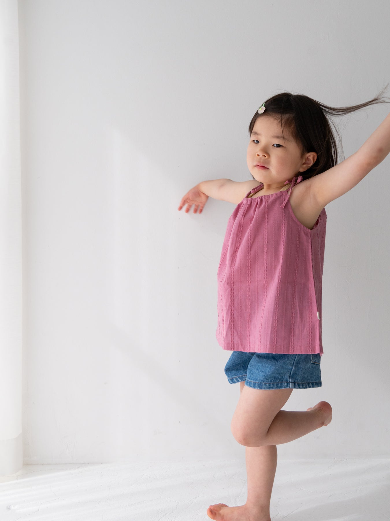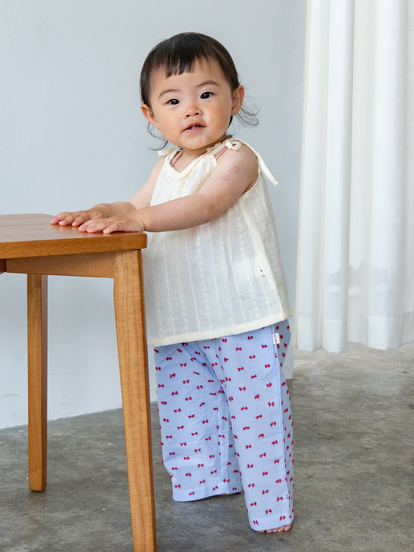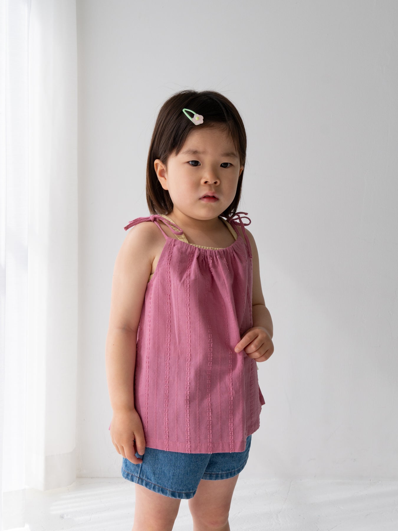 華奢なショルダーストラップは長さ調整が可能なので、成長に合わせて長くご愛用いただけます。暑い日は一枚でさらりと、肌寒い日はTシャツの上にレイヤードしても可愛い万能デザイン。