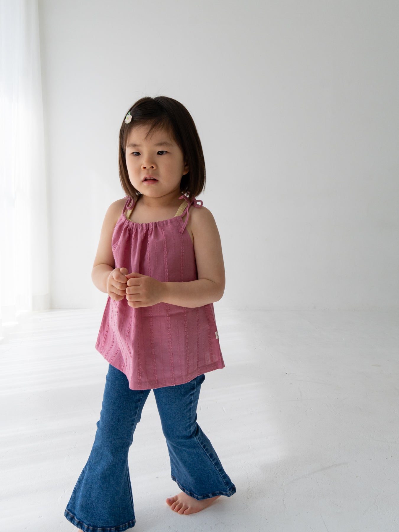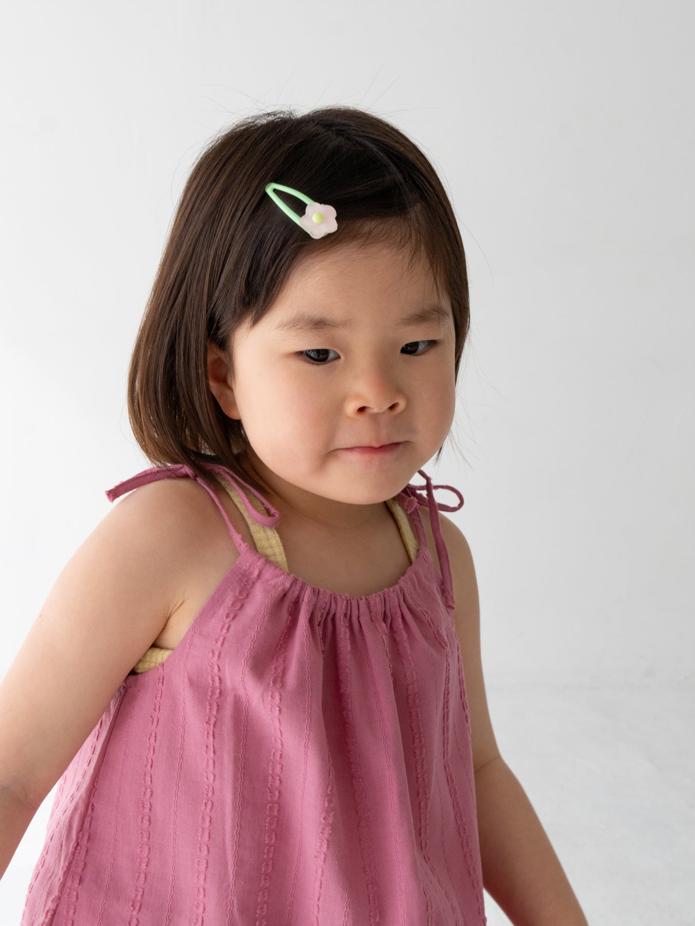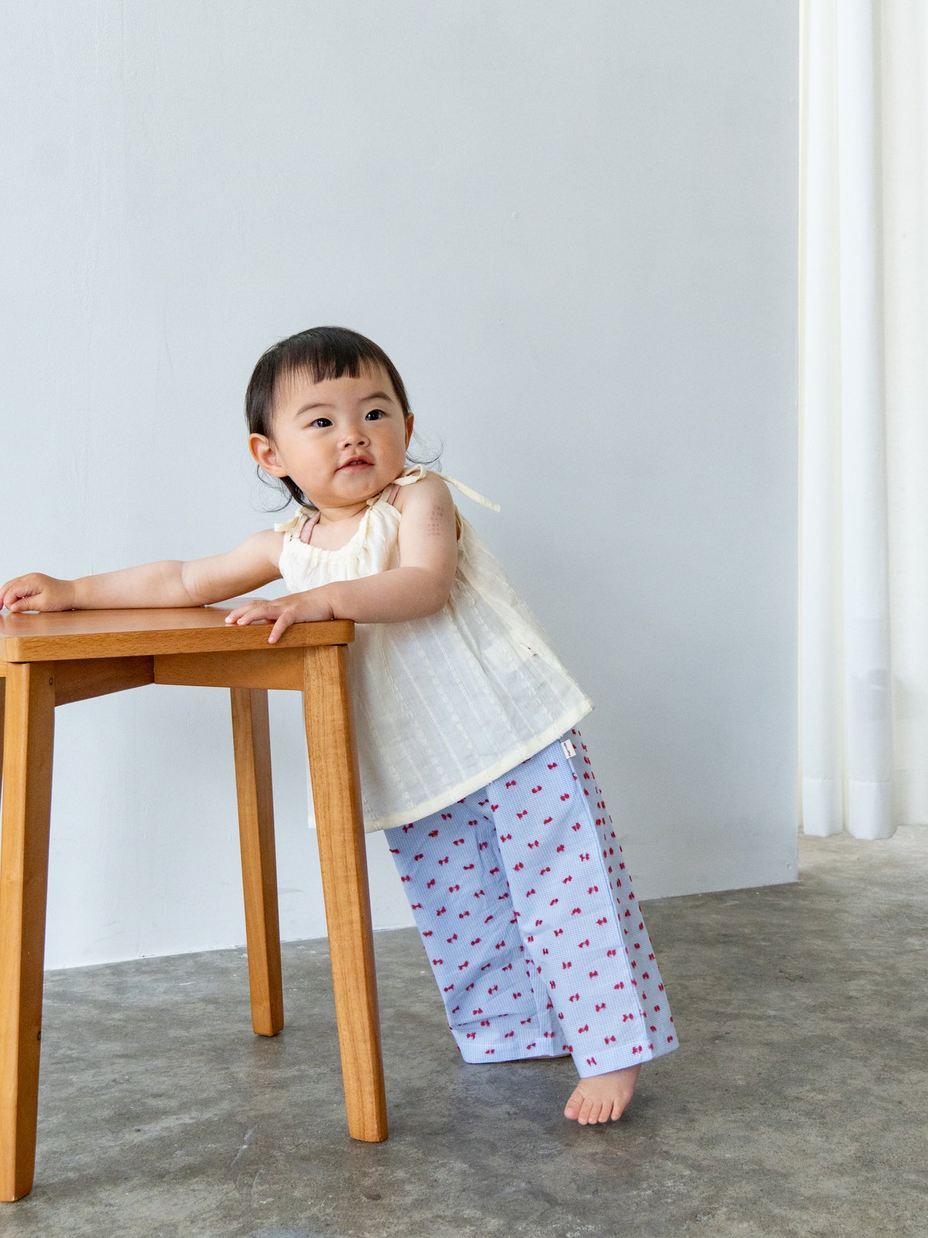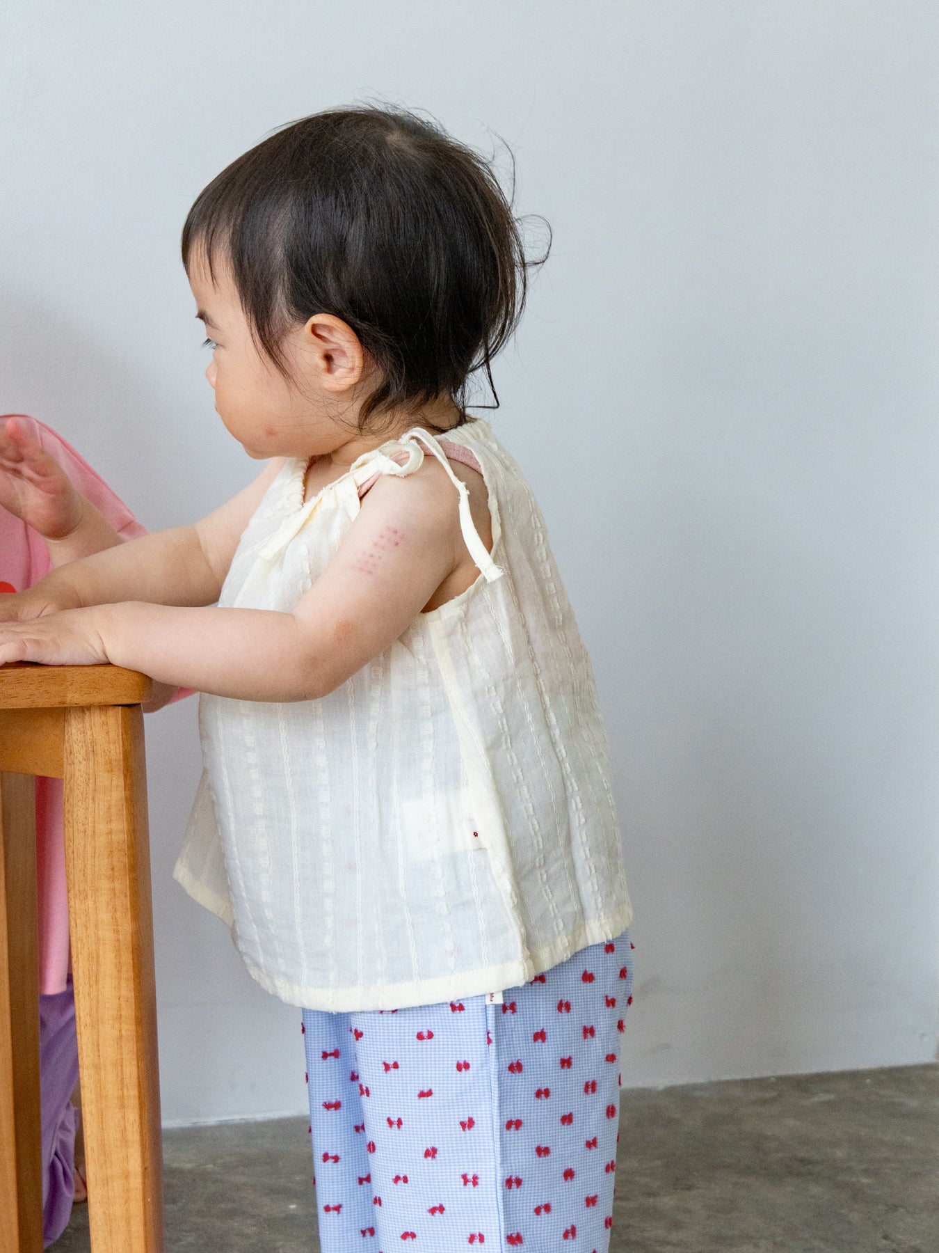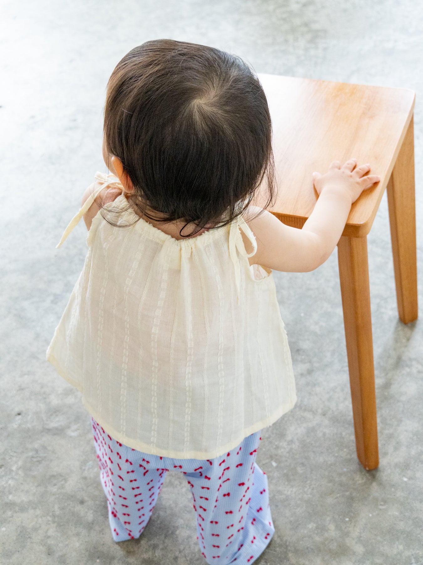 華奢なショルダーストラップは長さ調整が可能なので、成長に合わせて長くご愛用いただけます。暑い日は一枚でさらりと、肌寒い日はTシャツの上にレイヤードしても可愛い万能デザイン。