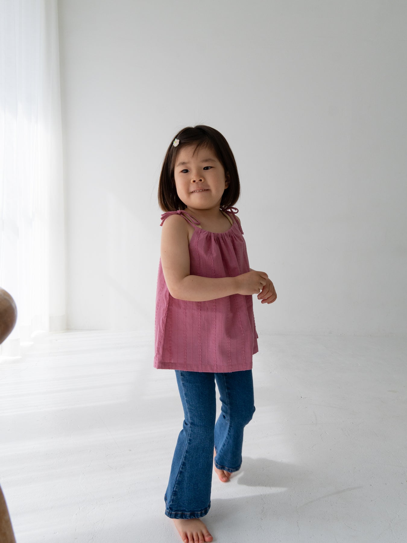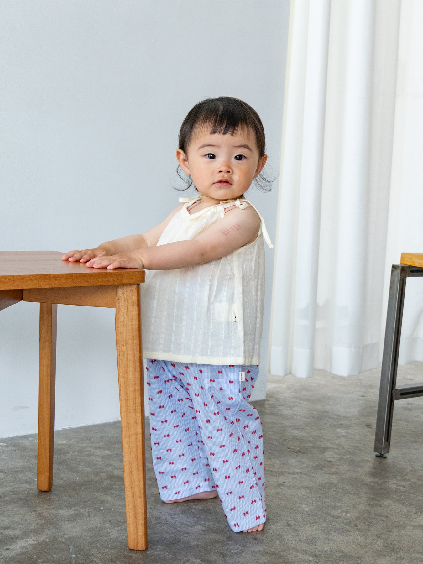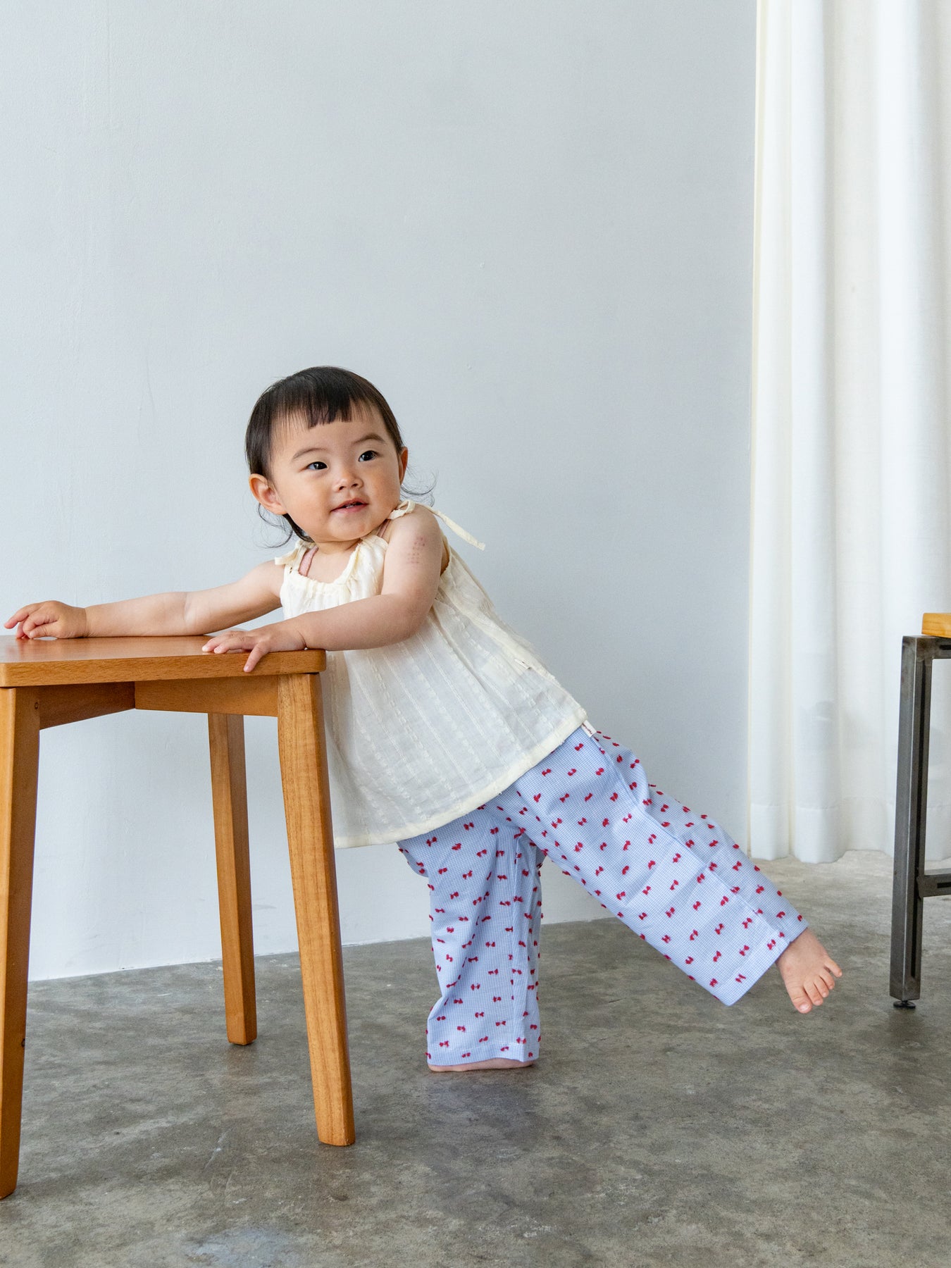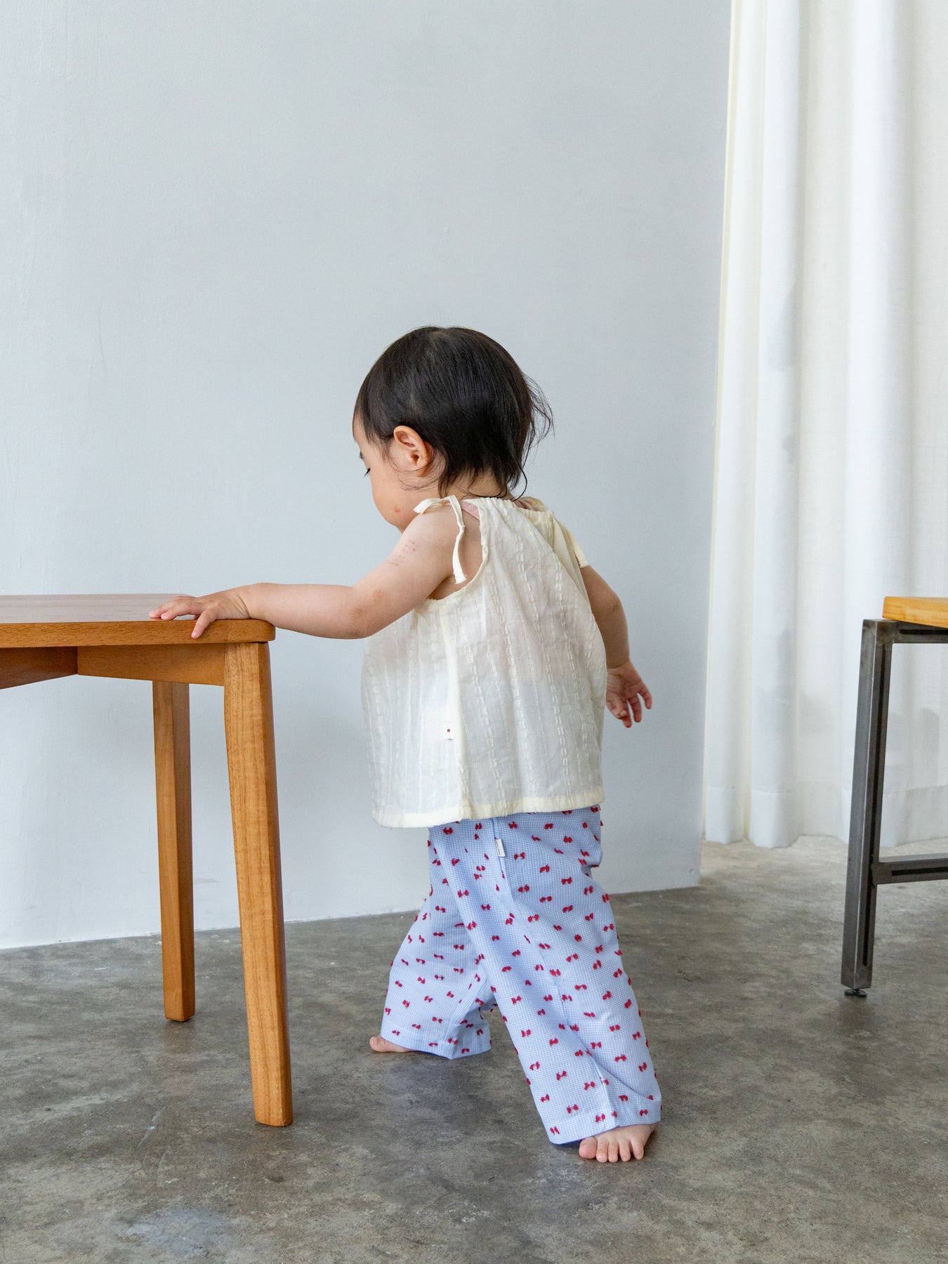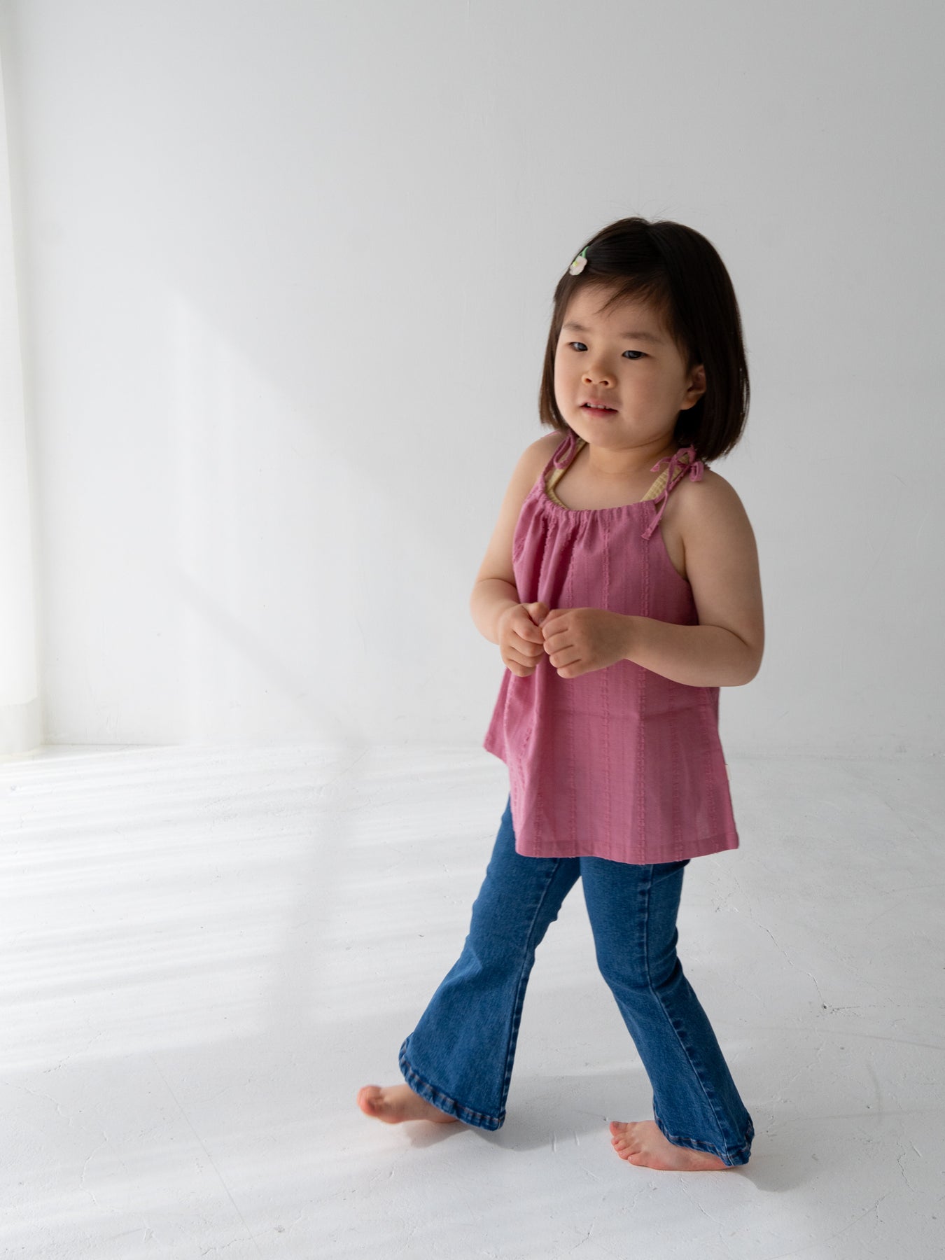 華奢なショルダーストラップは長さ調整が可能なので、成長に合わせて長くご愛用いただけます。暑い日は一枚でさらりと、肌寒い日はTシャツの上にレイヤードしても可愛い万能デザイン。