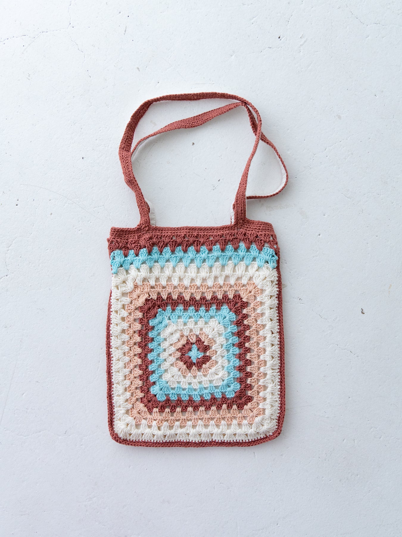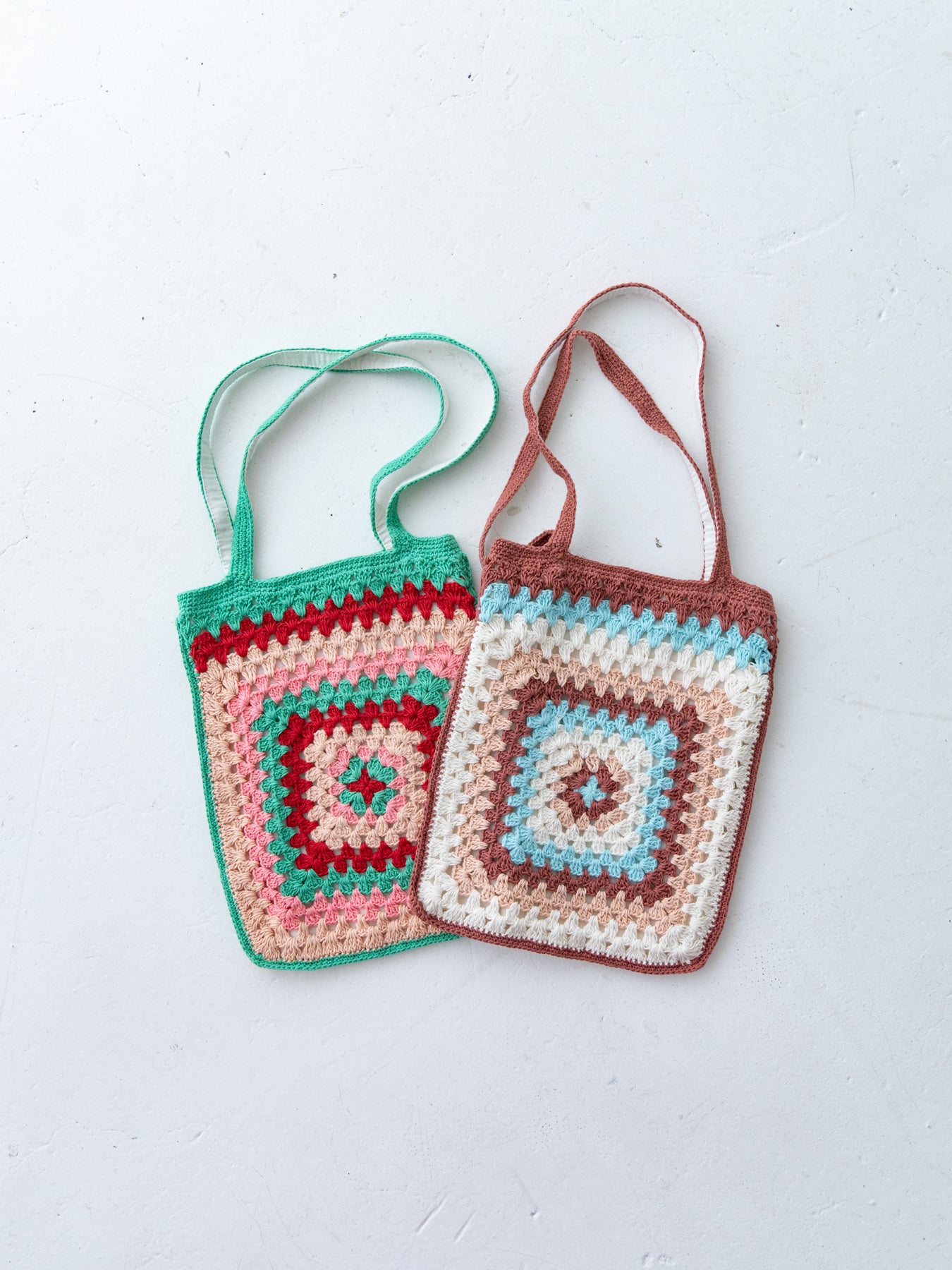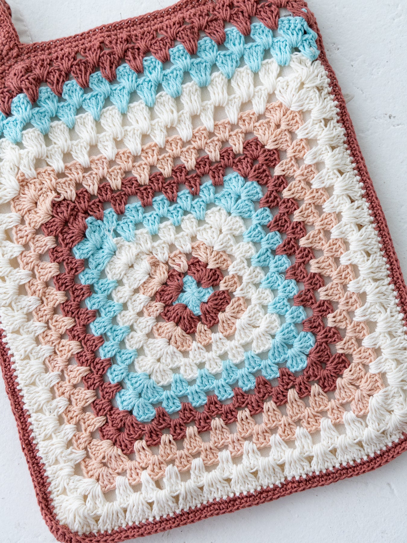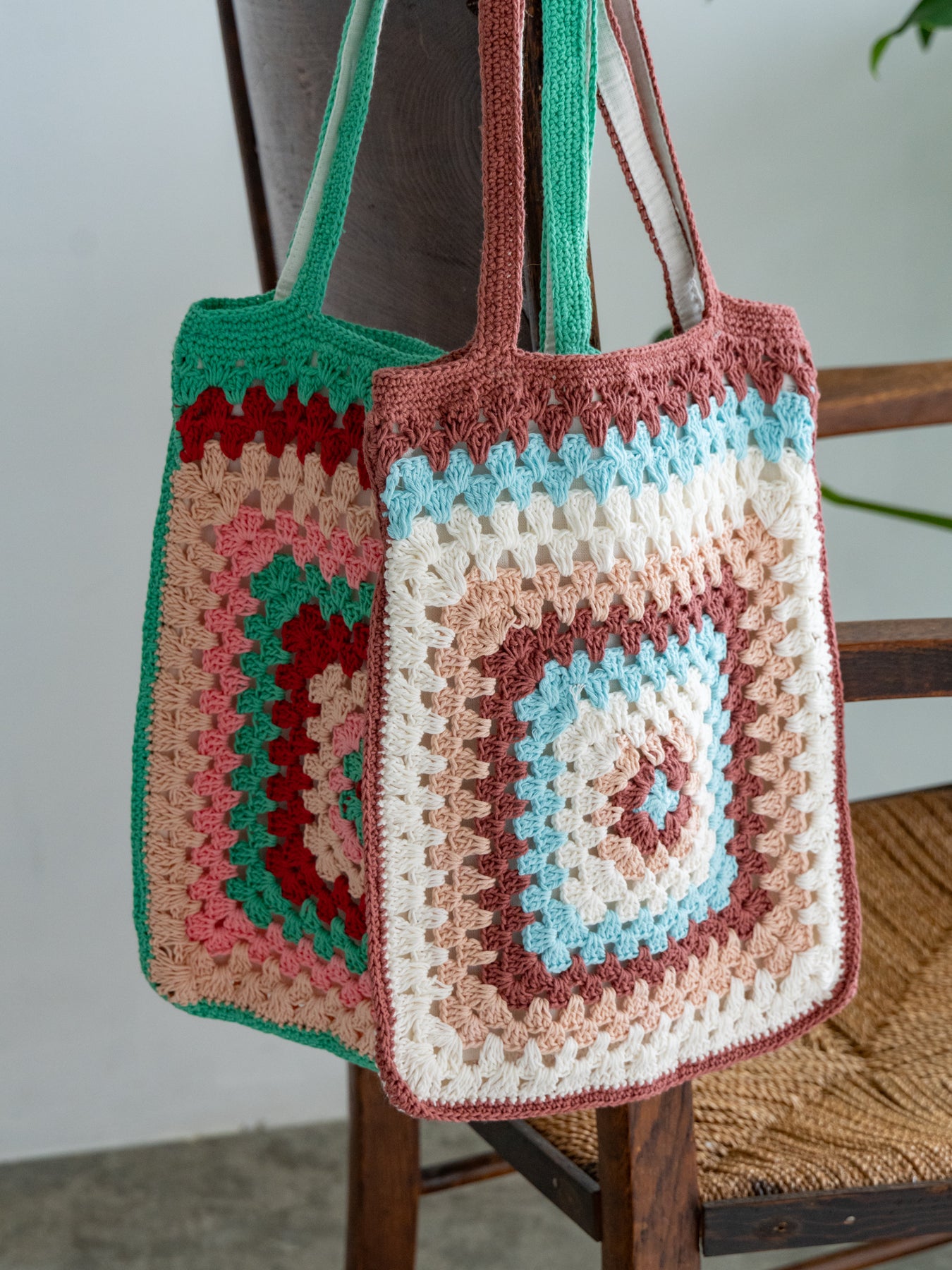ハンドメイドのやさしい風合いと、どこか懐かしさを感じるレトロな配色が魅力のクロシェトート。