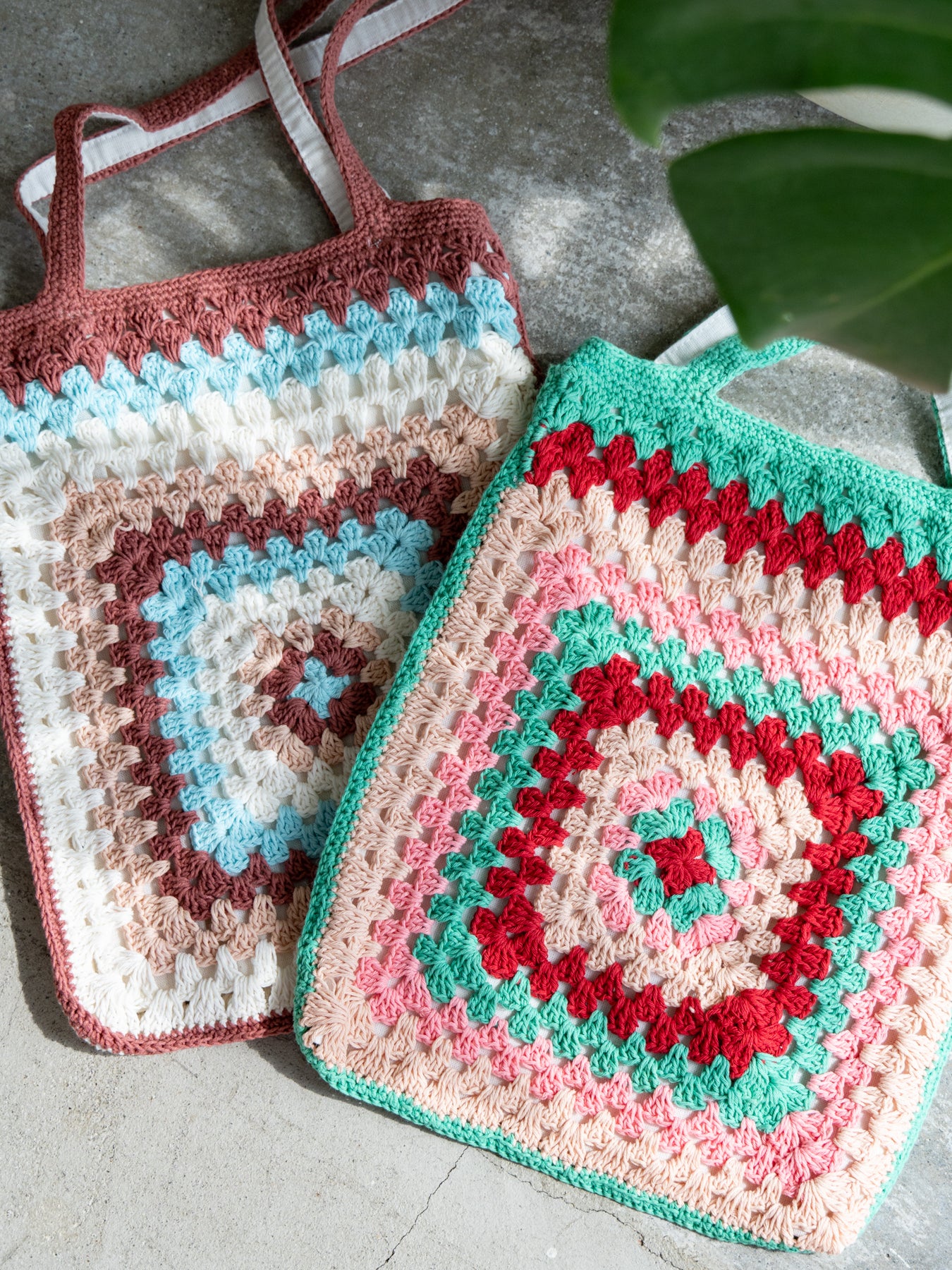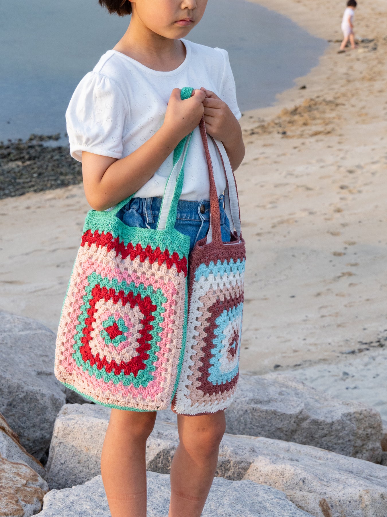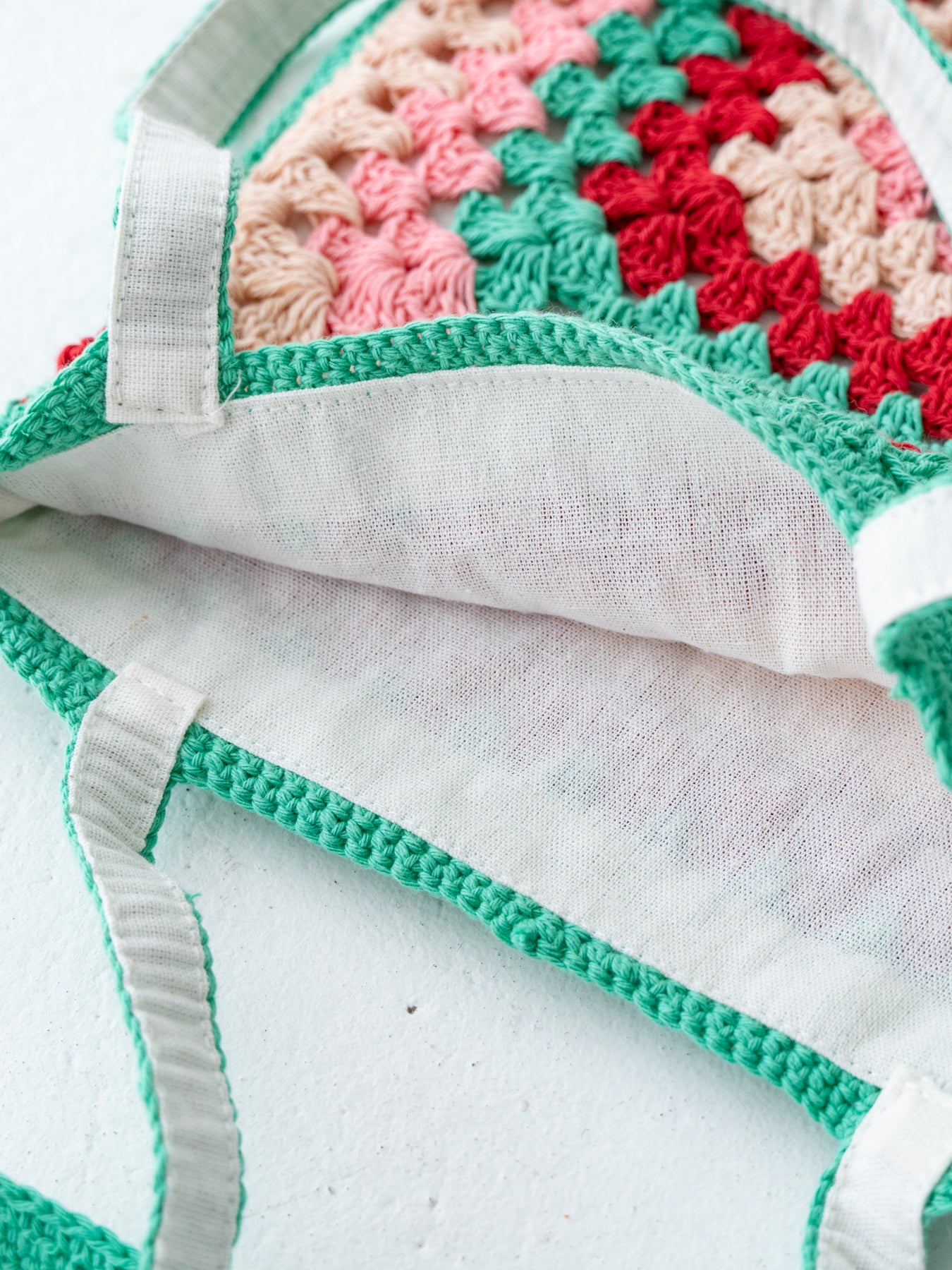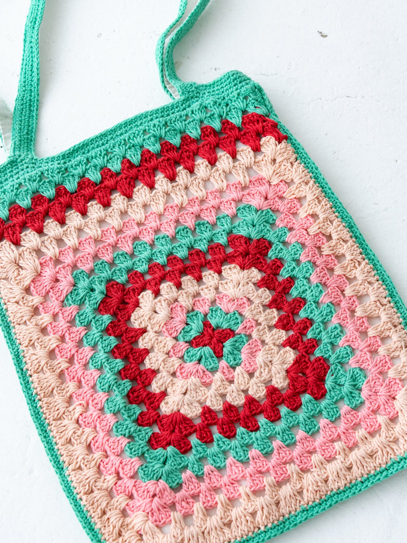 ハンドメイドのやさしい風合いと、どこか懐かしさを感じるレトロな配色が魅力のクロシェトート。