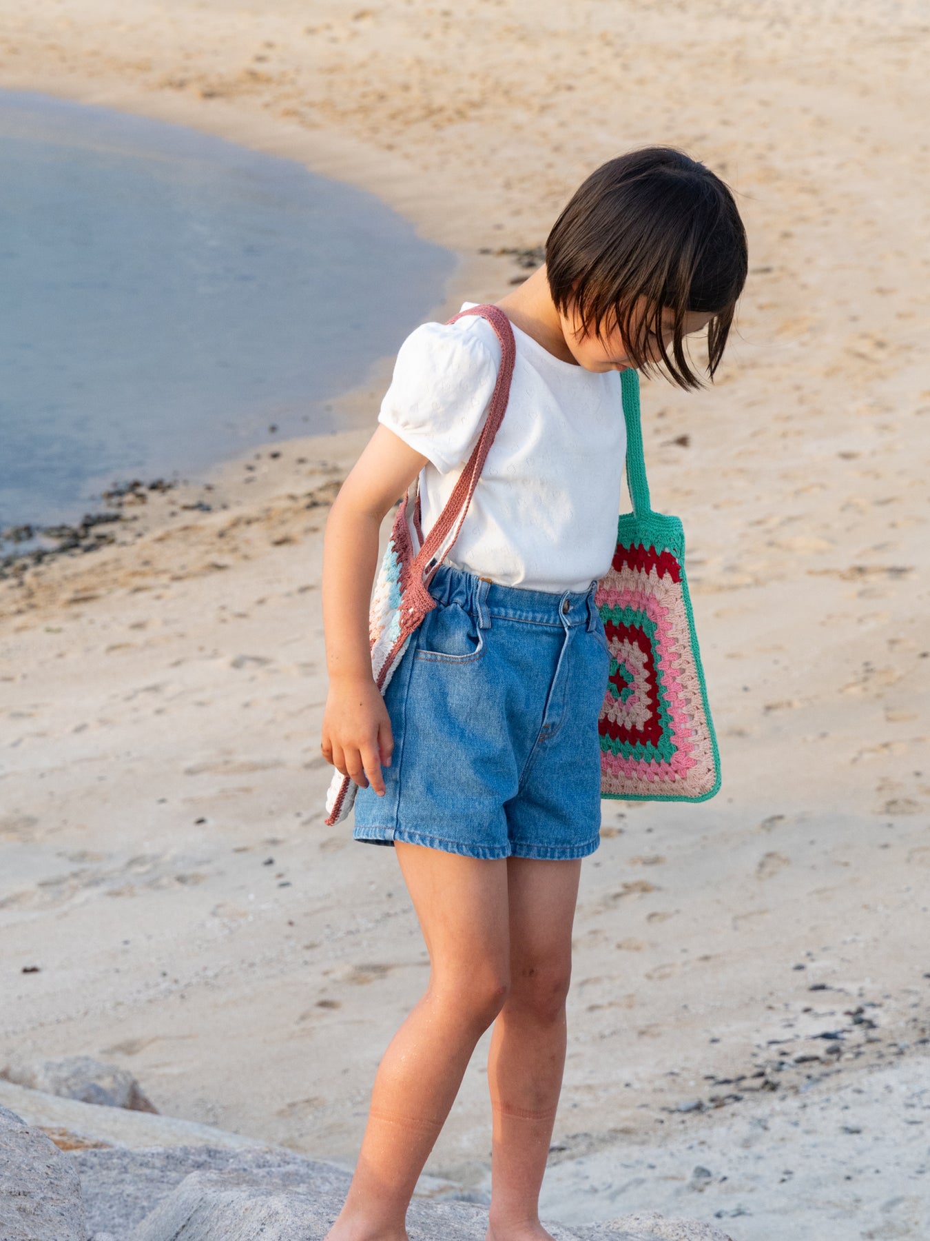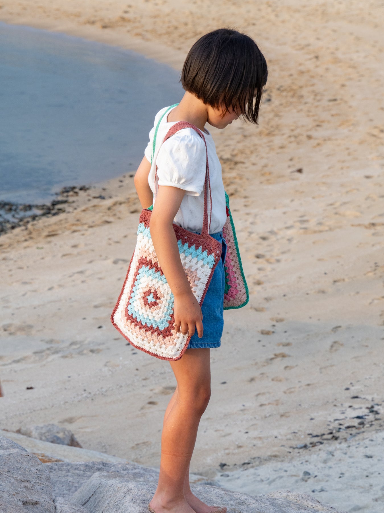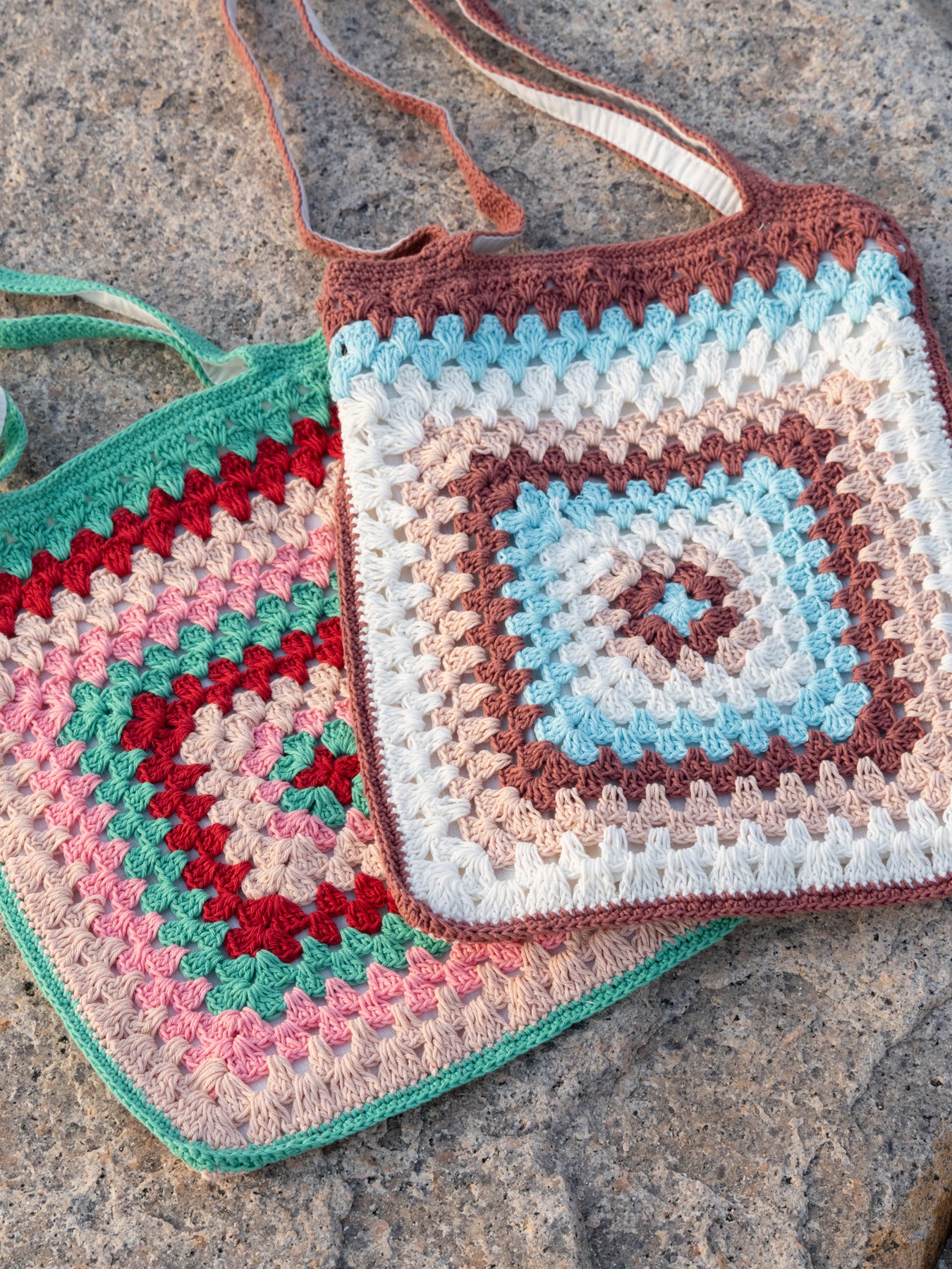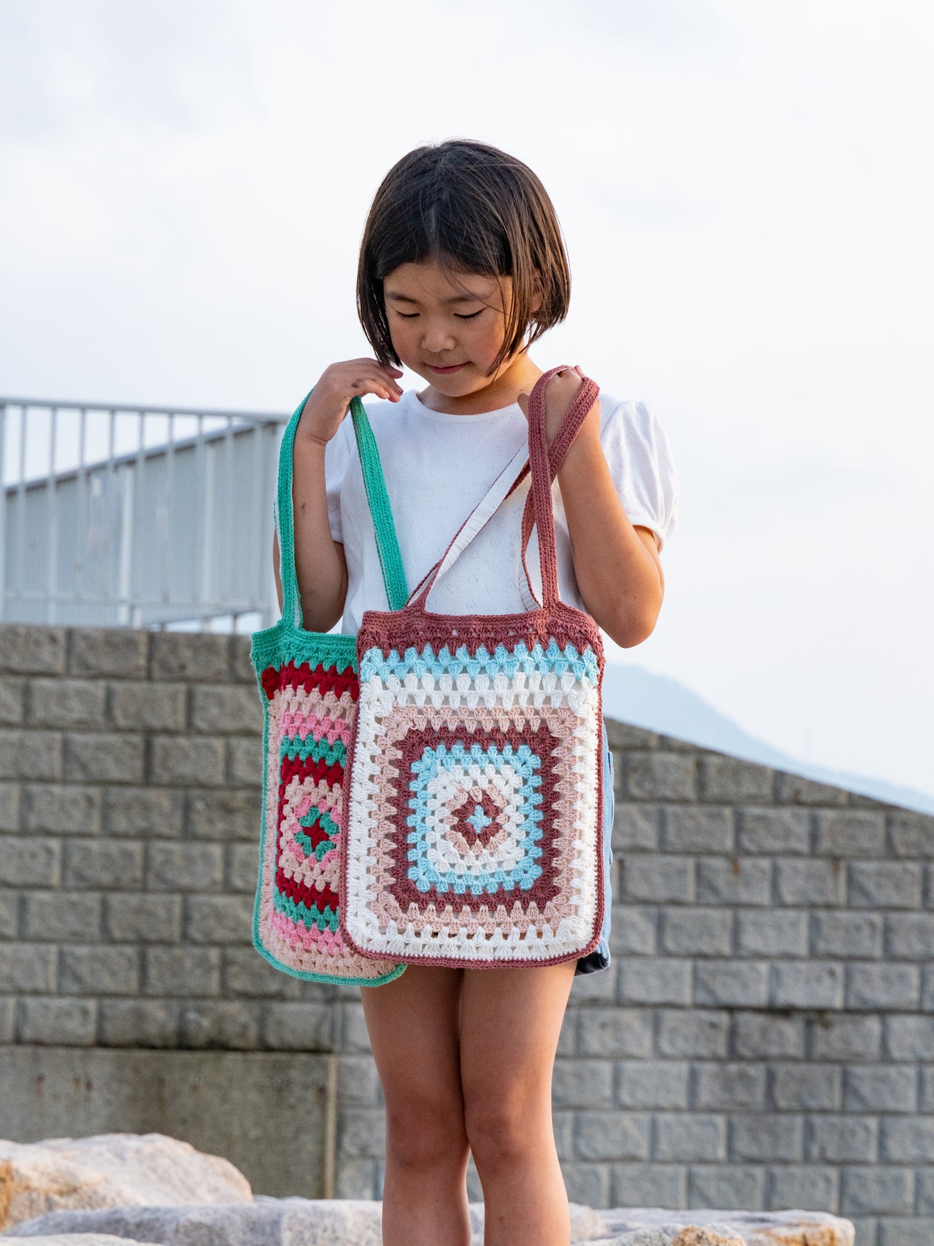 ハンドメイドのやさしい風合いと、どこか懐かしさを感じるレトロな配色が魅力のクロシェトート。