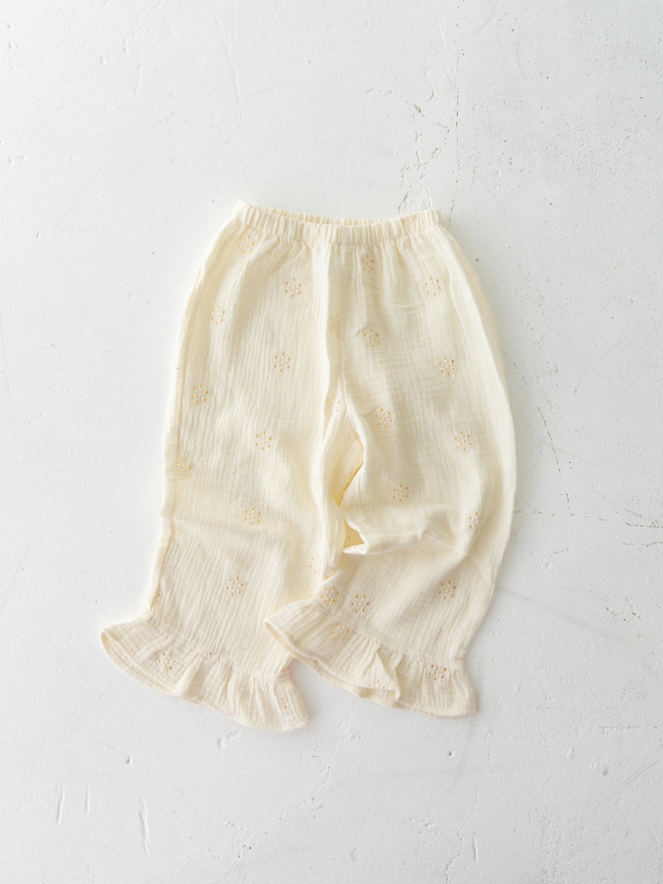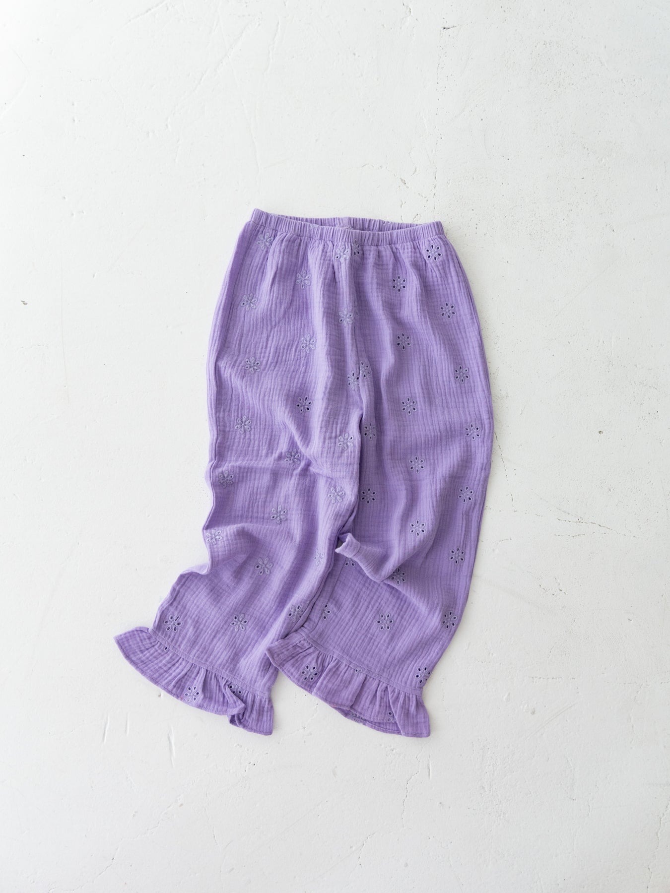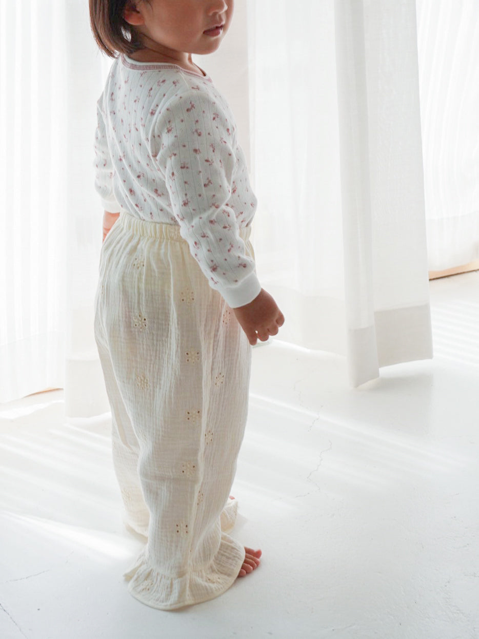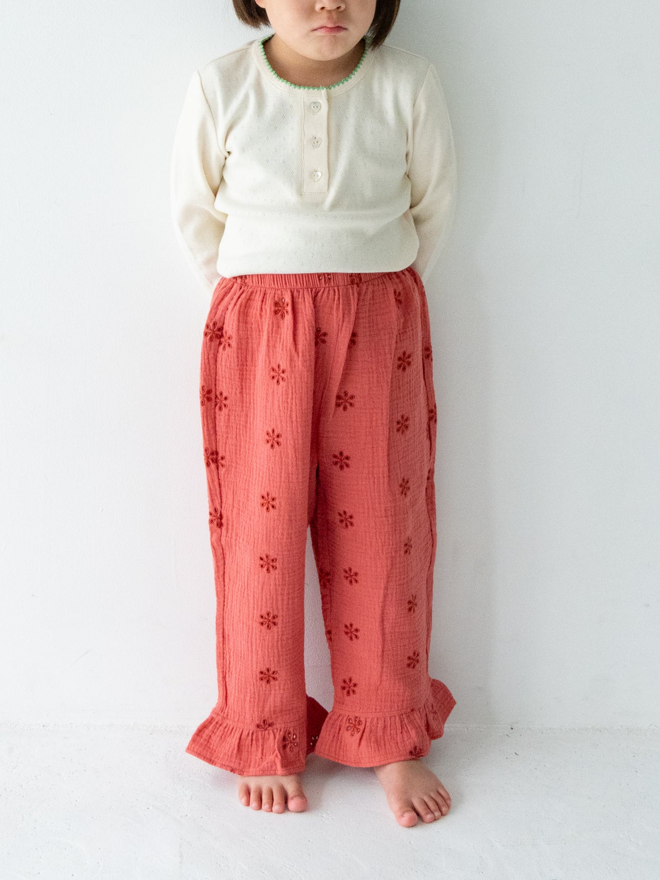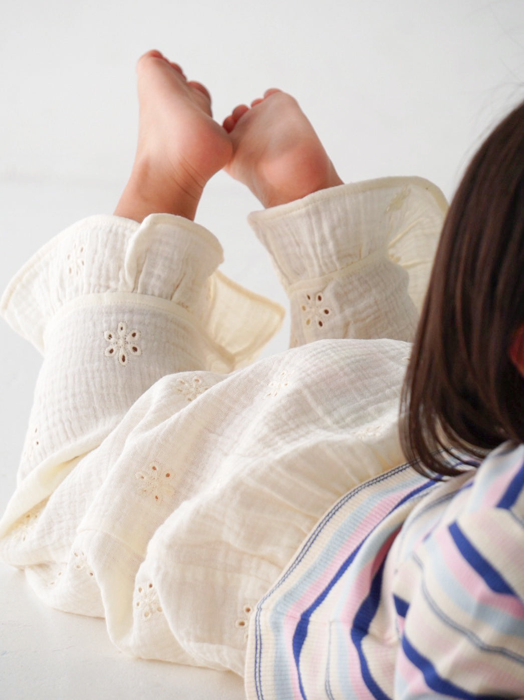 フラワーカットワークがさりげなく愛らしいポイントになった、コットン100%のクレープ素材で仕立てたロングパンツ。
