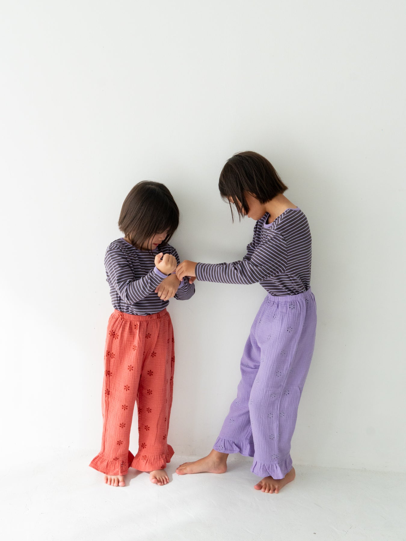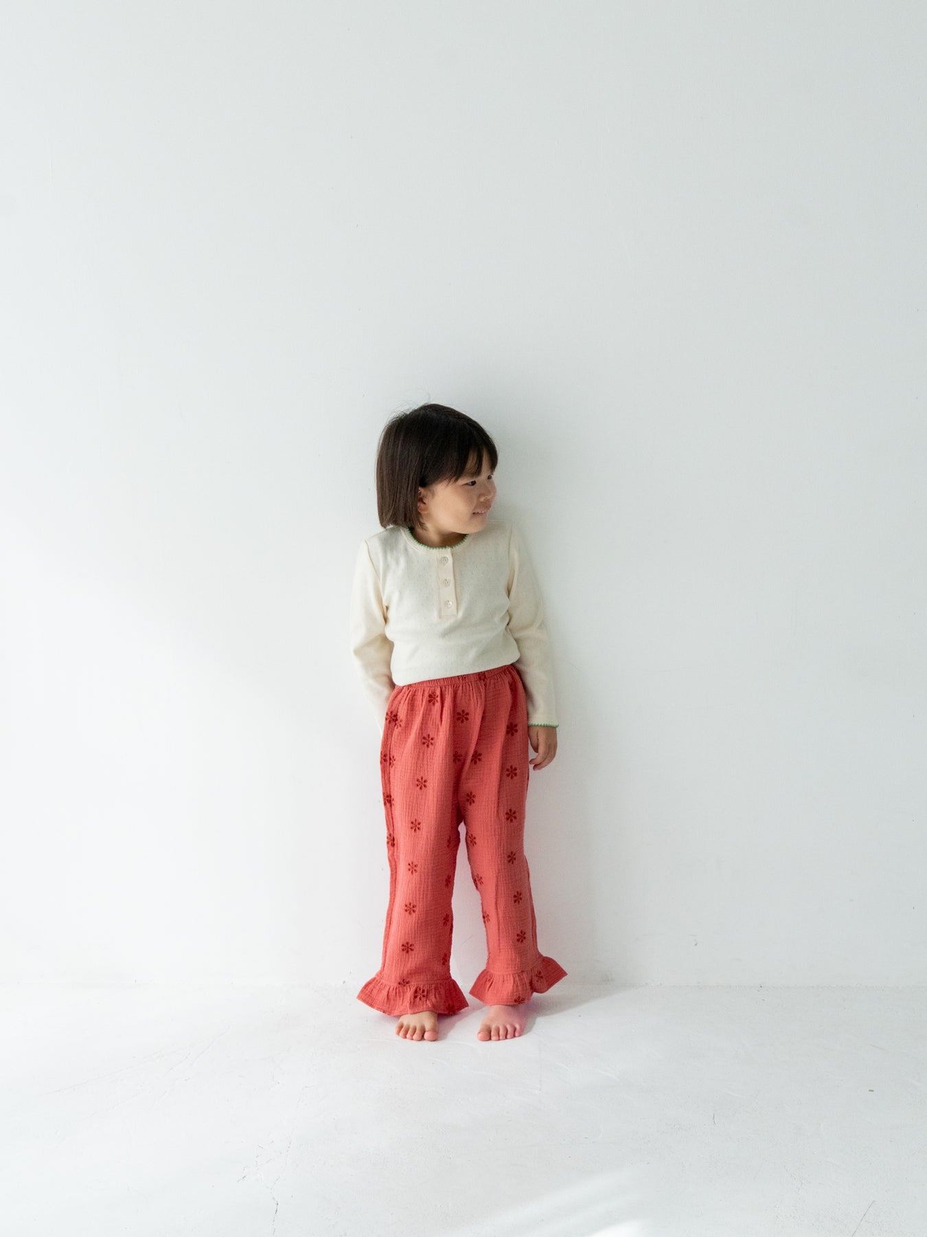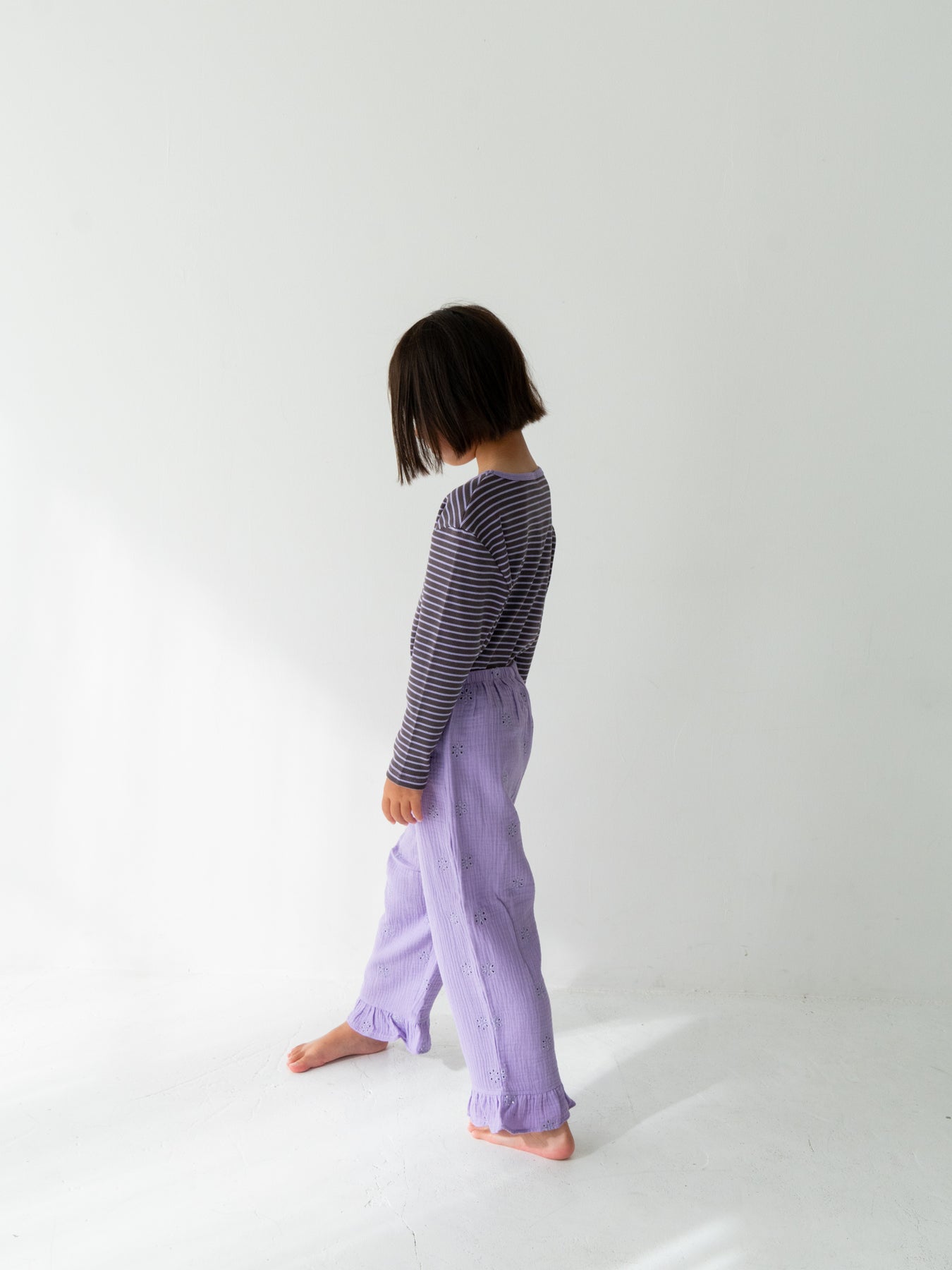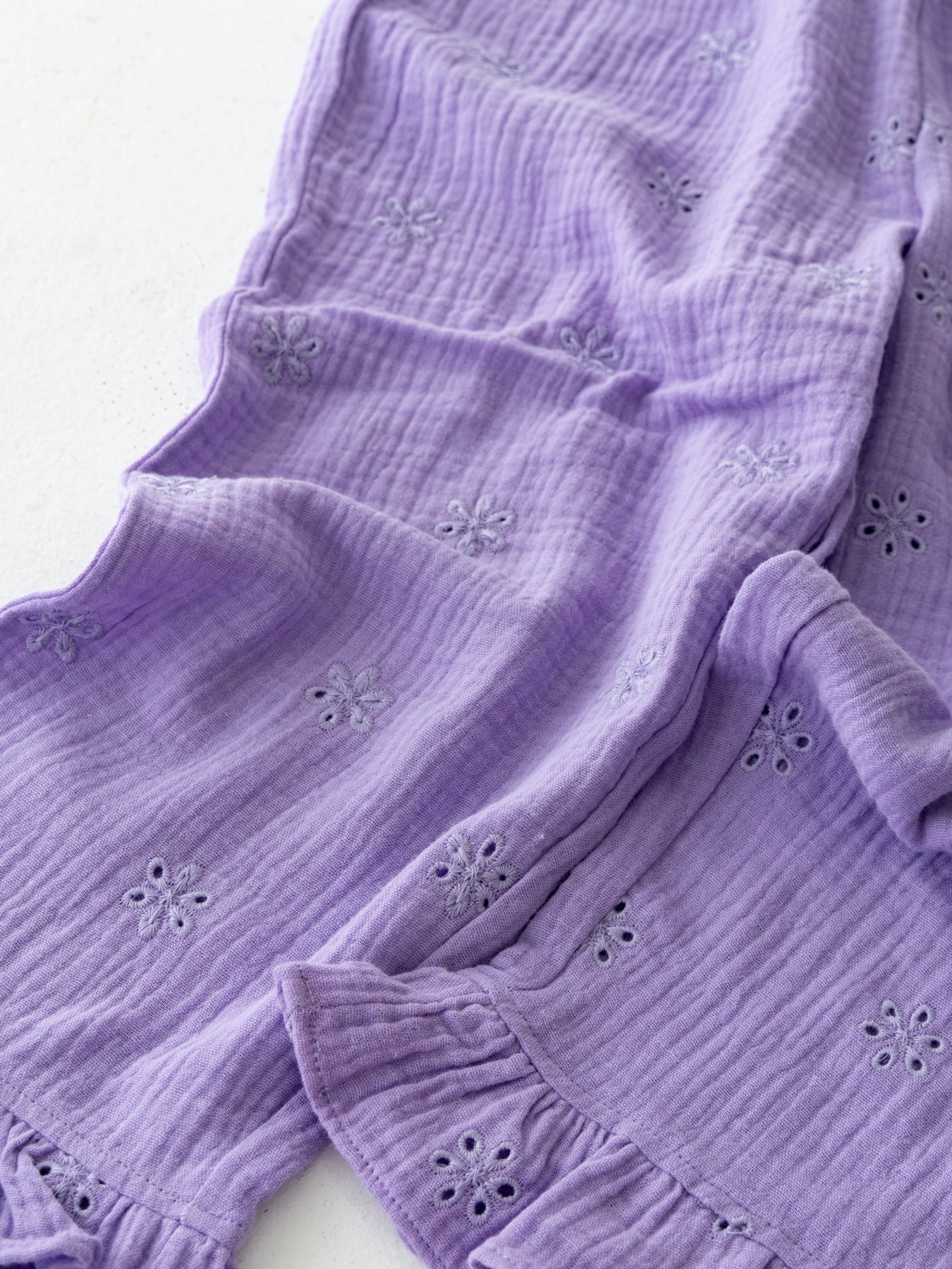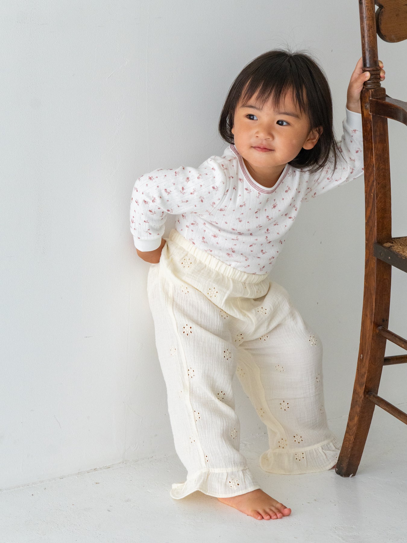 フラワーカットワークがさりげなく愛らしいポイントになった、コットン100%のクレープ素材で仕立てたロングパンツ。