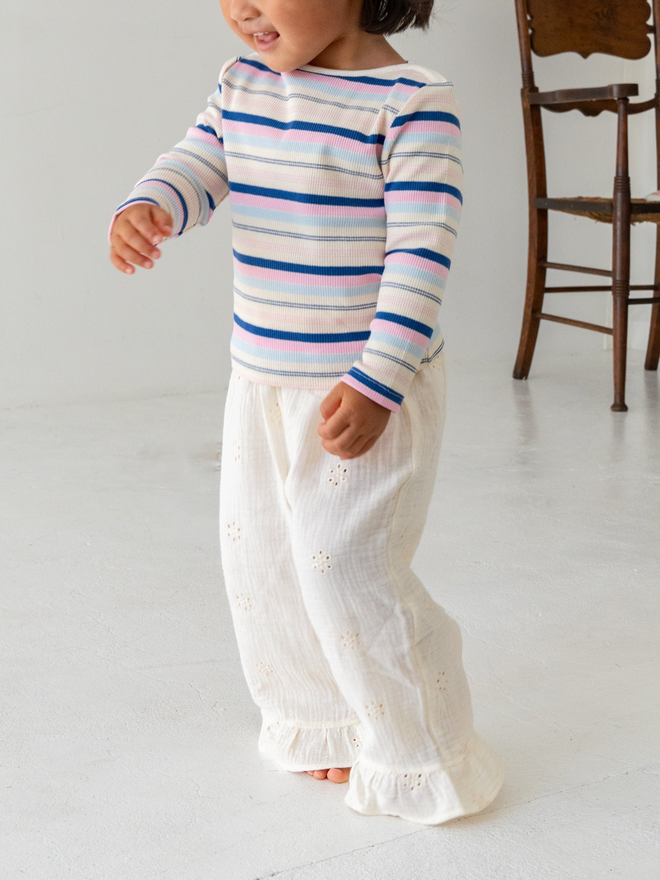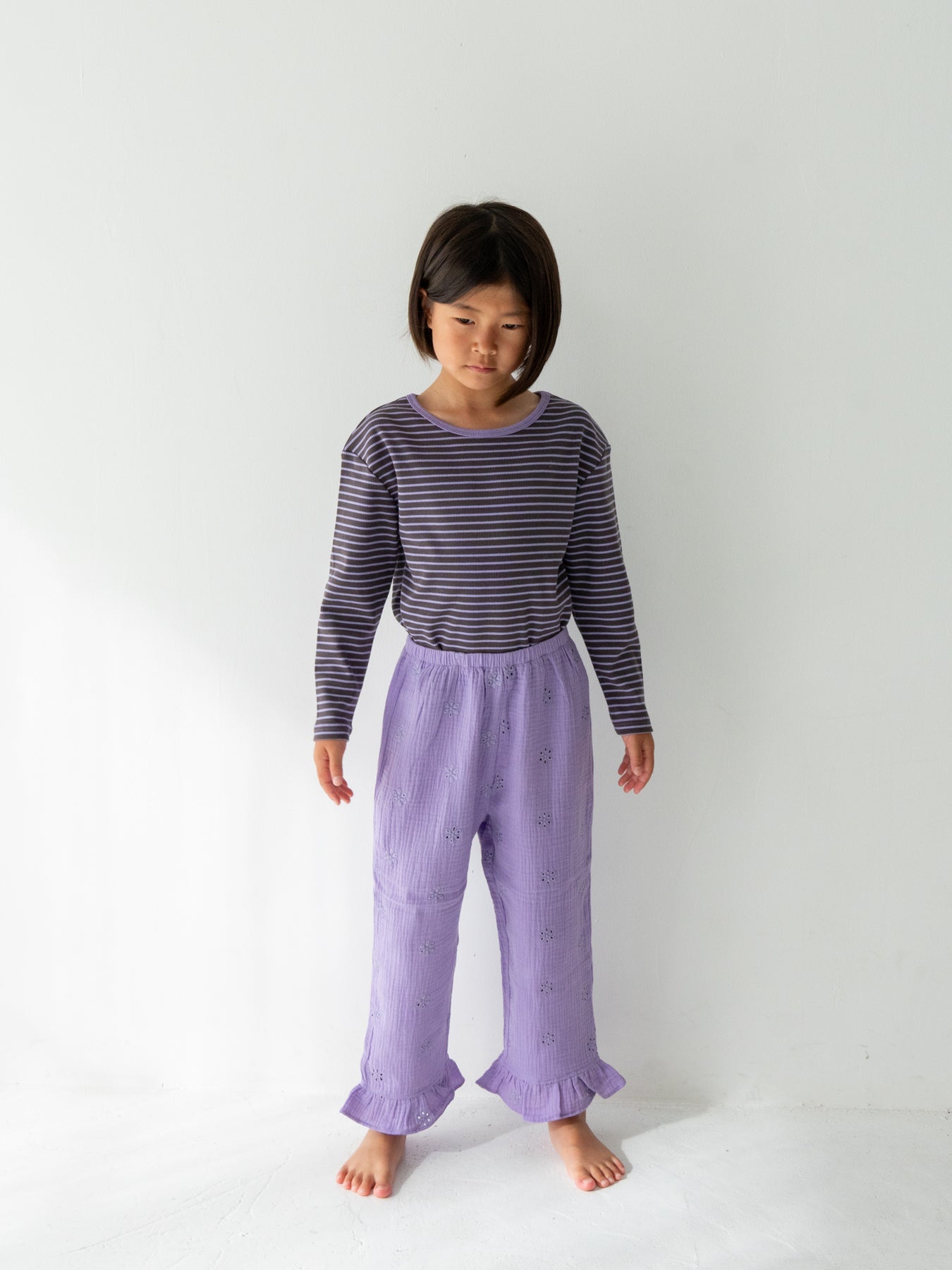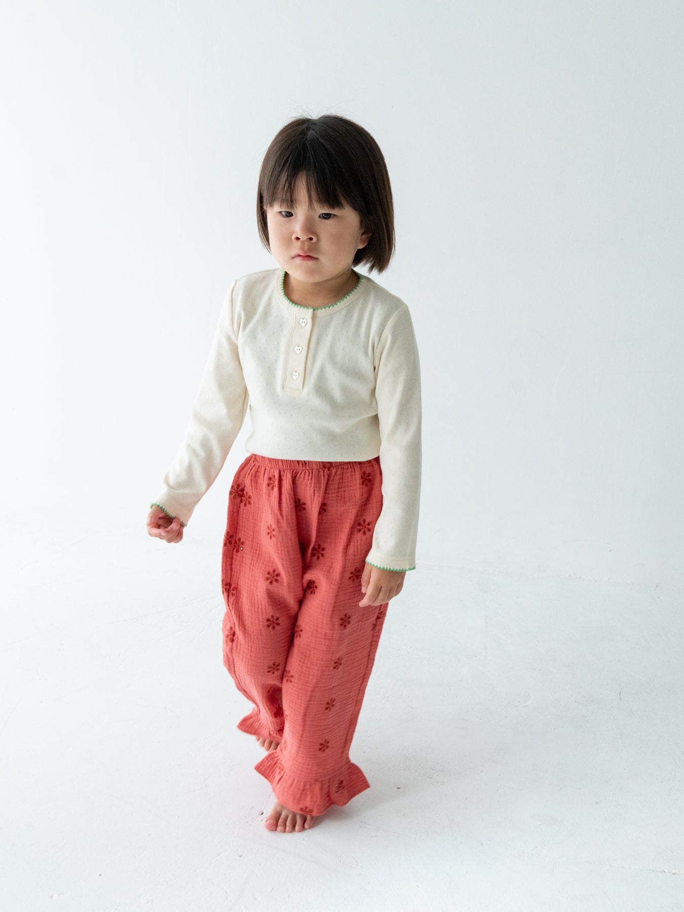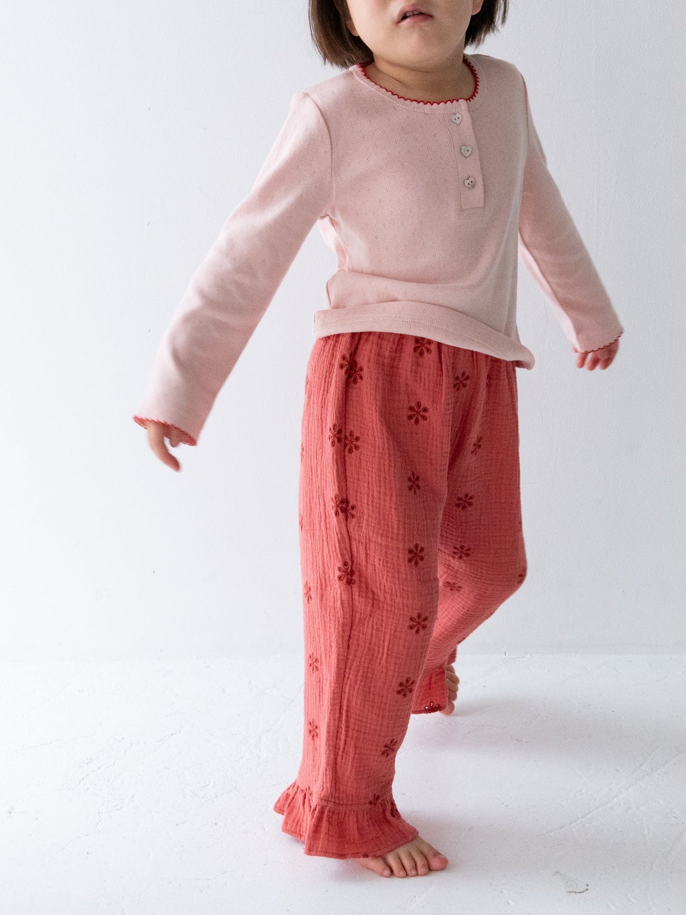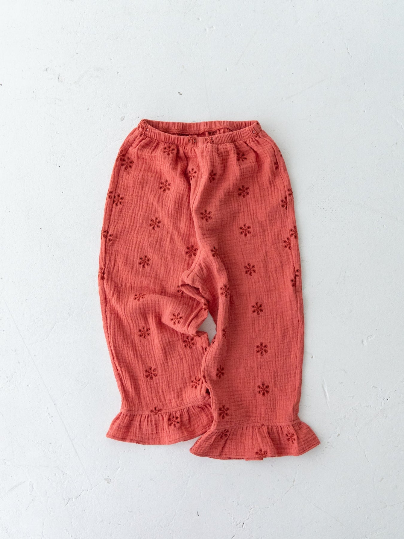 フラワーカットワークがさりげなく愛らしいポイントになった、コットン100%のクレープ素材で仕立てたロングパンツ。