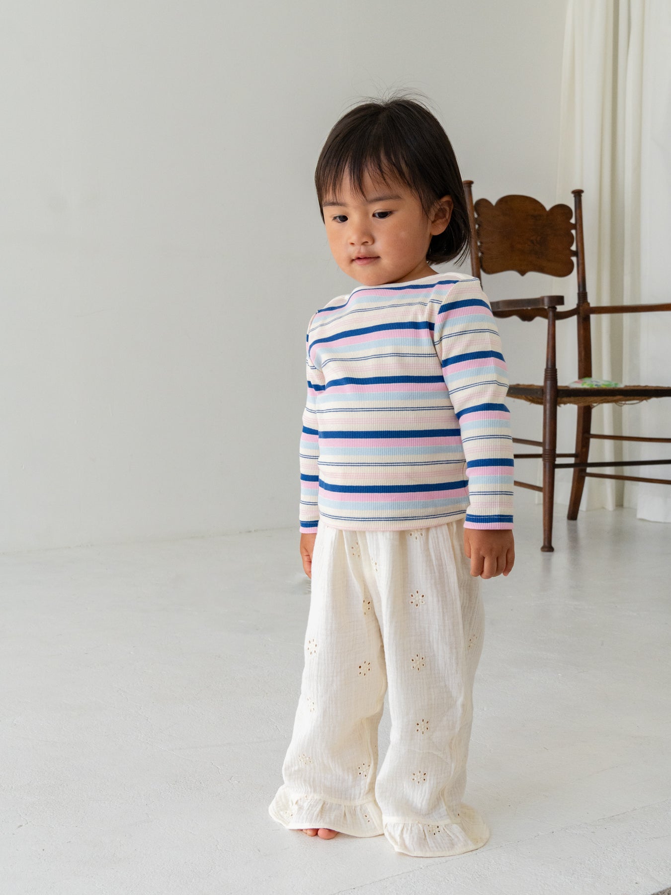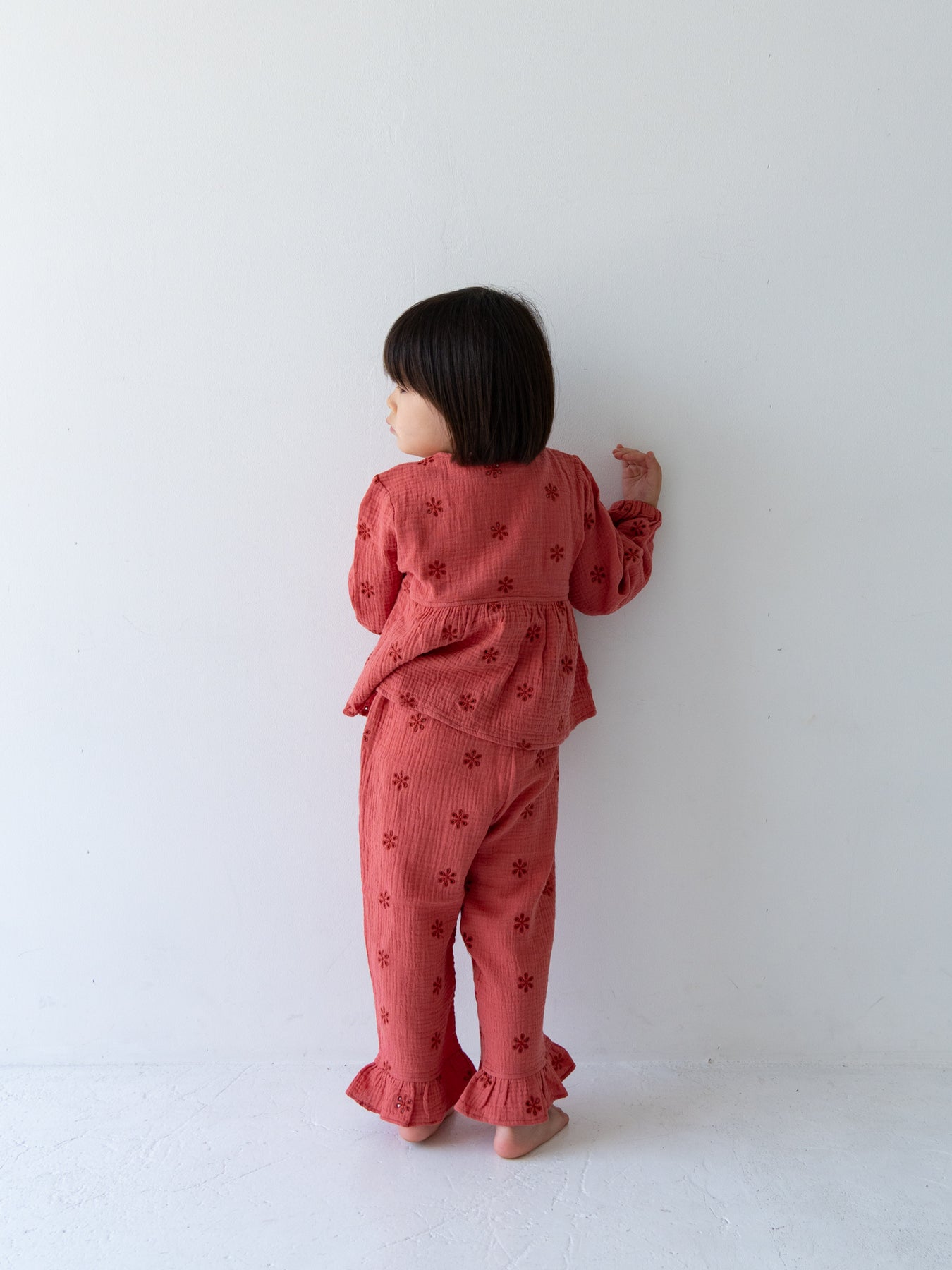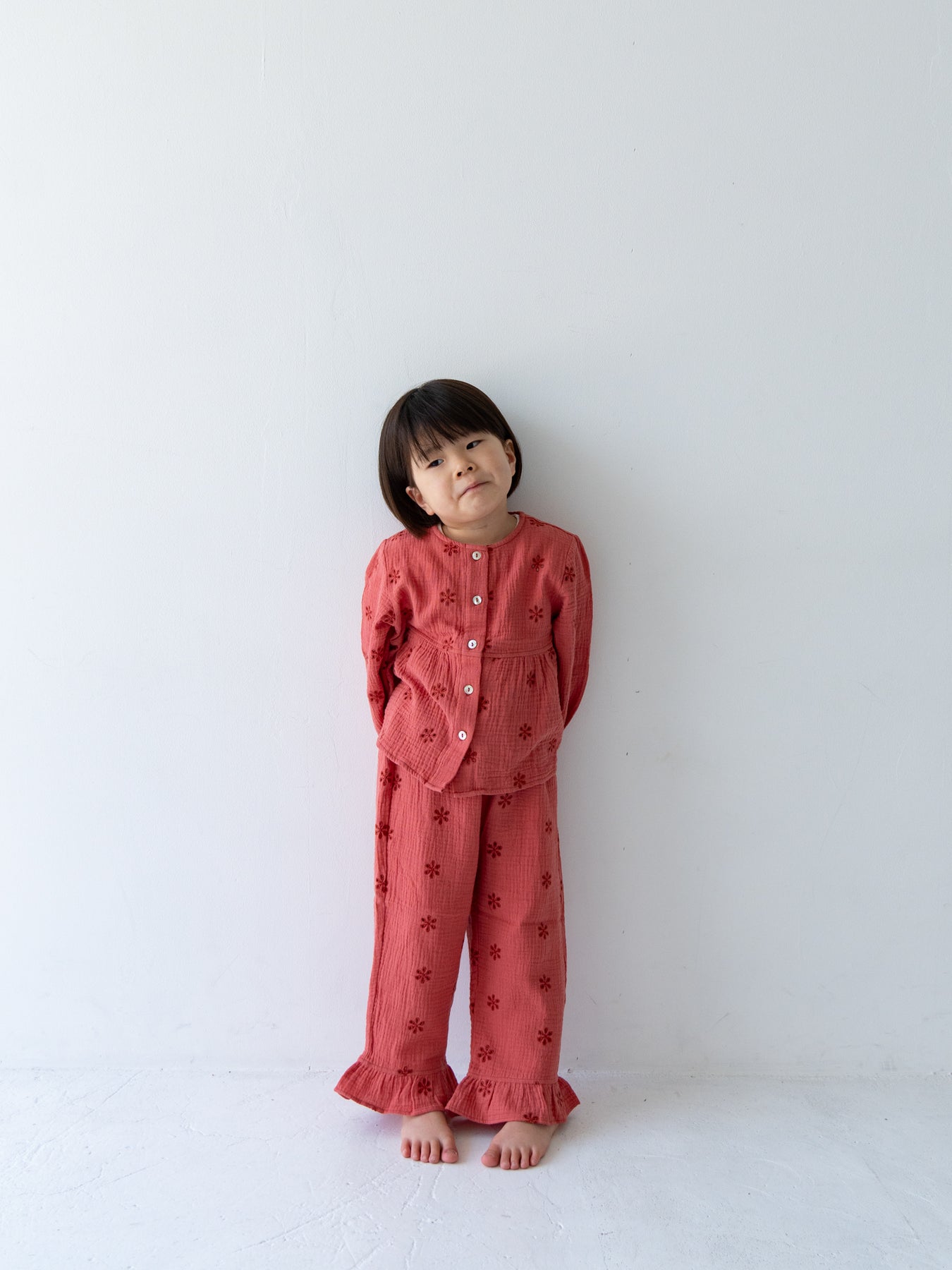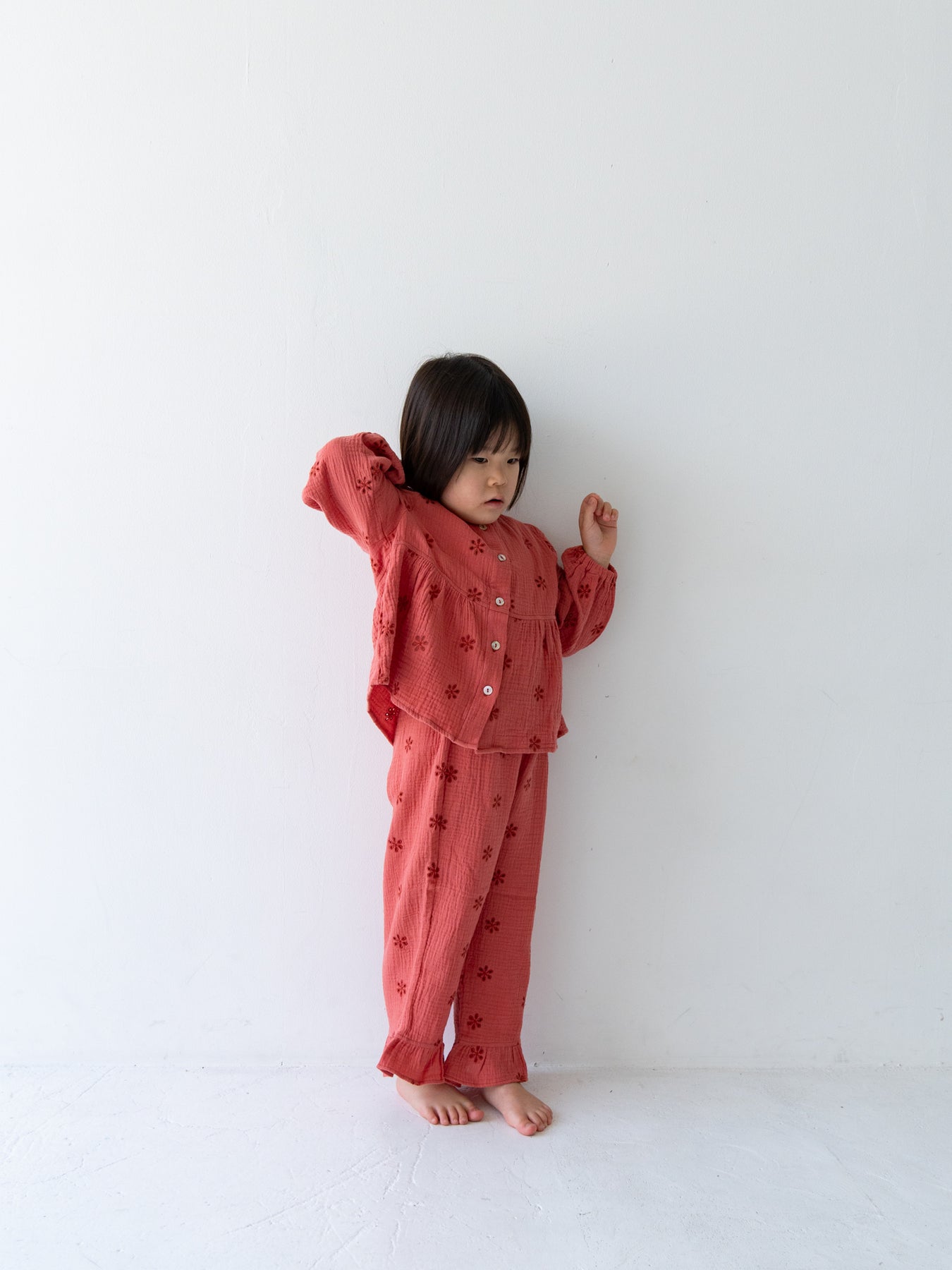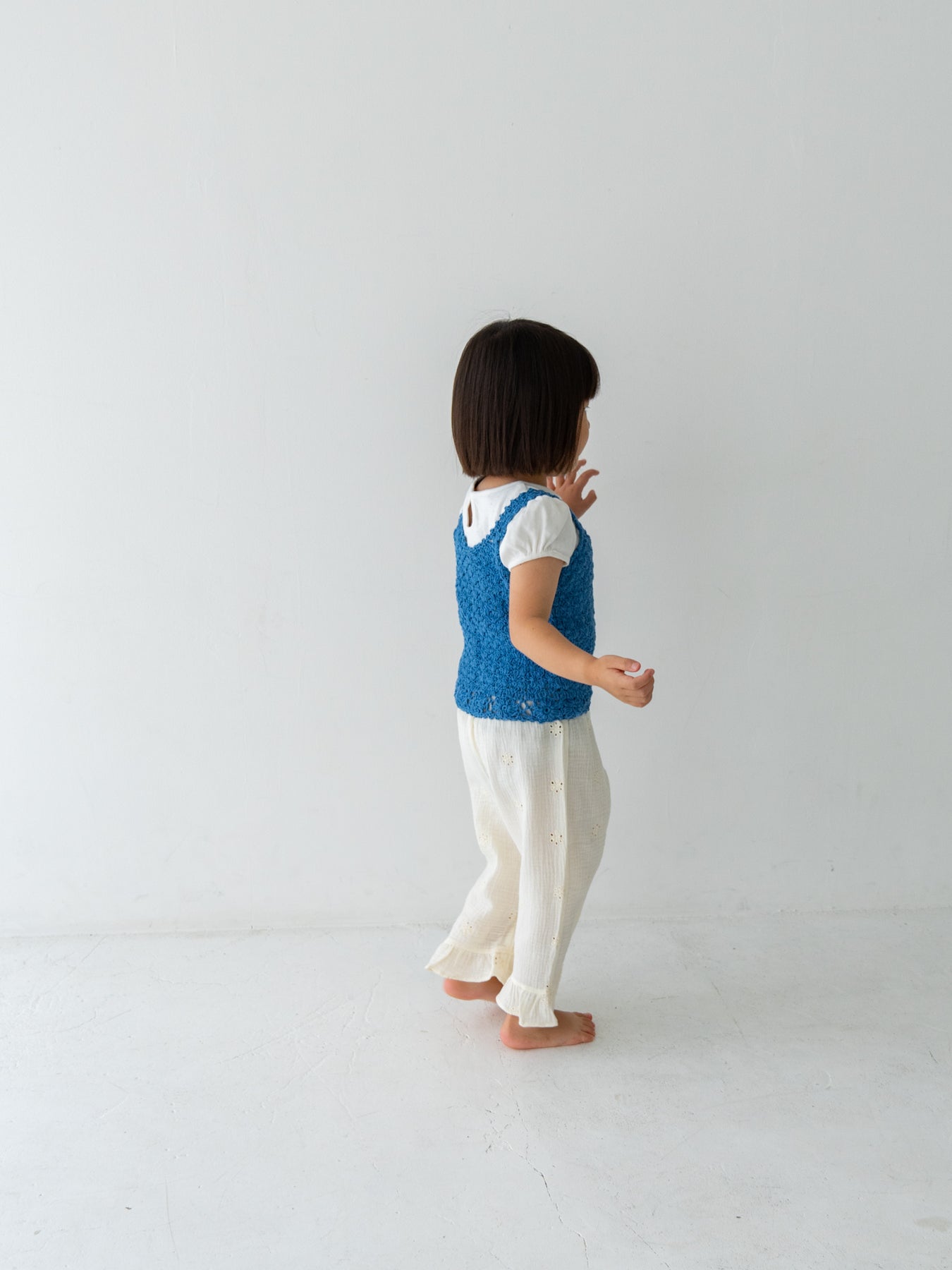 フラワーカットワークがさりげなく愛らしいポイントになった、コットン100%のクレープ素材で仕立てたロングパンツ。