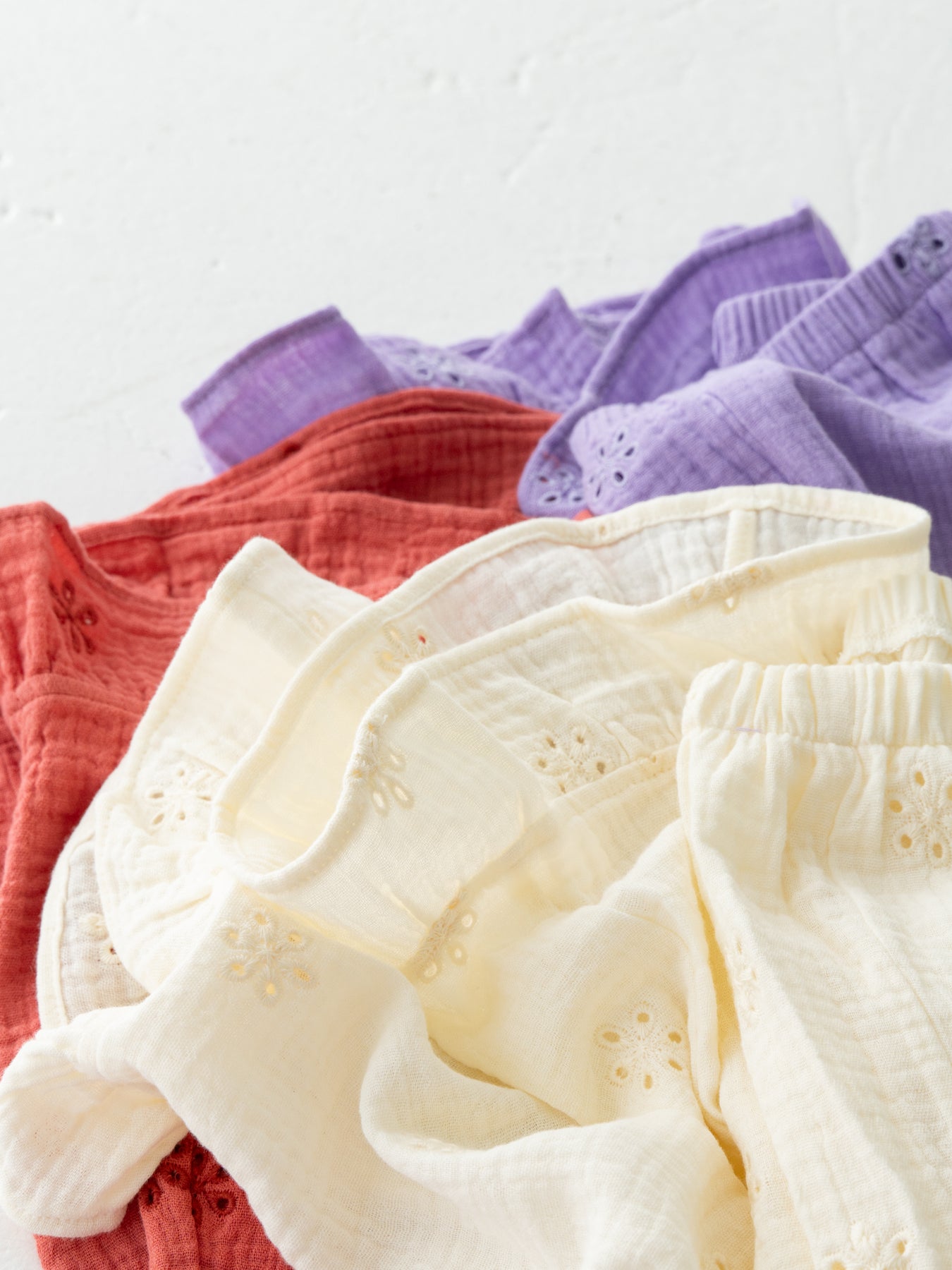 通気性と吸湿性に優れた生地で、柔らかな肌ざわりが魅力。敏感なお子さまの肌にもやさしく、暑い季節も快適に過ごせます。
