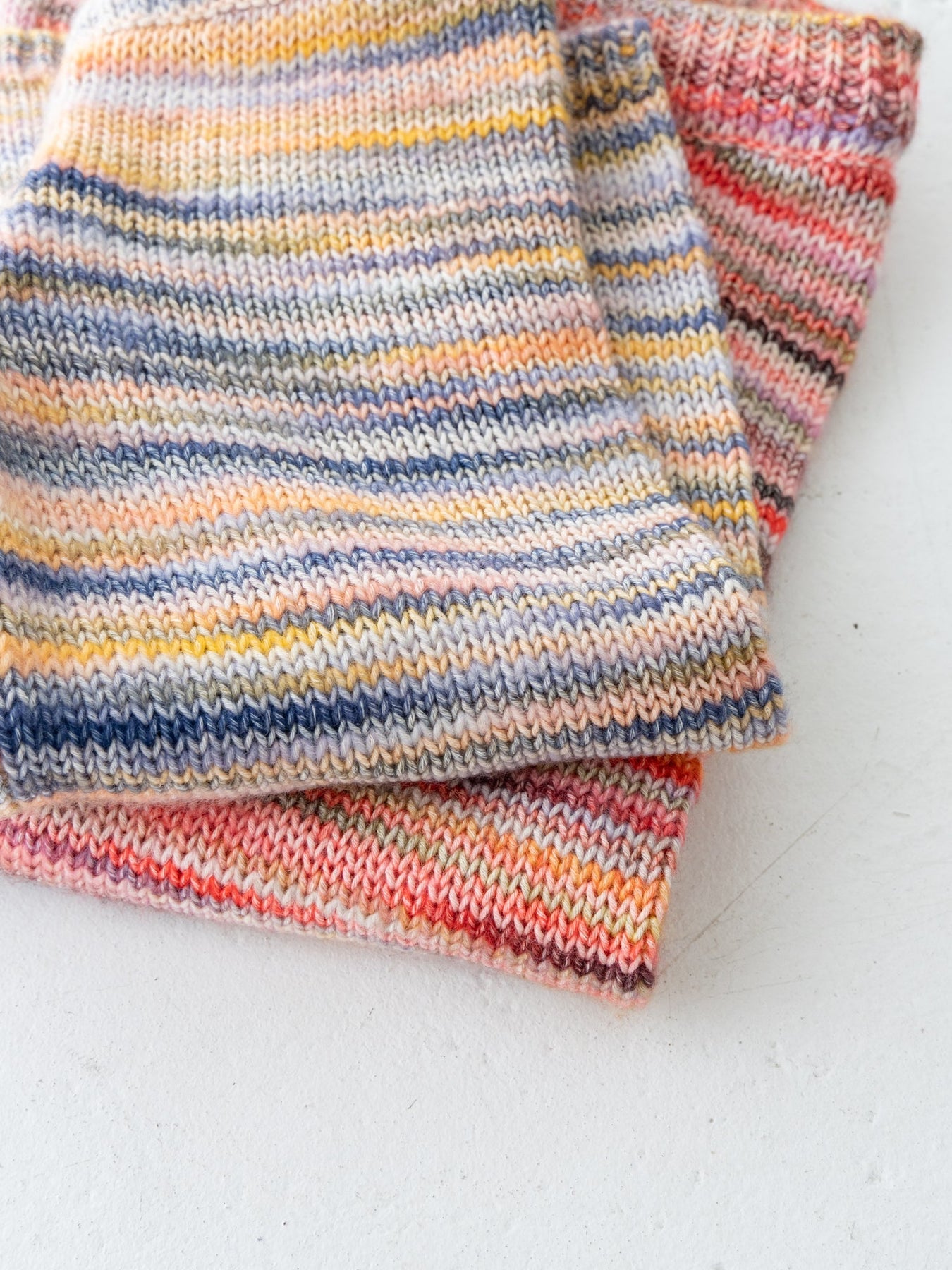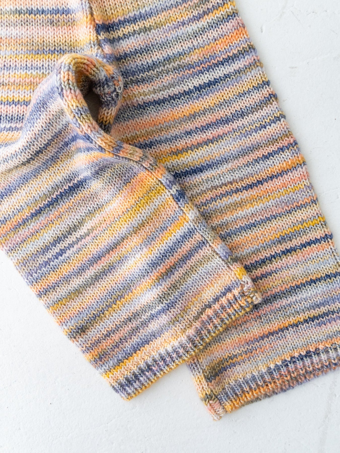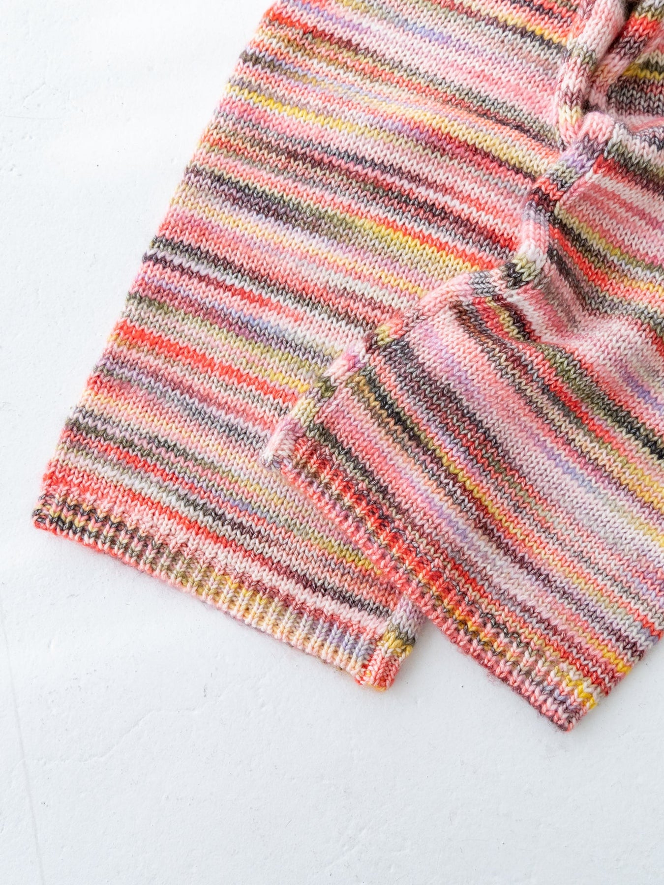 さまざまなカラーの毛糸が混ざり合った、マーブル編みが魅力のニットパンツ。