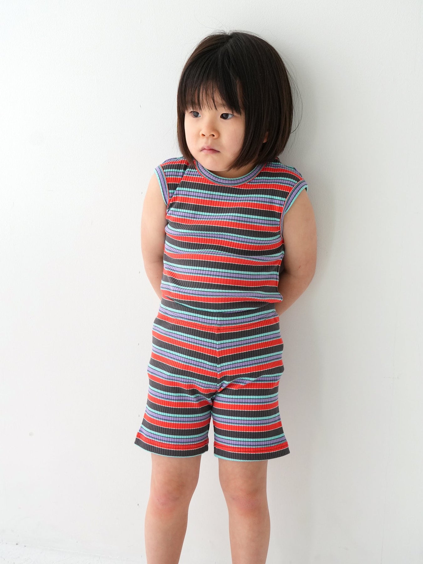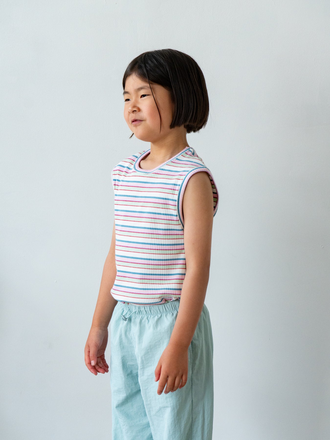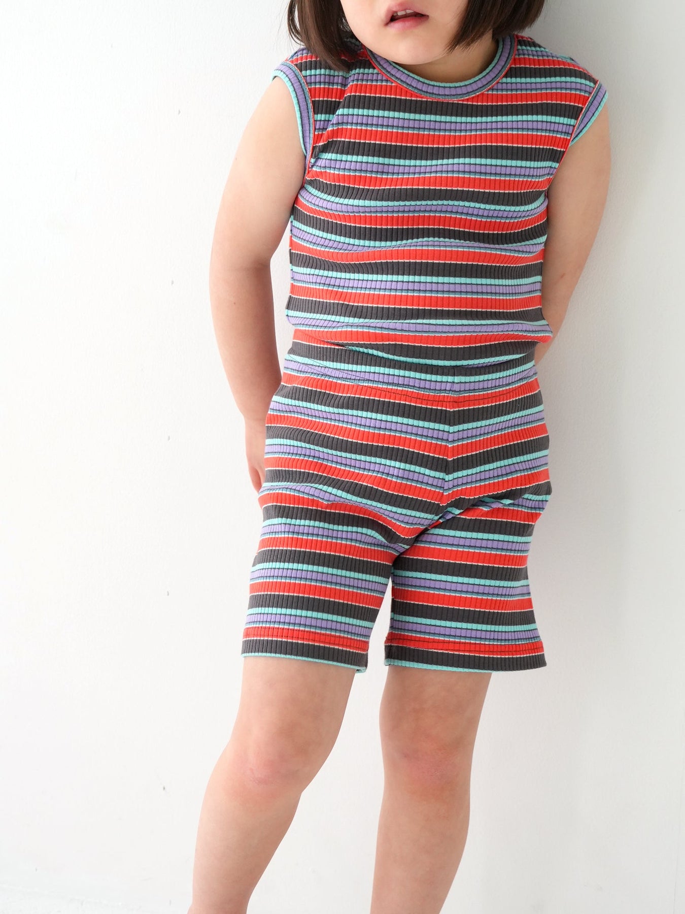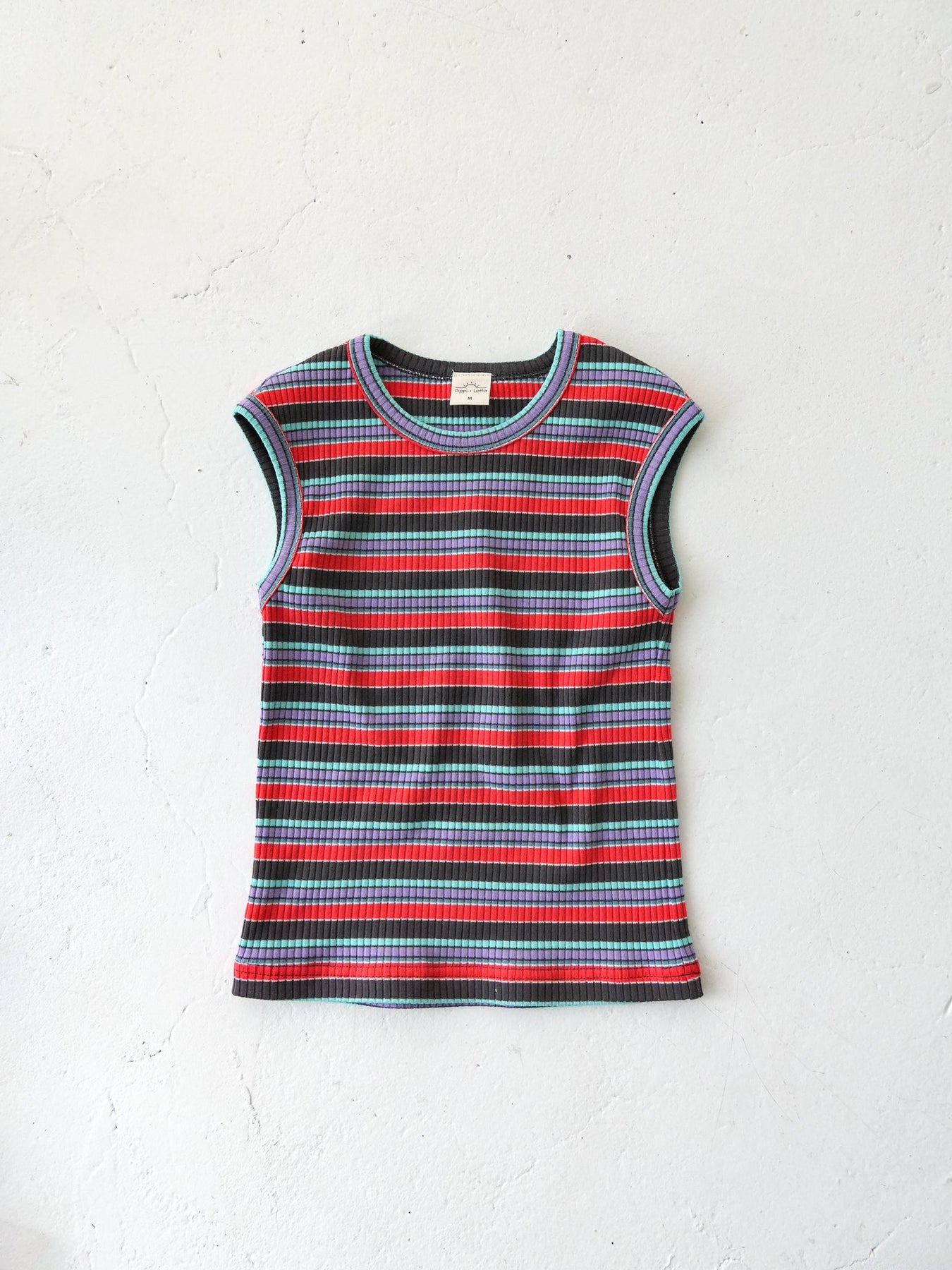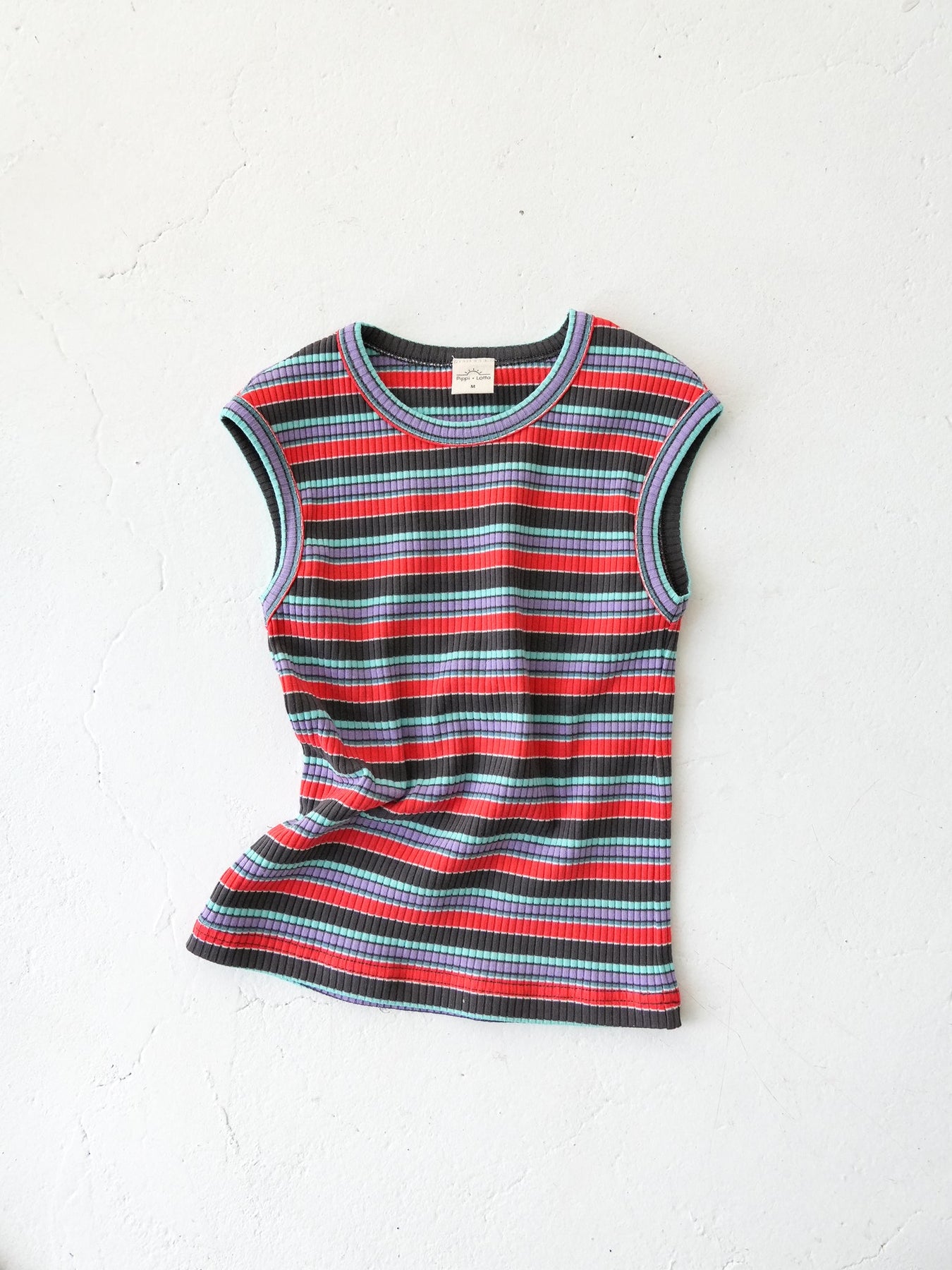 明るくポップな配色が目を引く、マルチストライプ柄のノースリーブトップス。夏らしい軽やかなデザインで、コーディネートの主役になる一枚です。