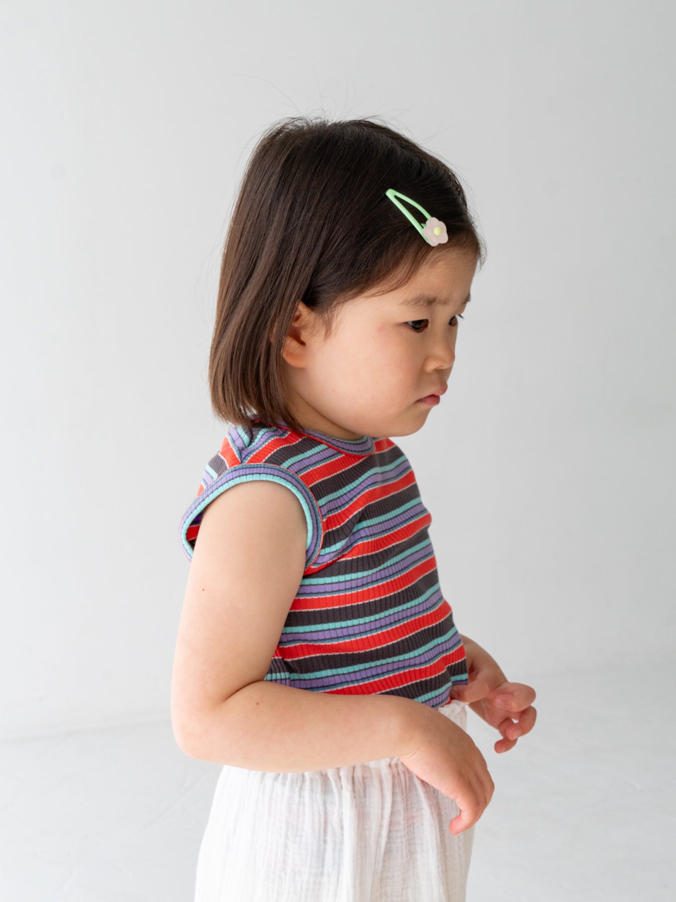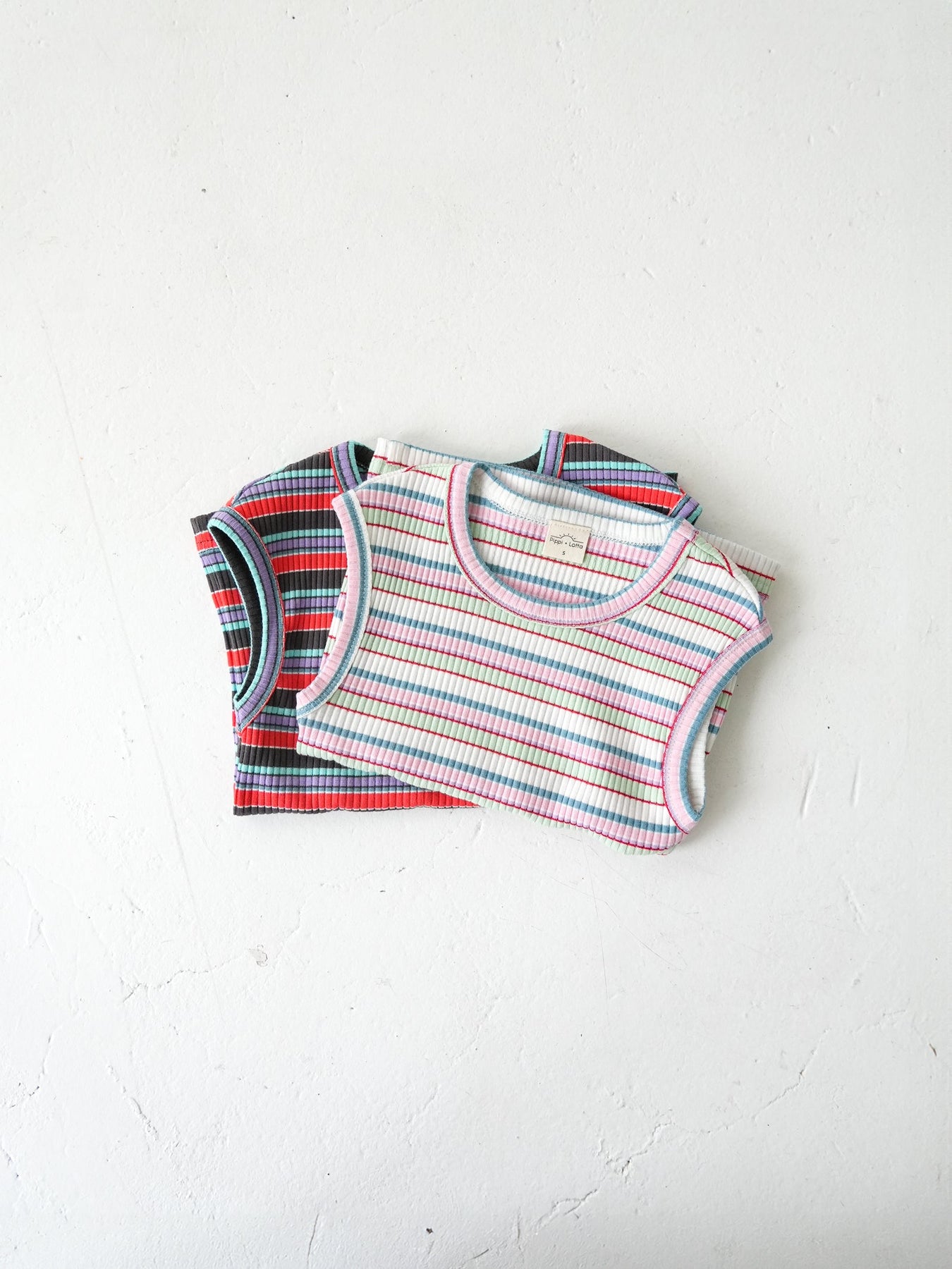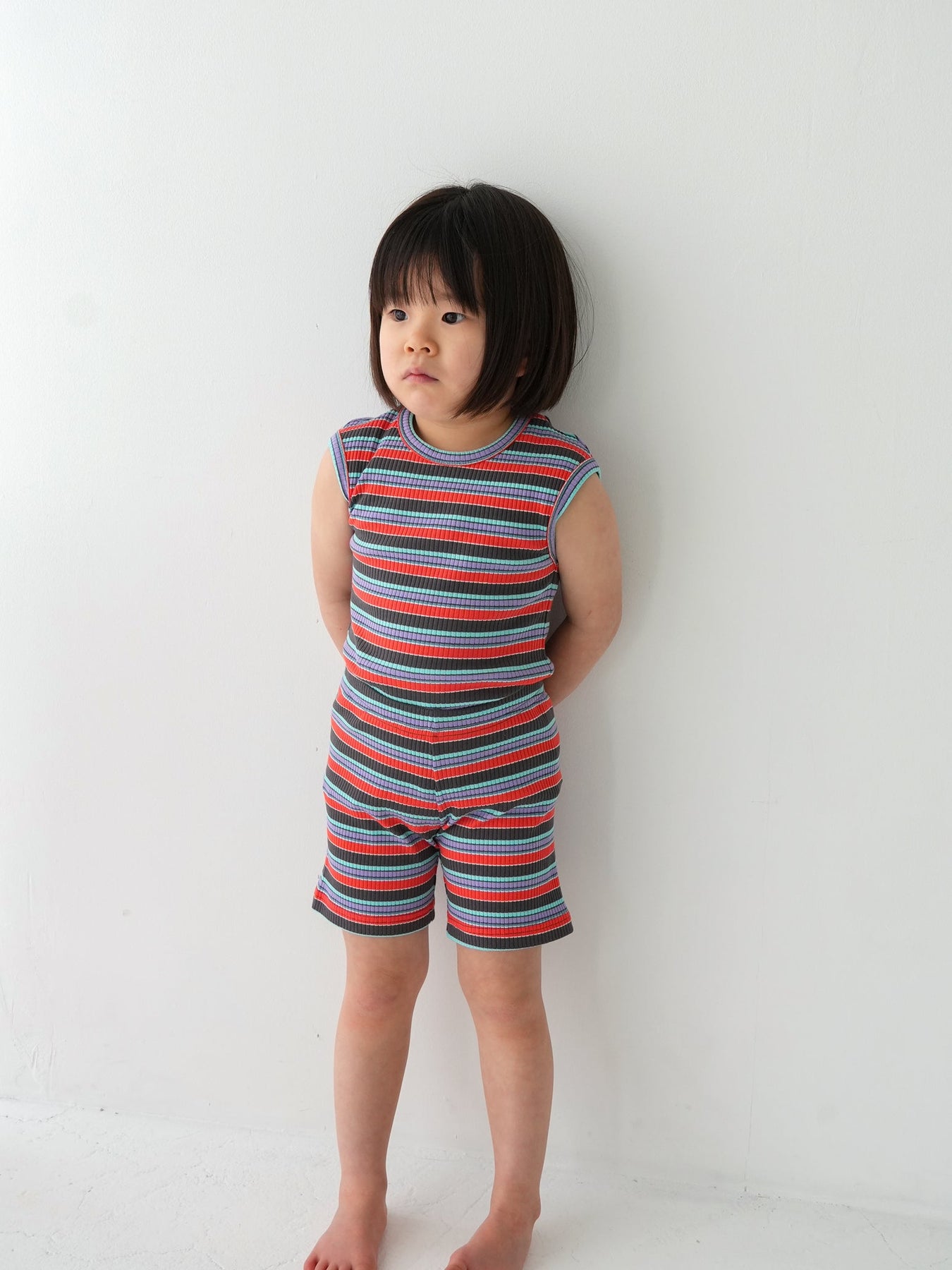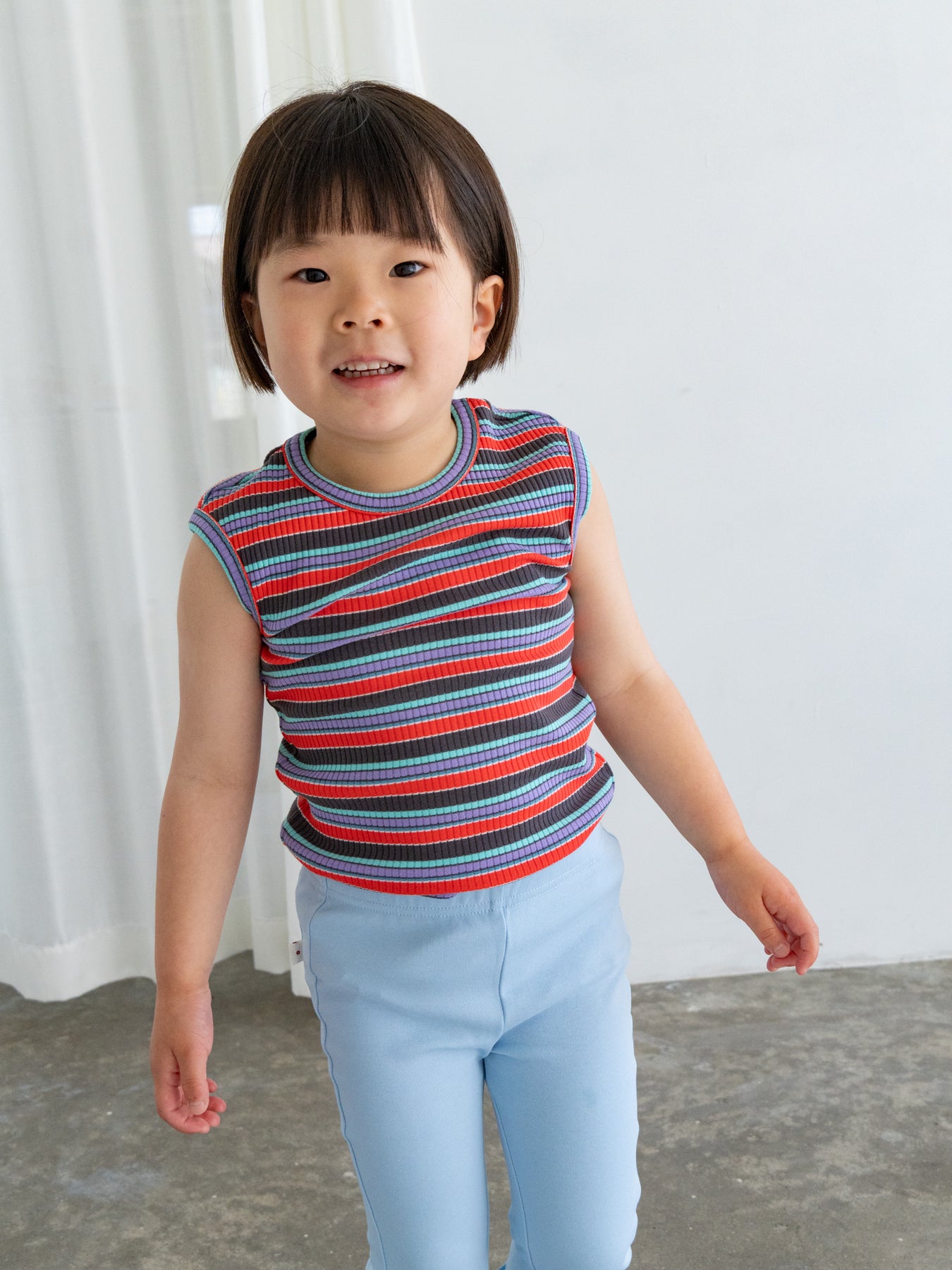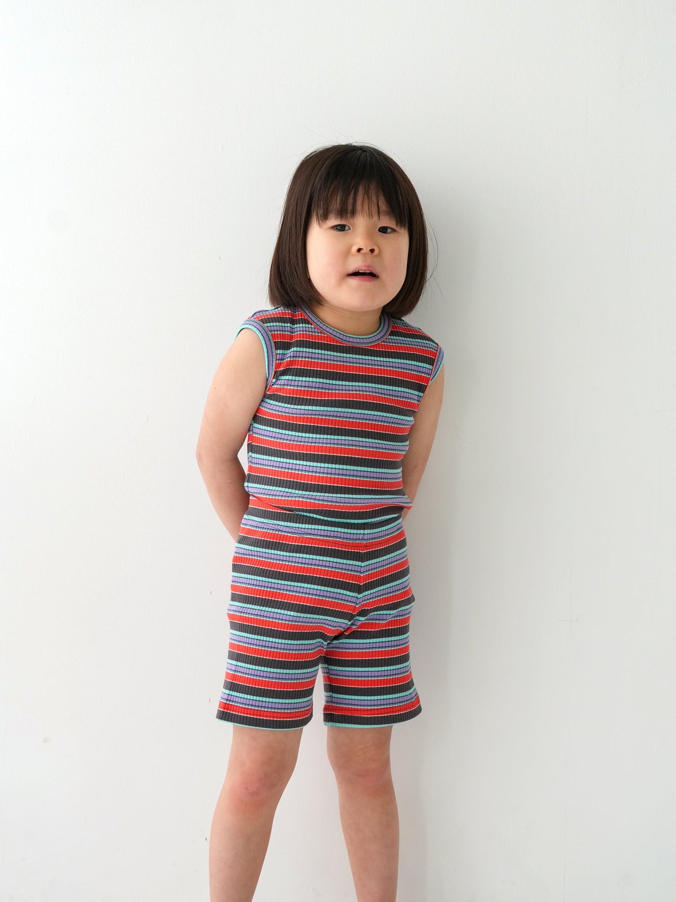 明るくポップな配色が目を引く、マルチストライプ柄のノースリーブトップス。夏らしい軽やかなデザインで、コーディネートの主役になる一枚です。
