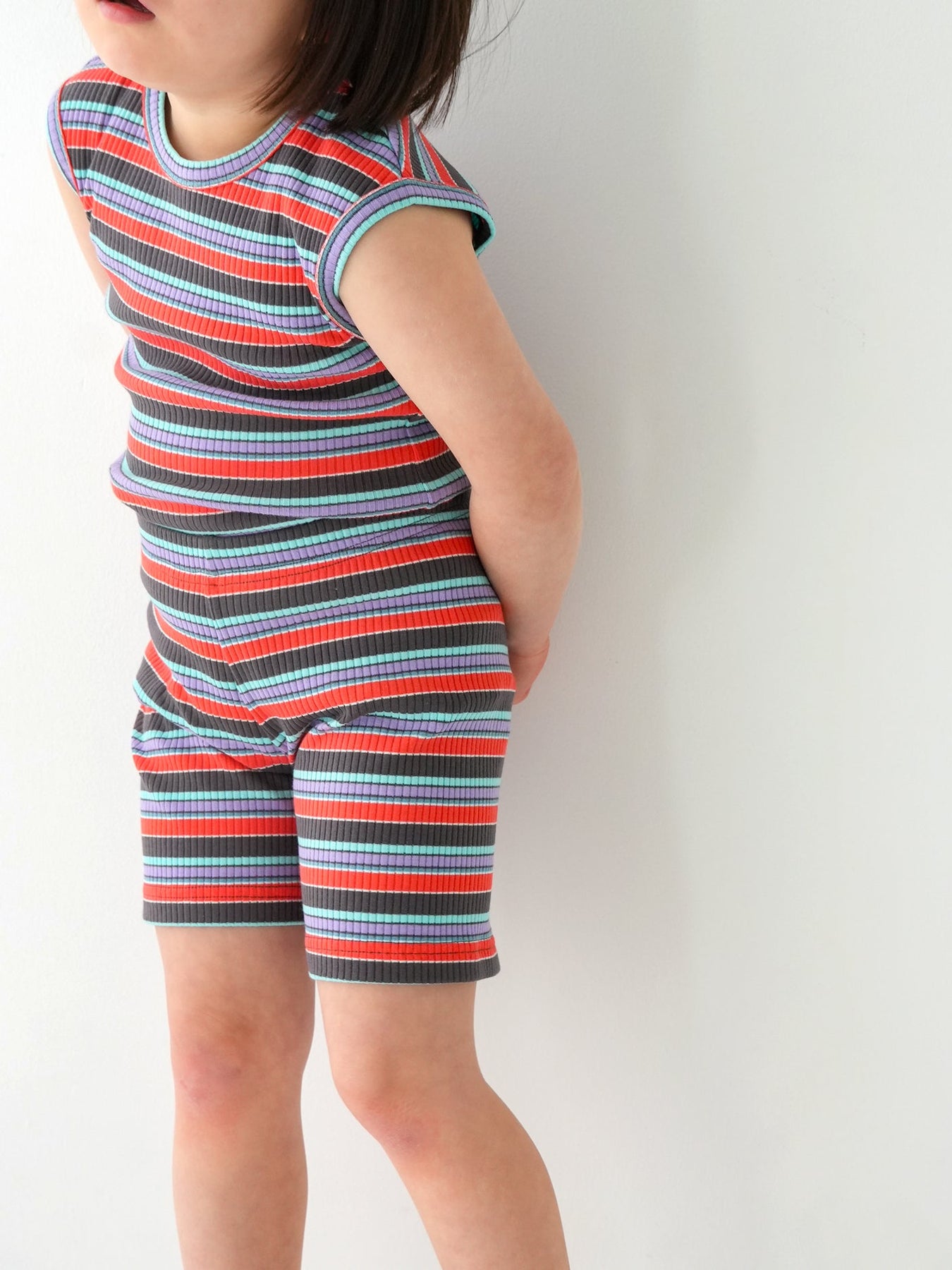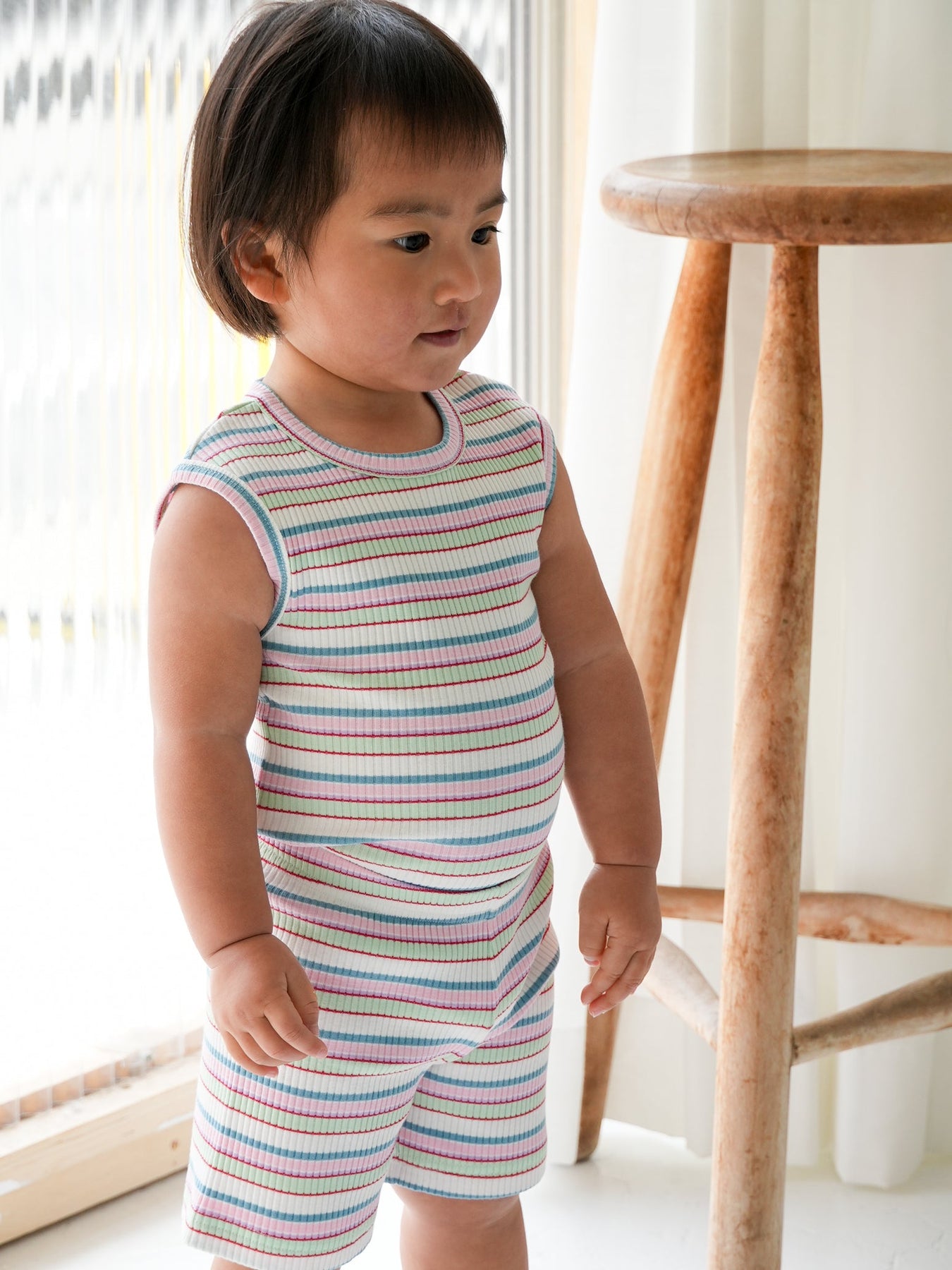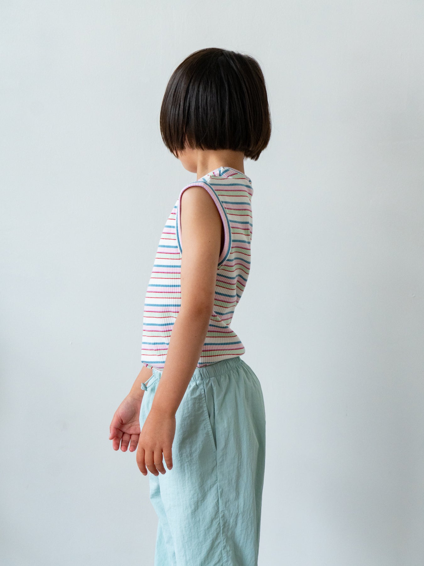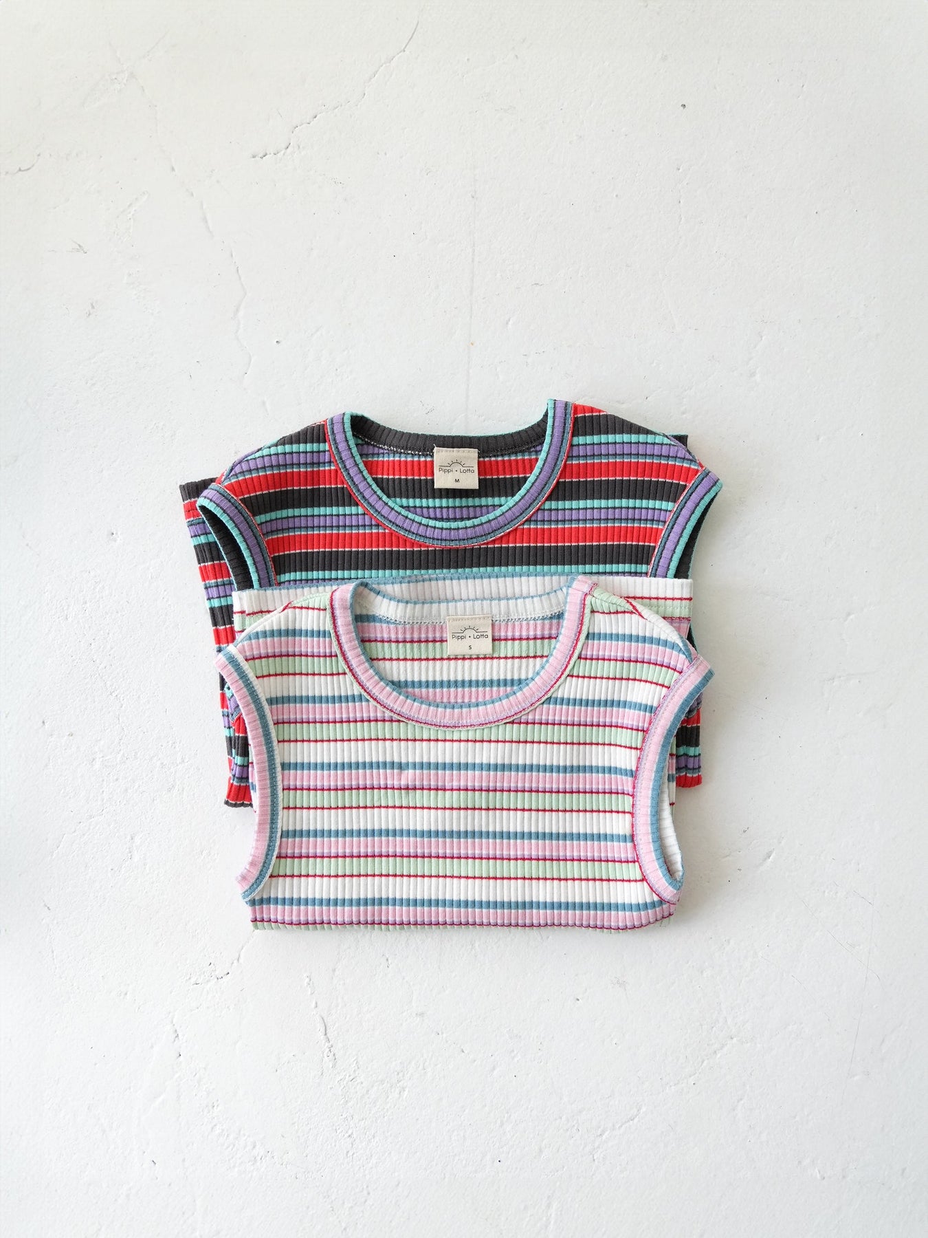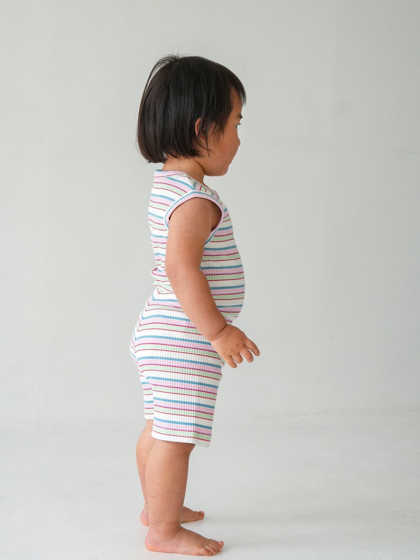 明るくポップな配色が目を引く、マルチストライプ柄のノースリーブトップス。夏らしい軽やかなデザインで、コーディネートの主役になる一枚です。