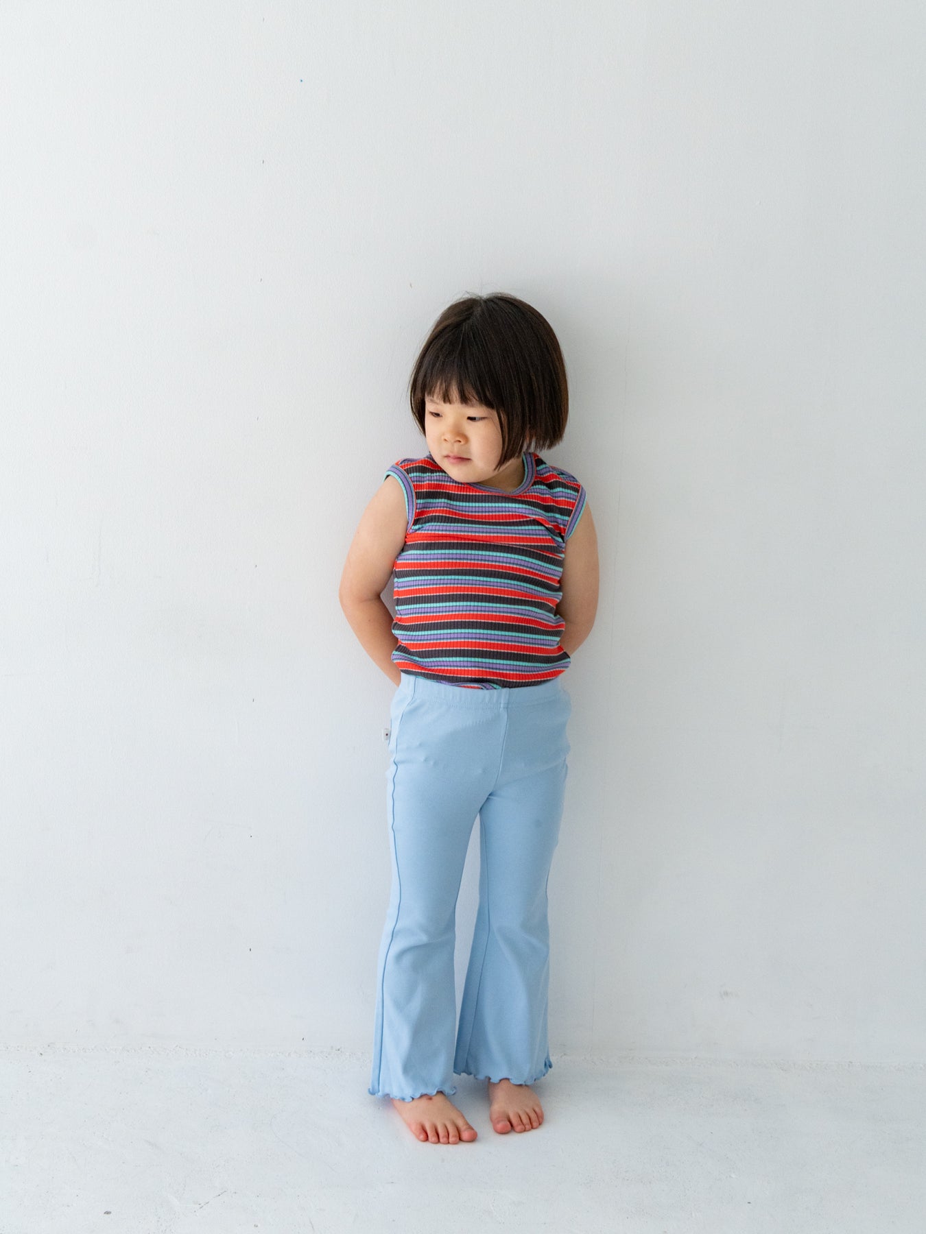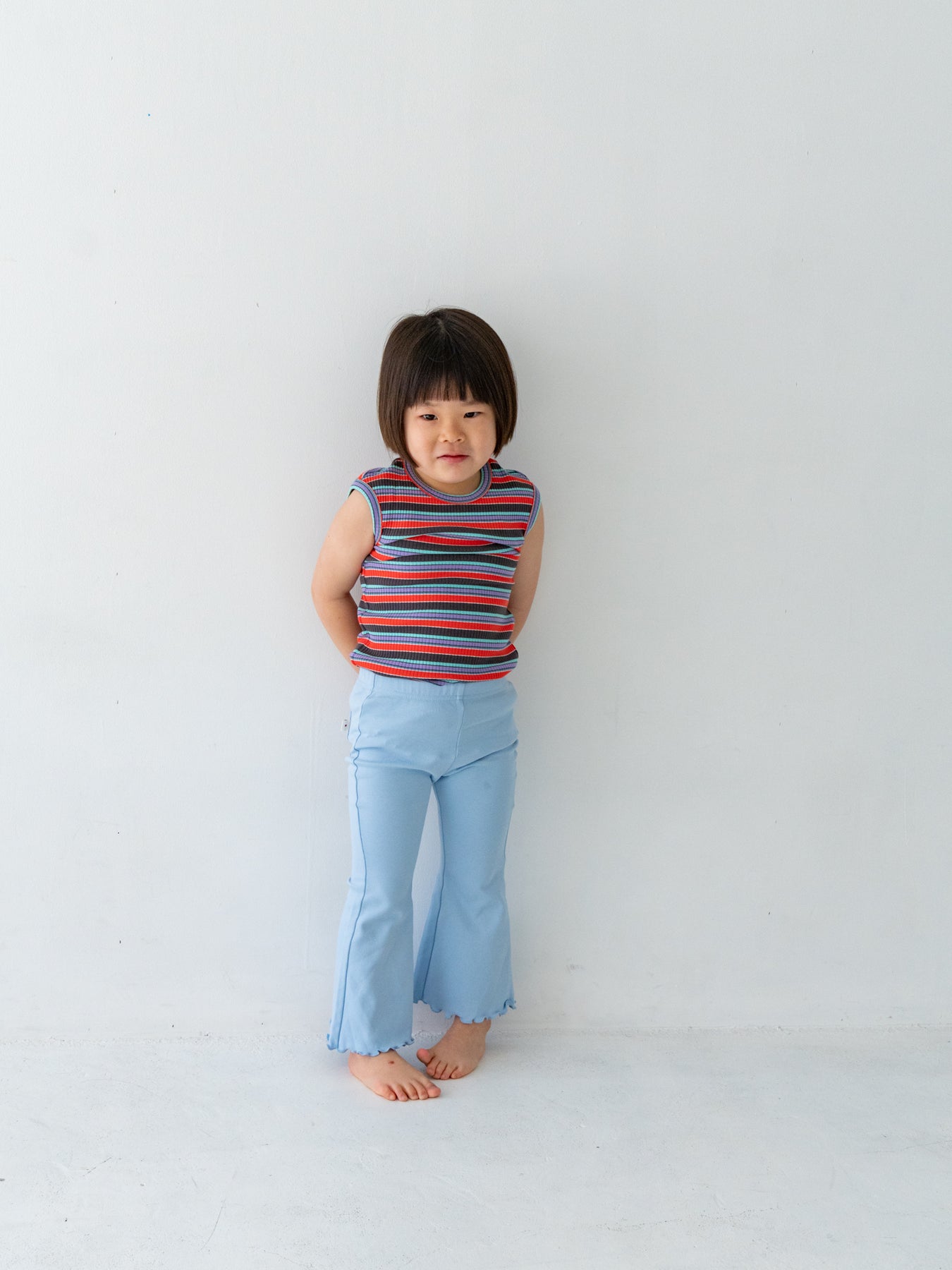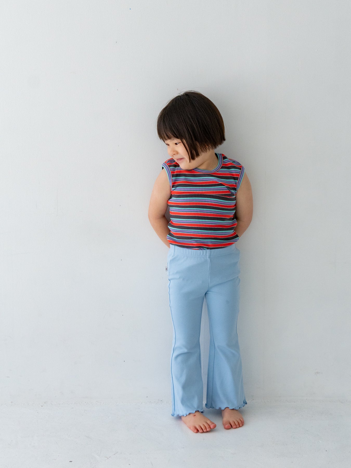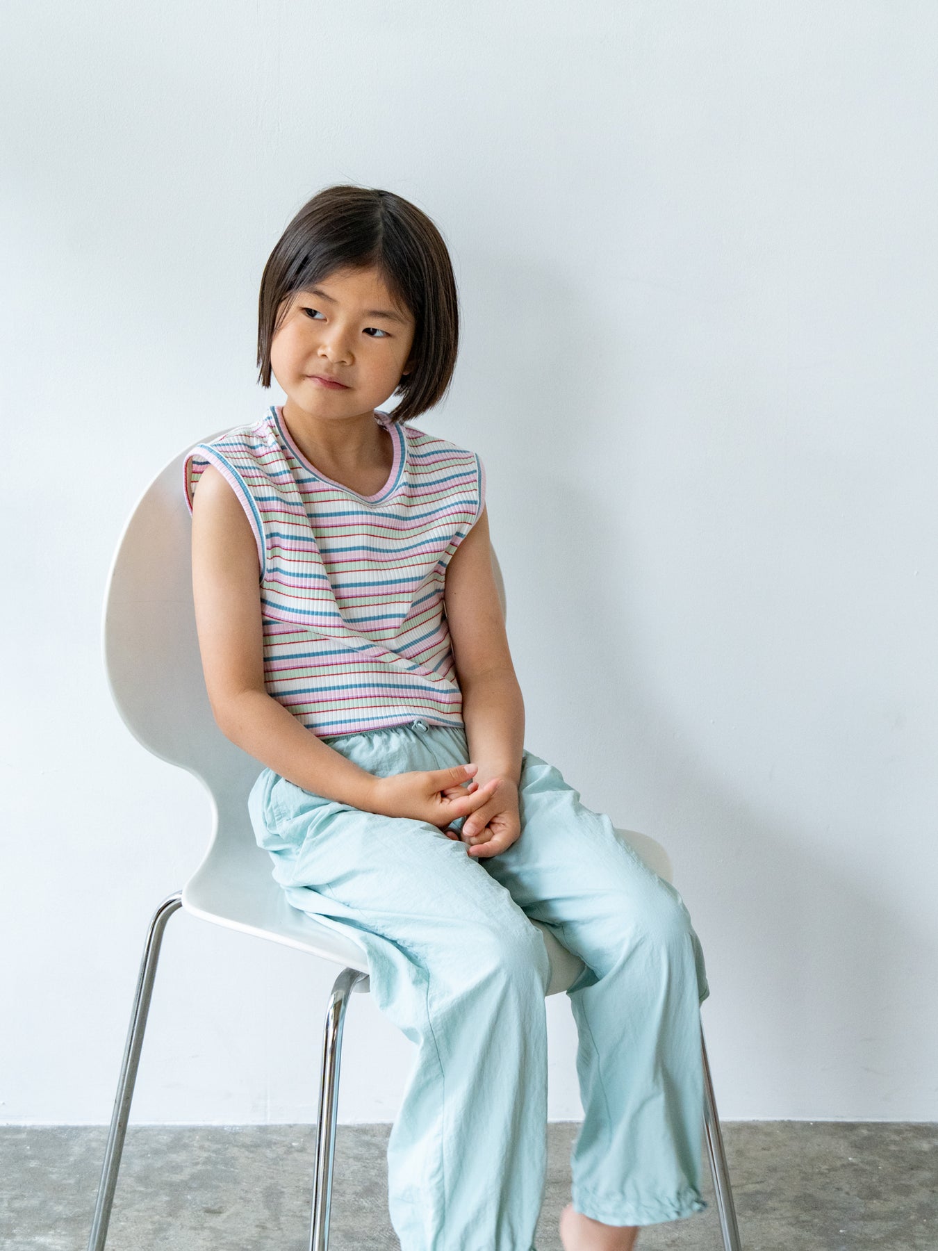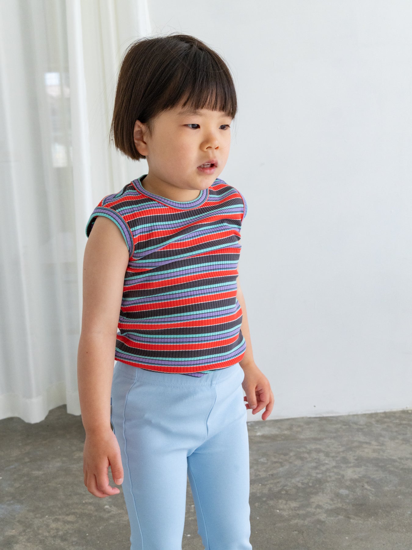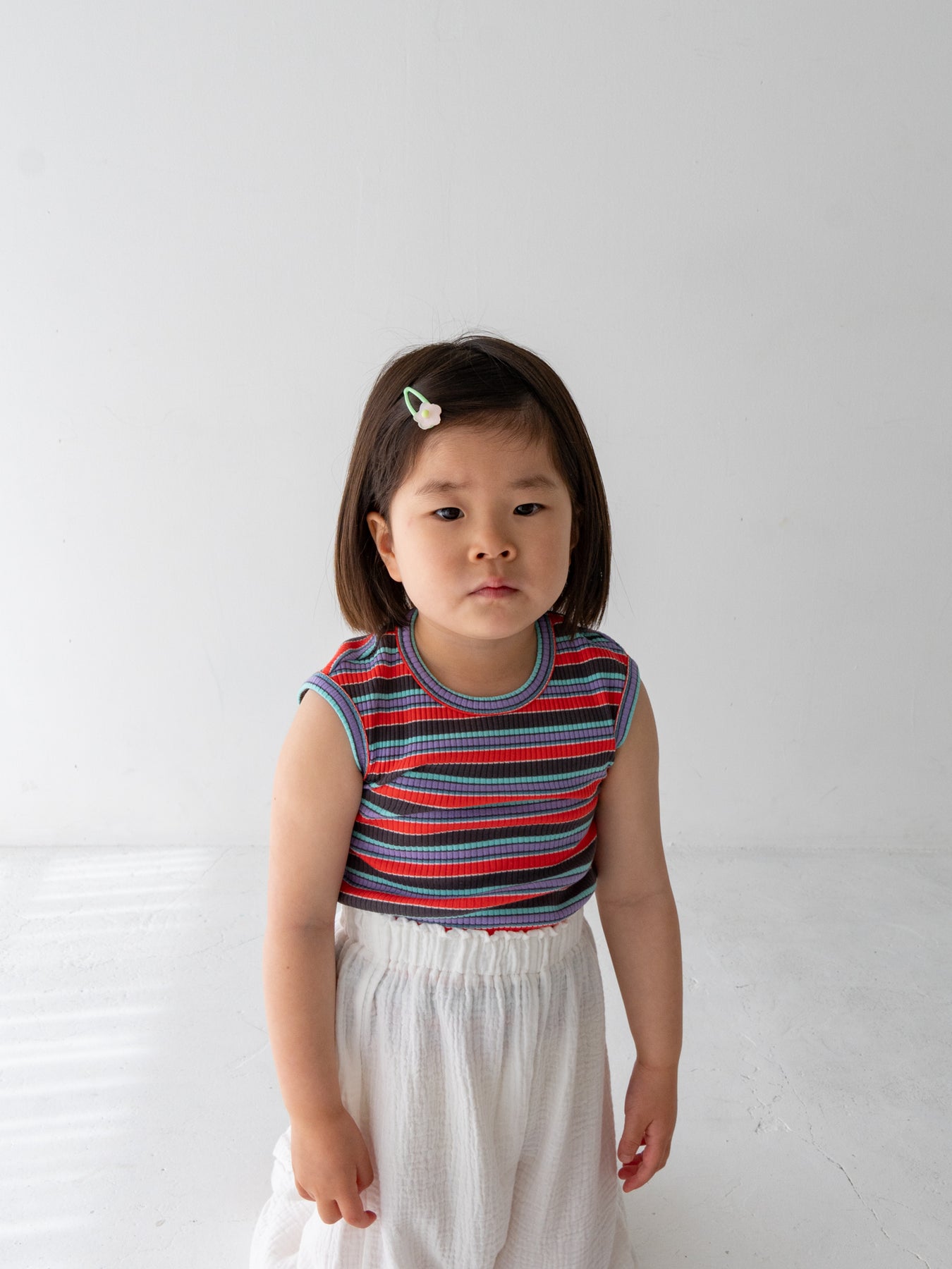 明るくポップな配色が目を引く、マルチストライプ柄のノースリーブトップス。夏らしい軽やかなデザインで、コーディネートの主役になる一枚です。