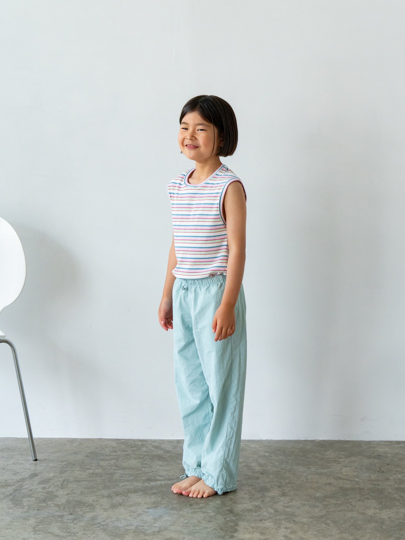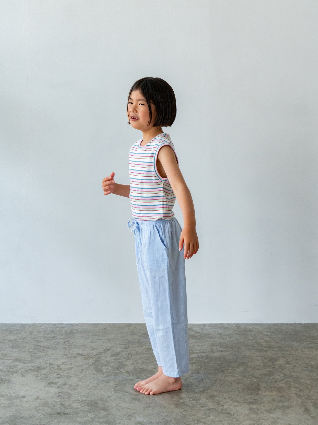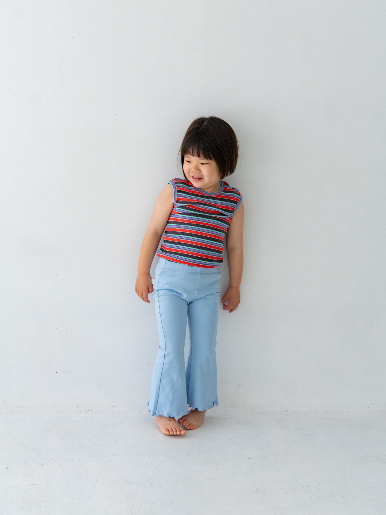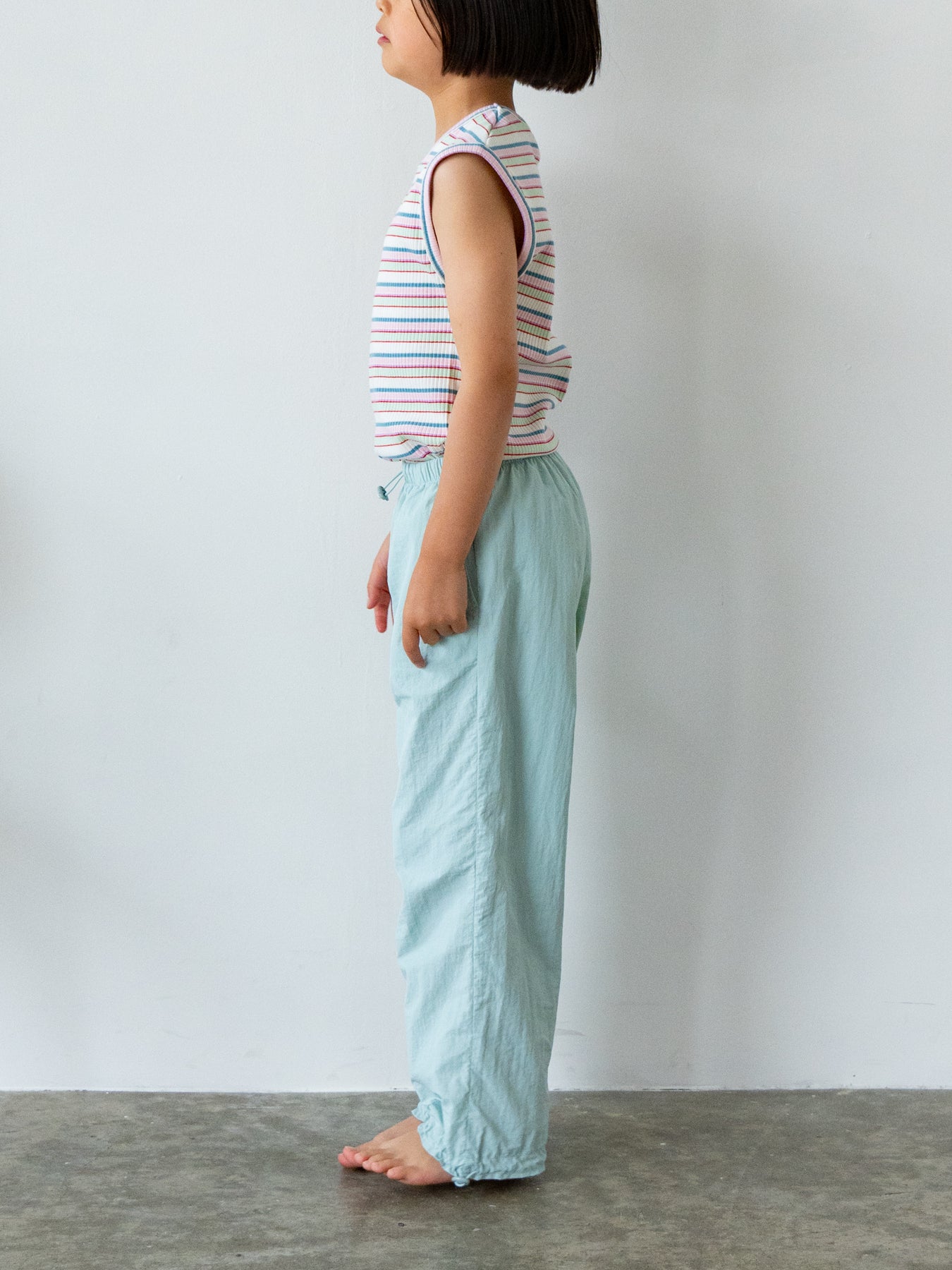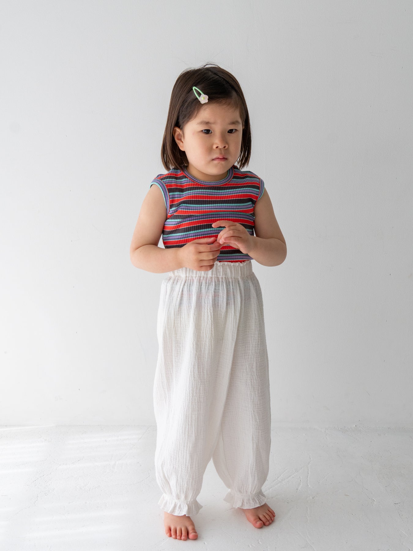 明るくポップな配色が目を引く、マルチストライプ柄のノースリーブトップス。夏らしい軽やかなデザインで、コーディネートの主役になる一枚です。