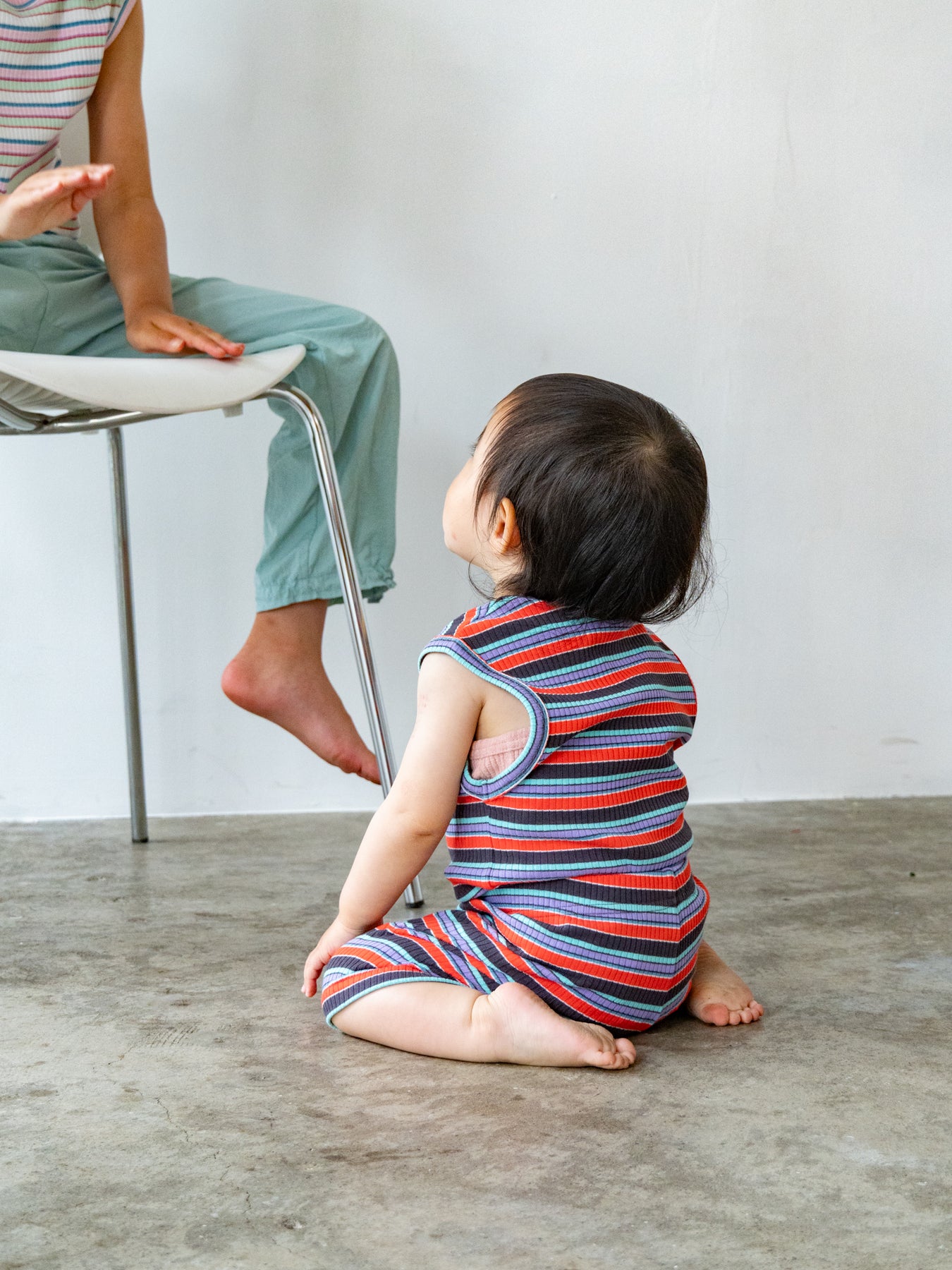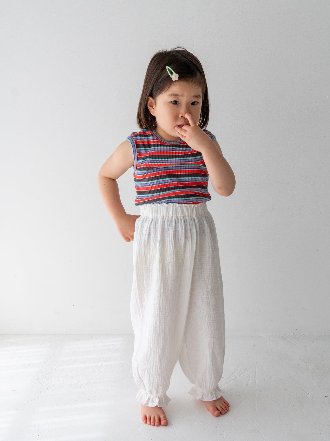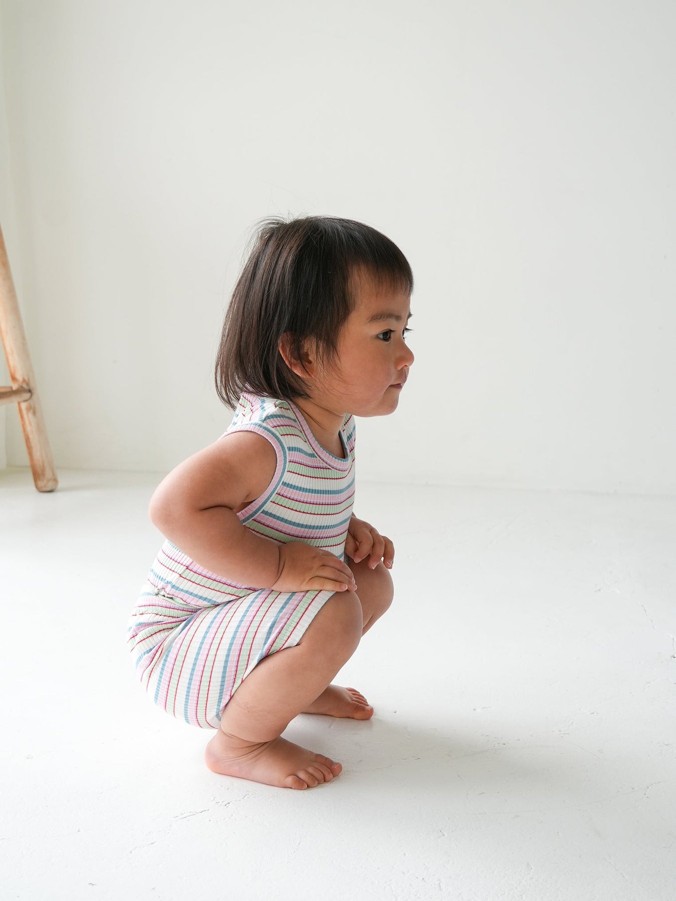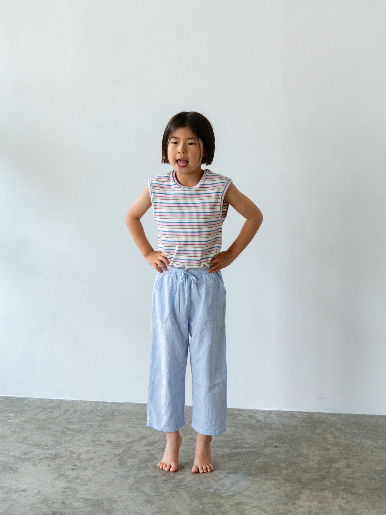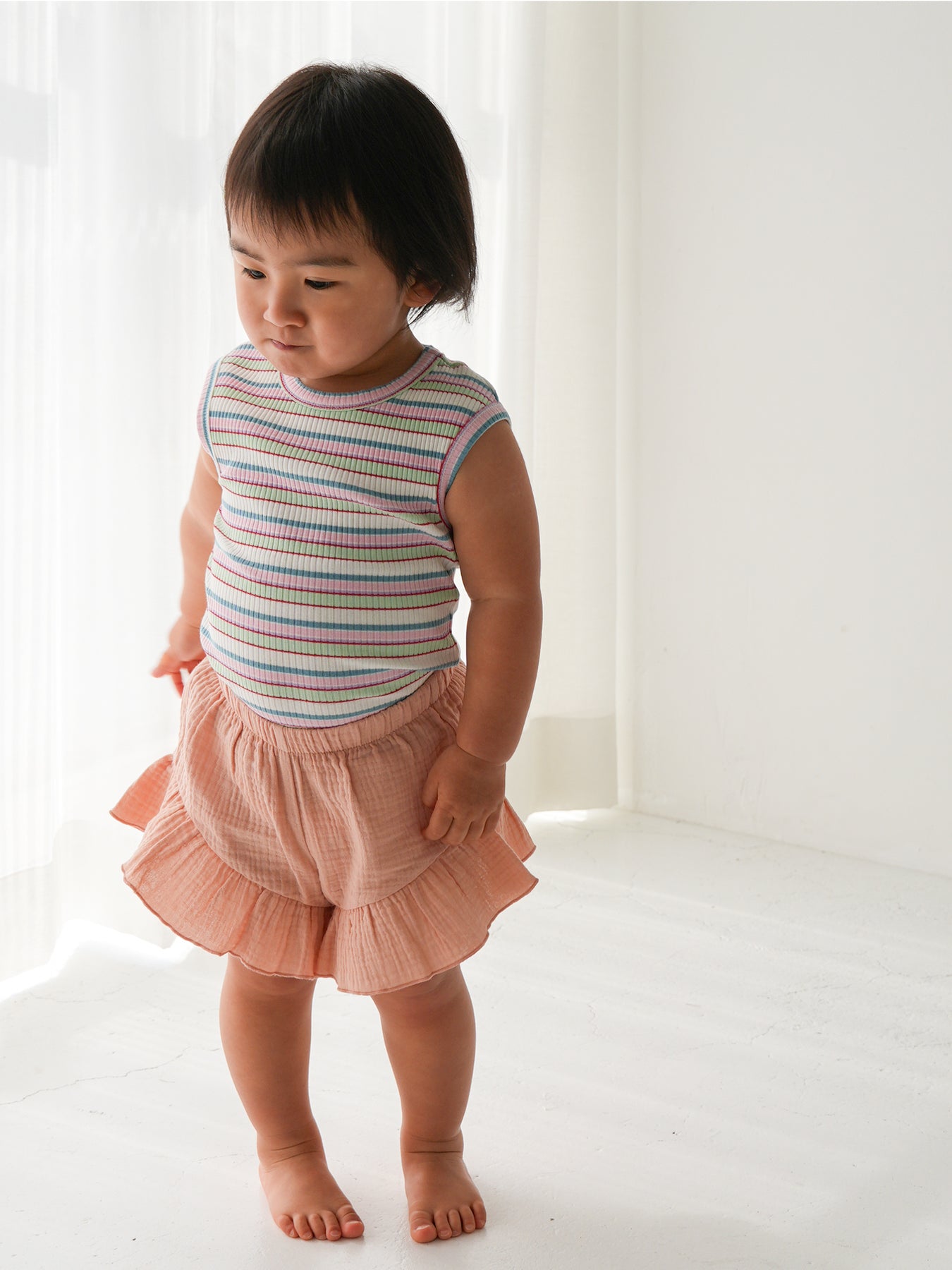 明るくポップな配色が目を引く、マルチストライプ柄のノースリーブトップス。夏らしい軽やかなデザインで、コーディネートの主役になる一枚です。