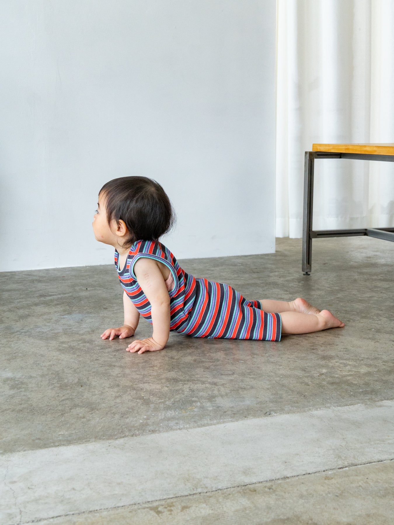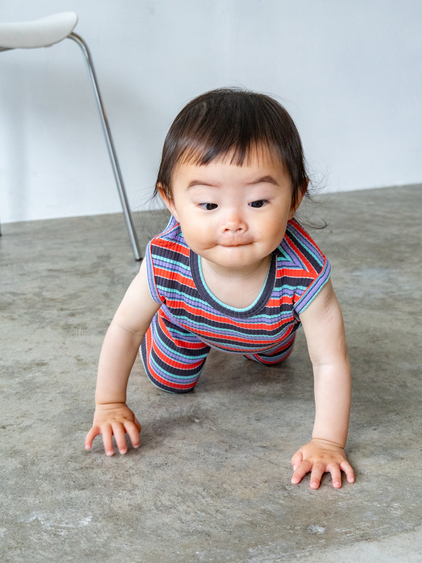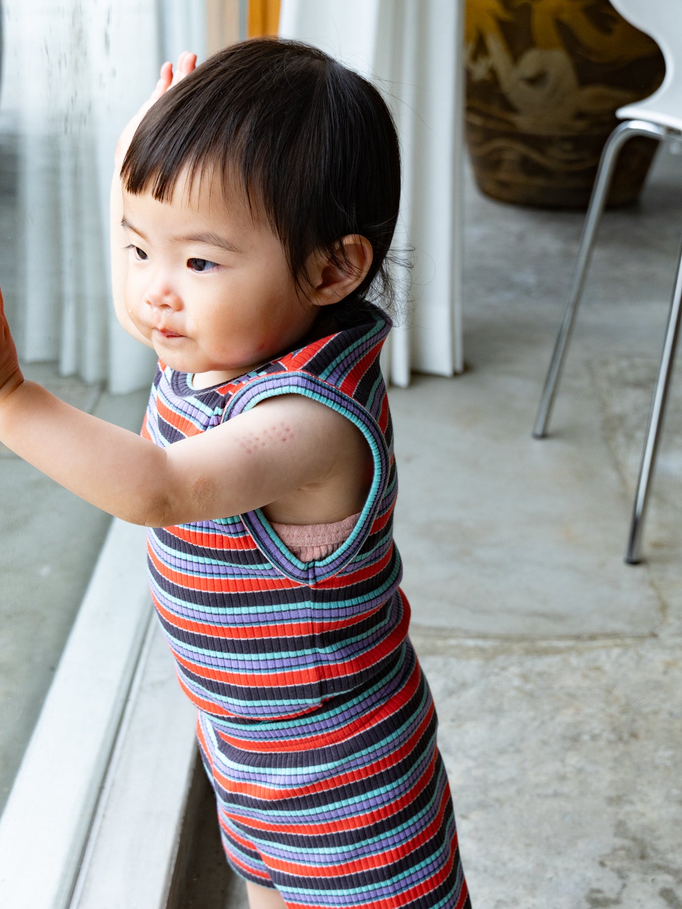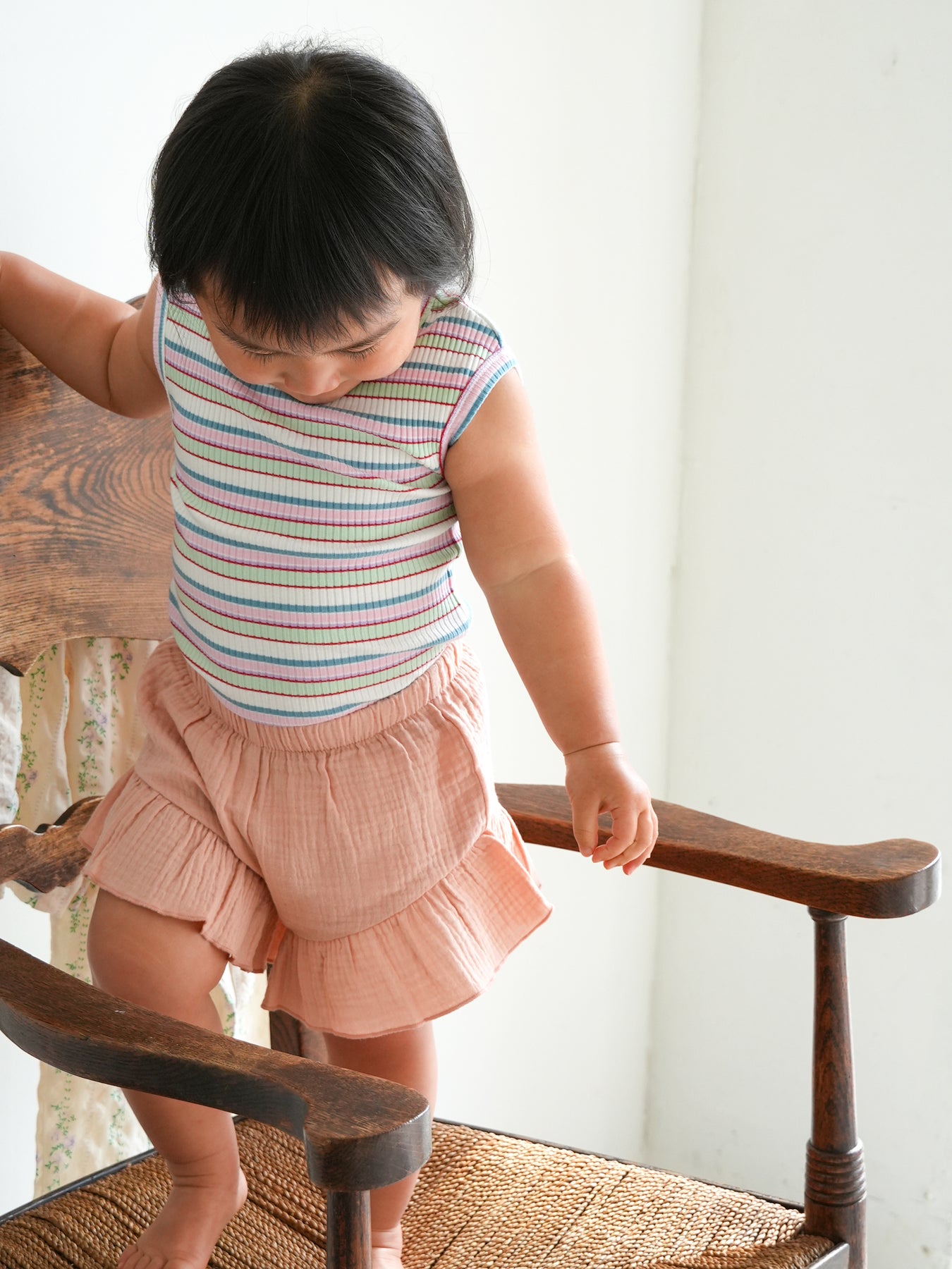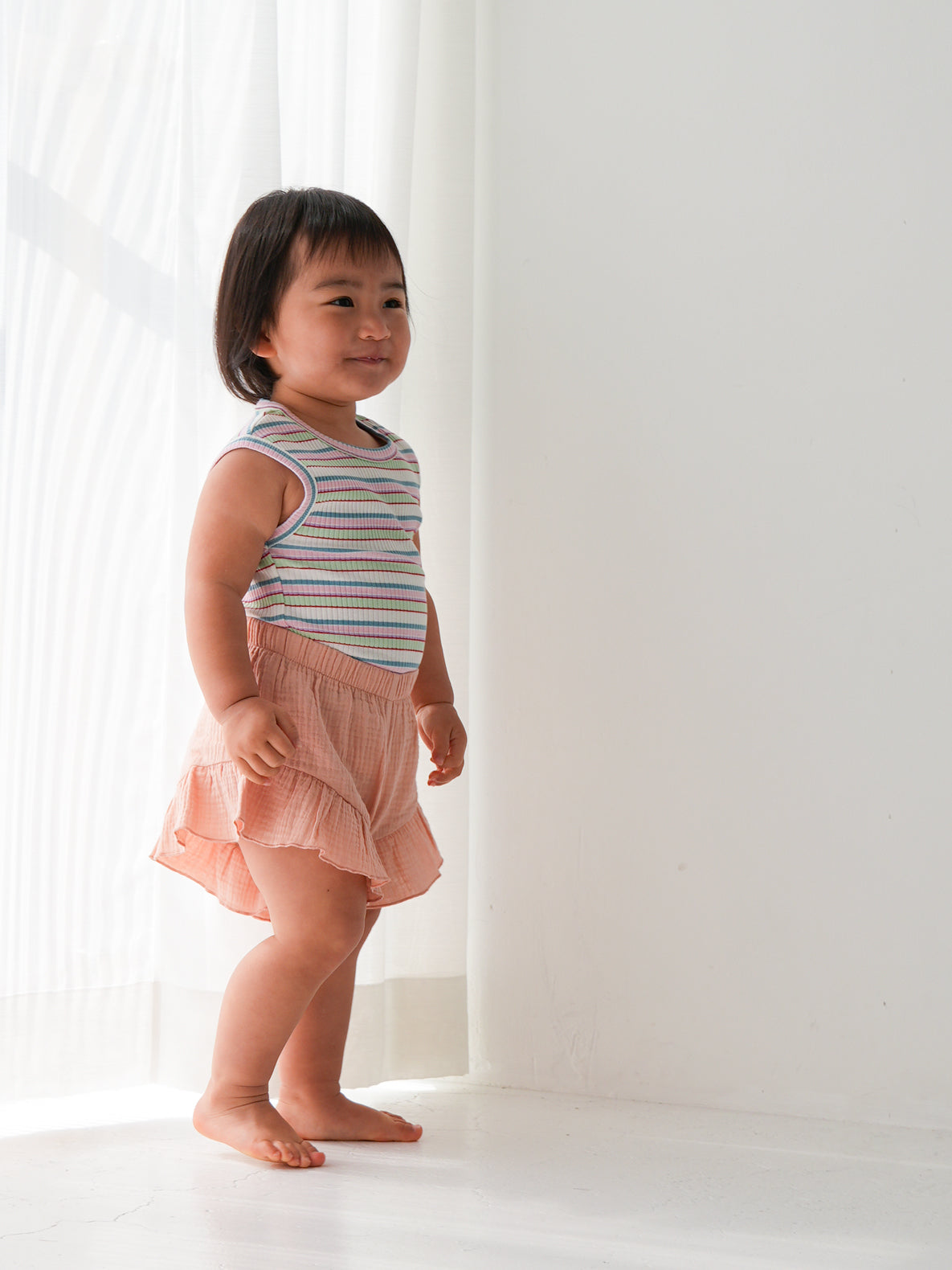 明るくポップな配色が目を引く、マルチストライプ柄のノースリーブトップス。夏らしい軽やかなデザインで、コーディネートの主役になる一枚です。