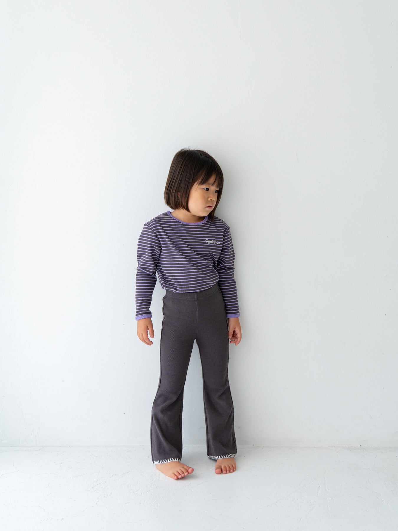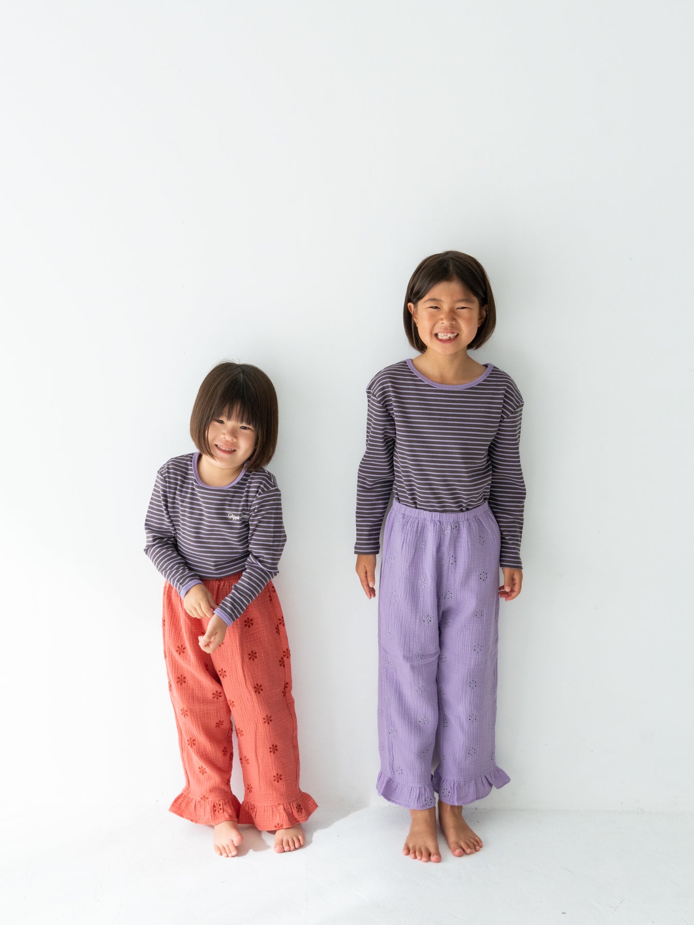 袖口と首まわりに施されたカラーパイピングと、胸元にさりげなく入ったロゴ刺繍がポイント。