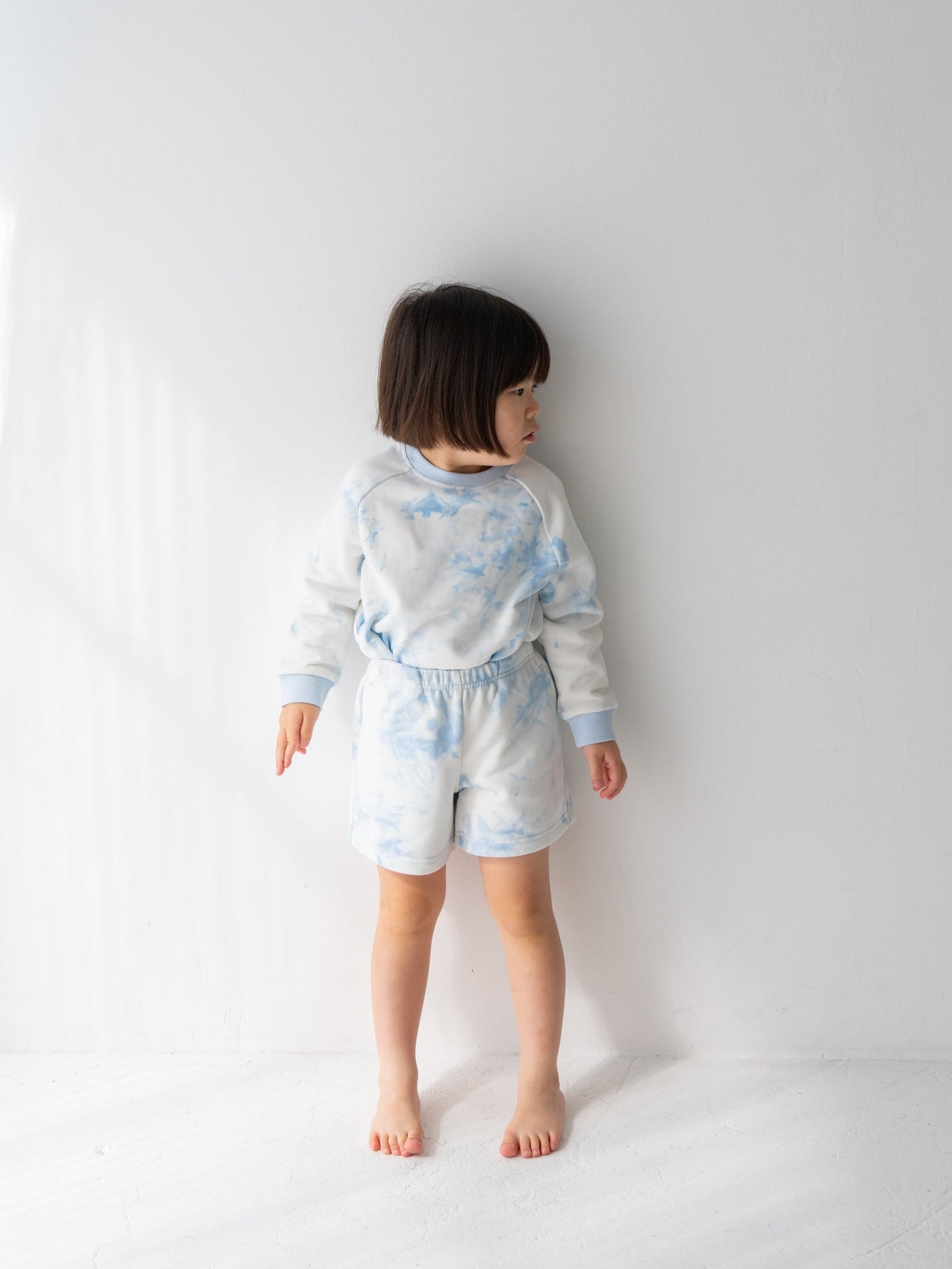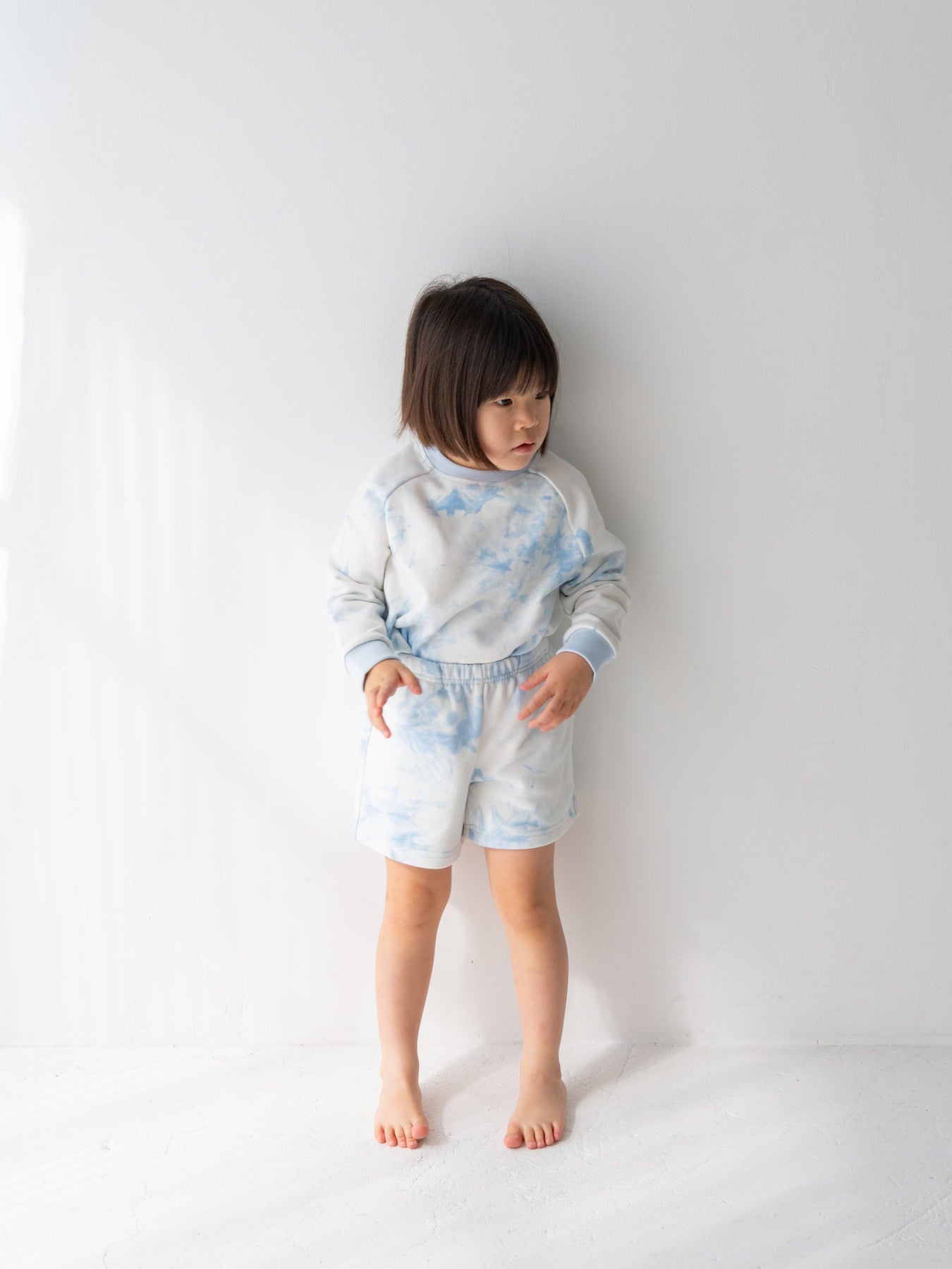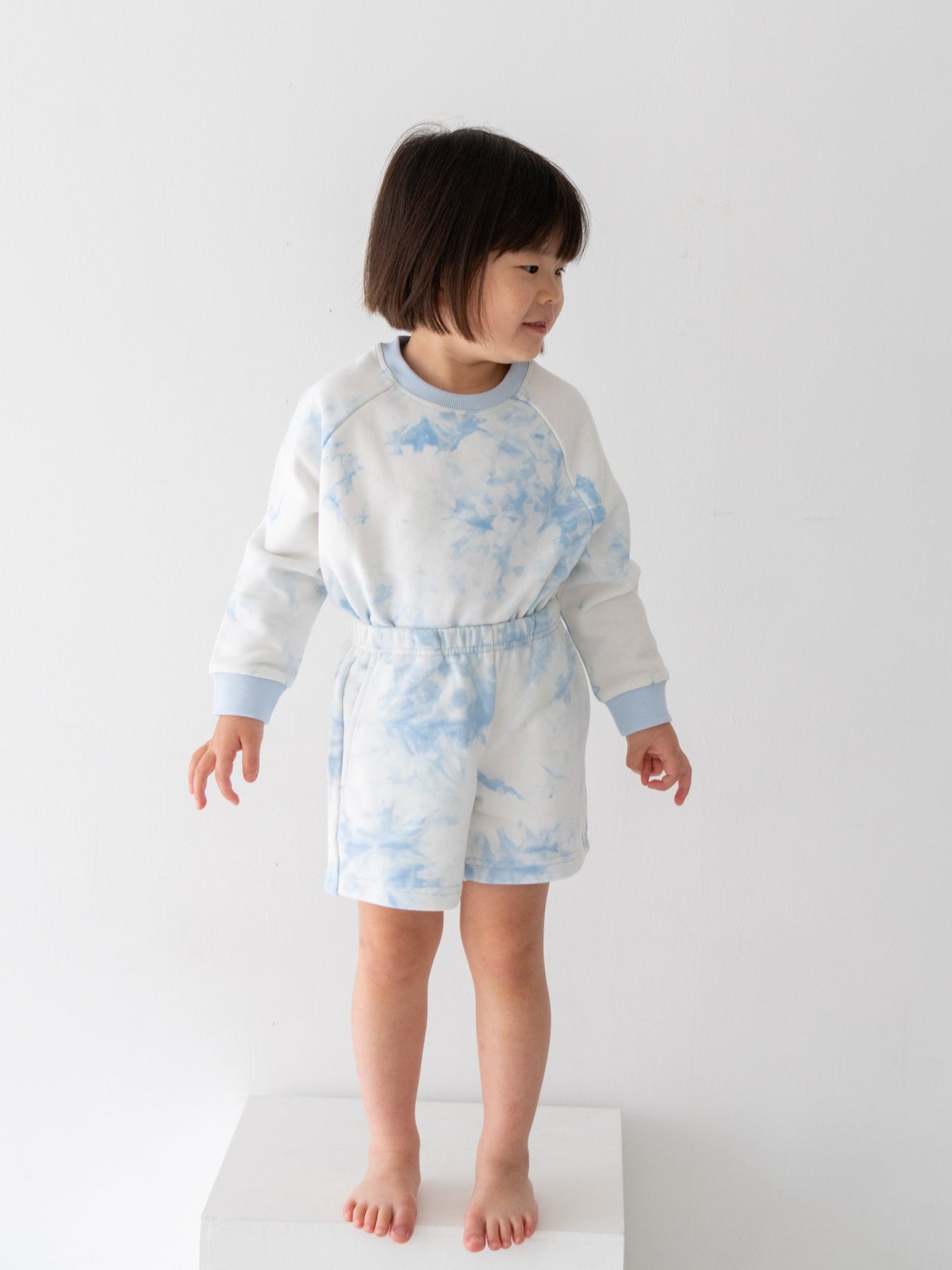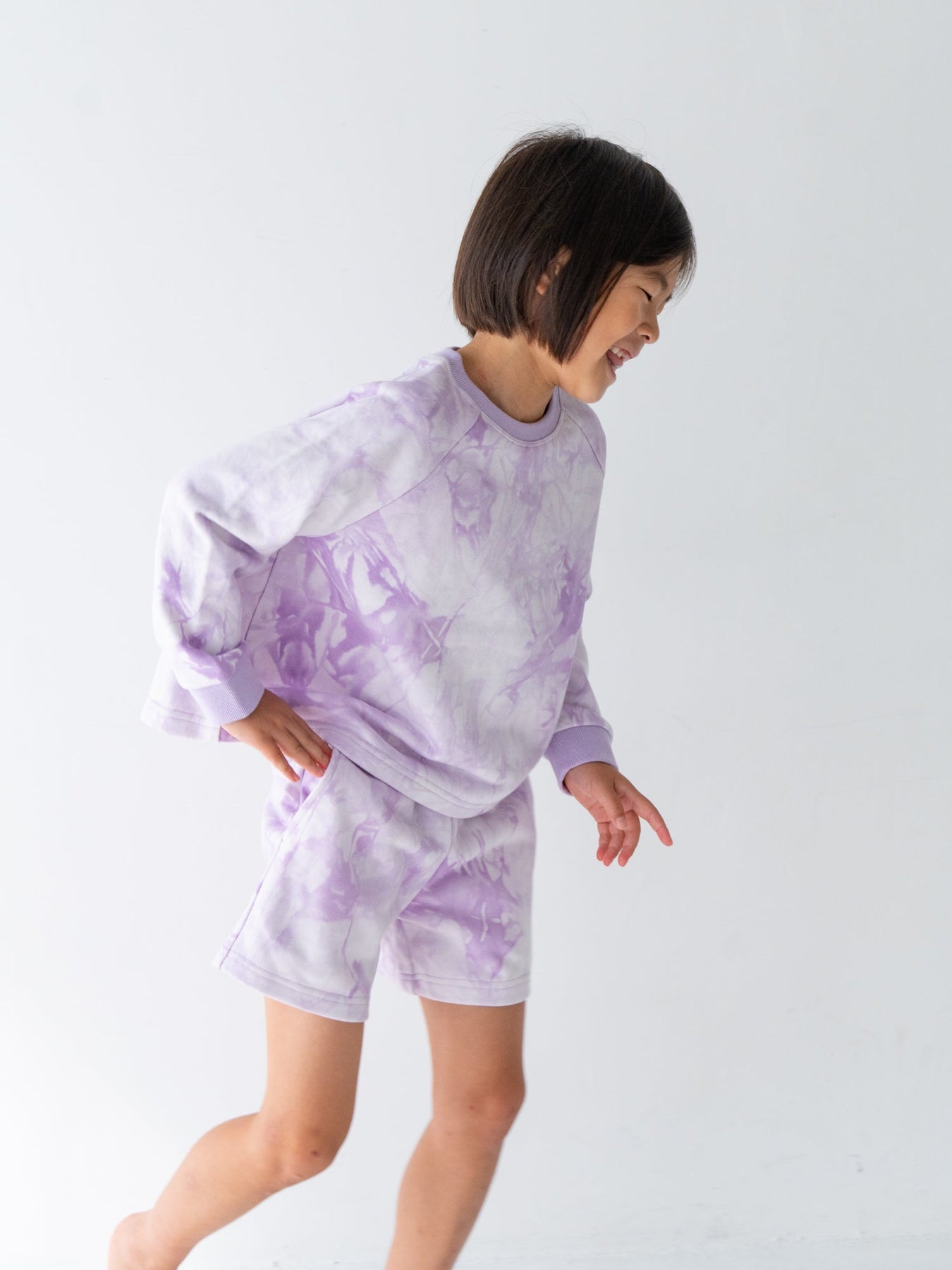 デニムなどのベーシックなボトムスはもちろん、お揃いのタイダイショーツとのセットアップスタイルもおすすめ。着回しやすさと華やかさを両立した、デイリーに頼れるスウェットです。