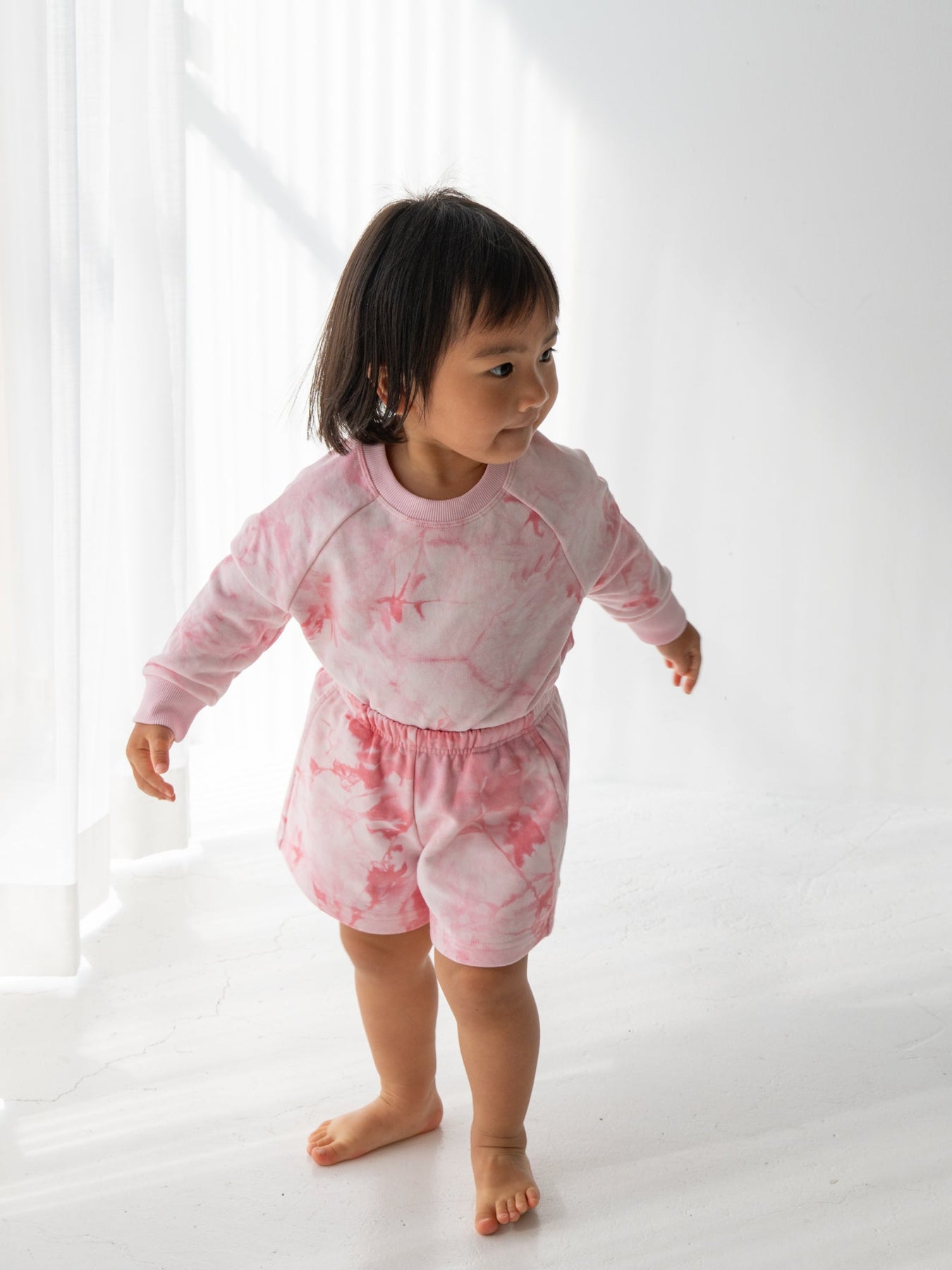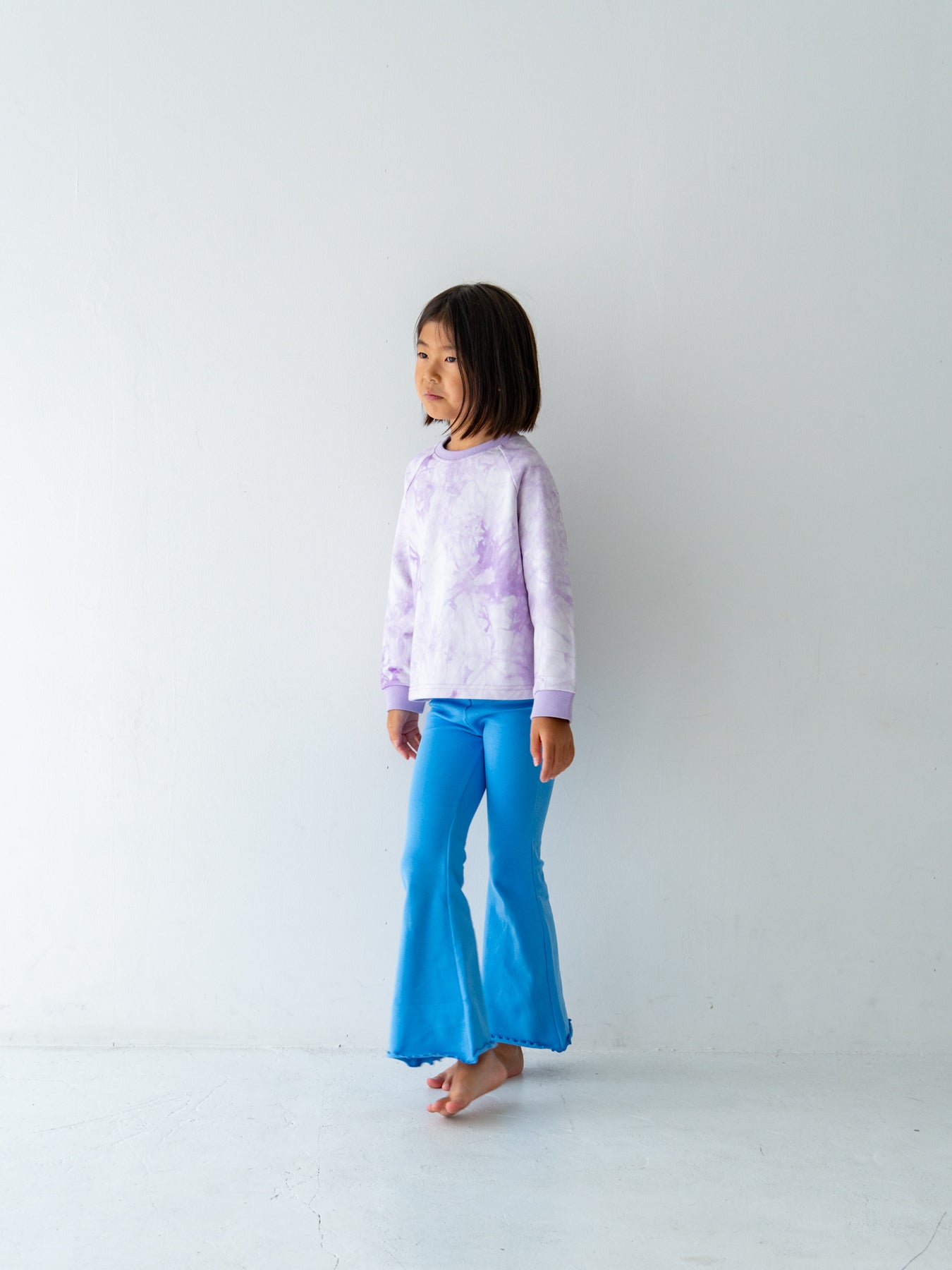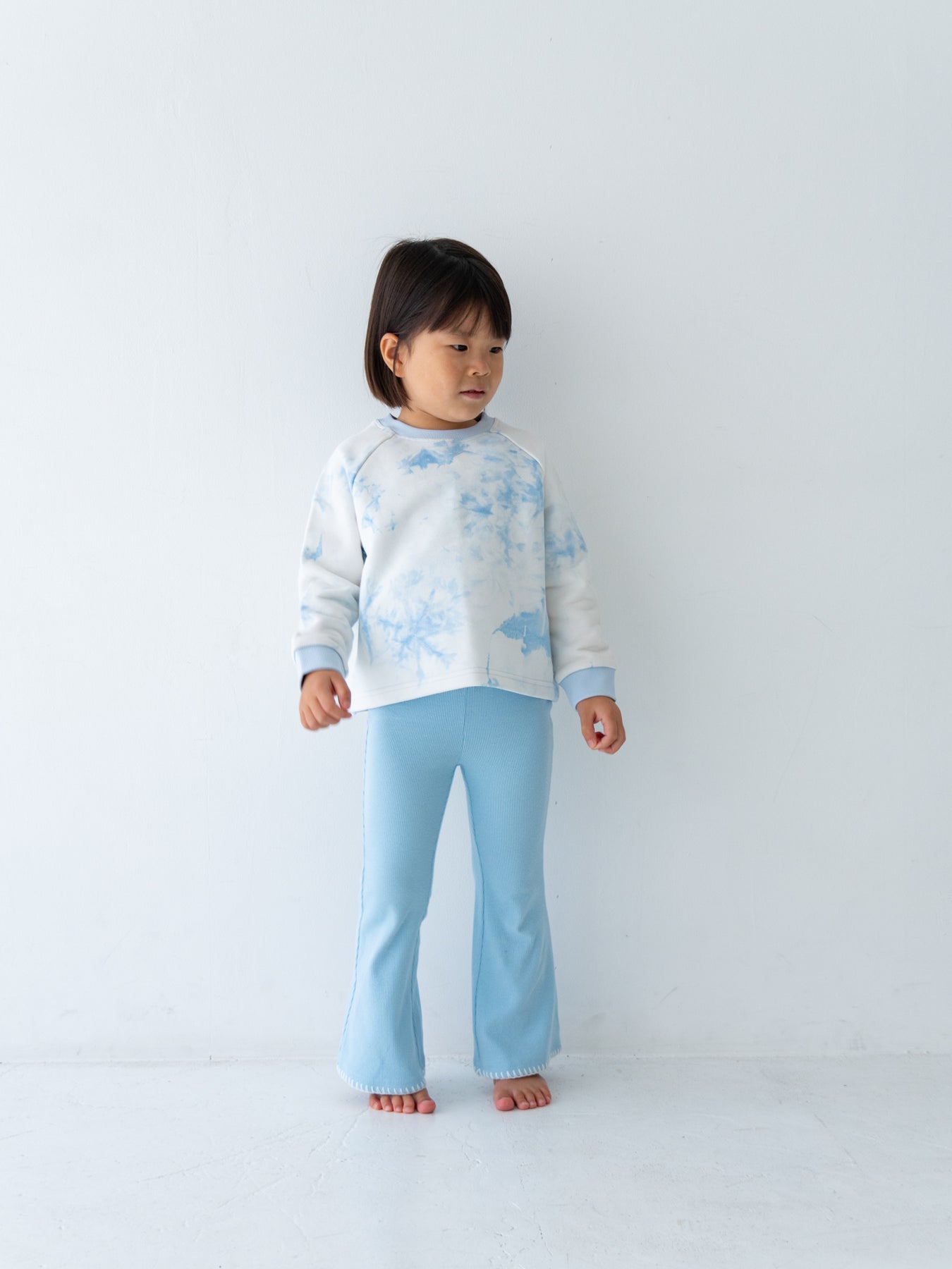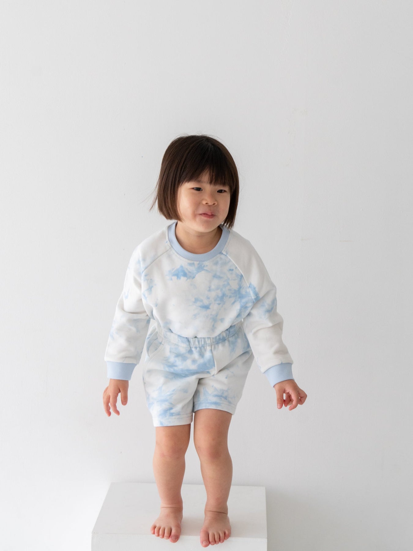 デニムなどのベーシックなボトムスはもちろん、お揃いのタイダイショーツとのセットアップスタイルもおすすめ。着回しやすさと華やかさを両立した、デイリーに頼れるスウェットです。