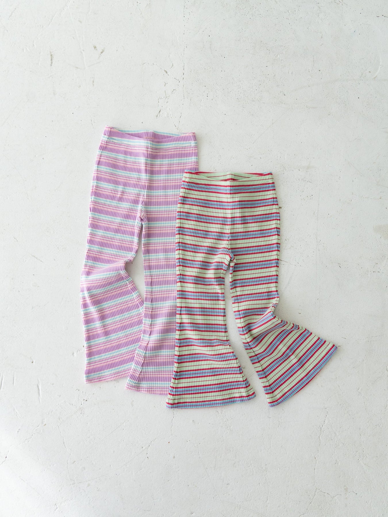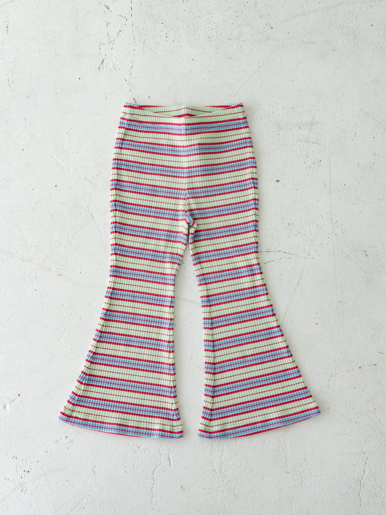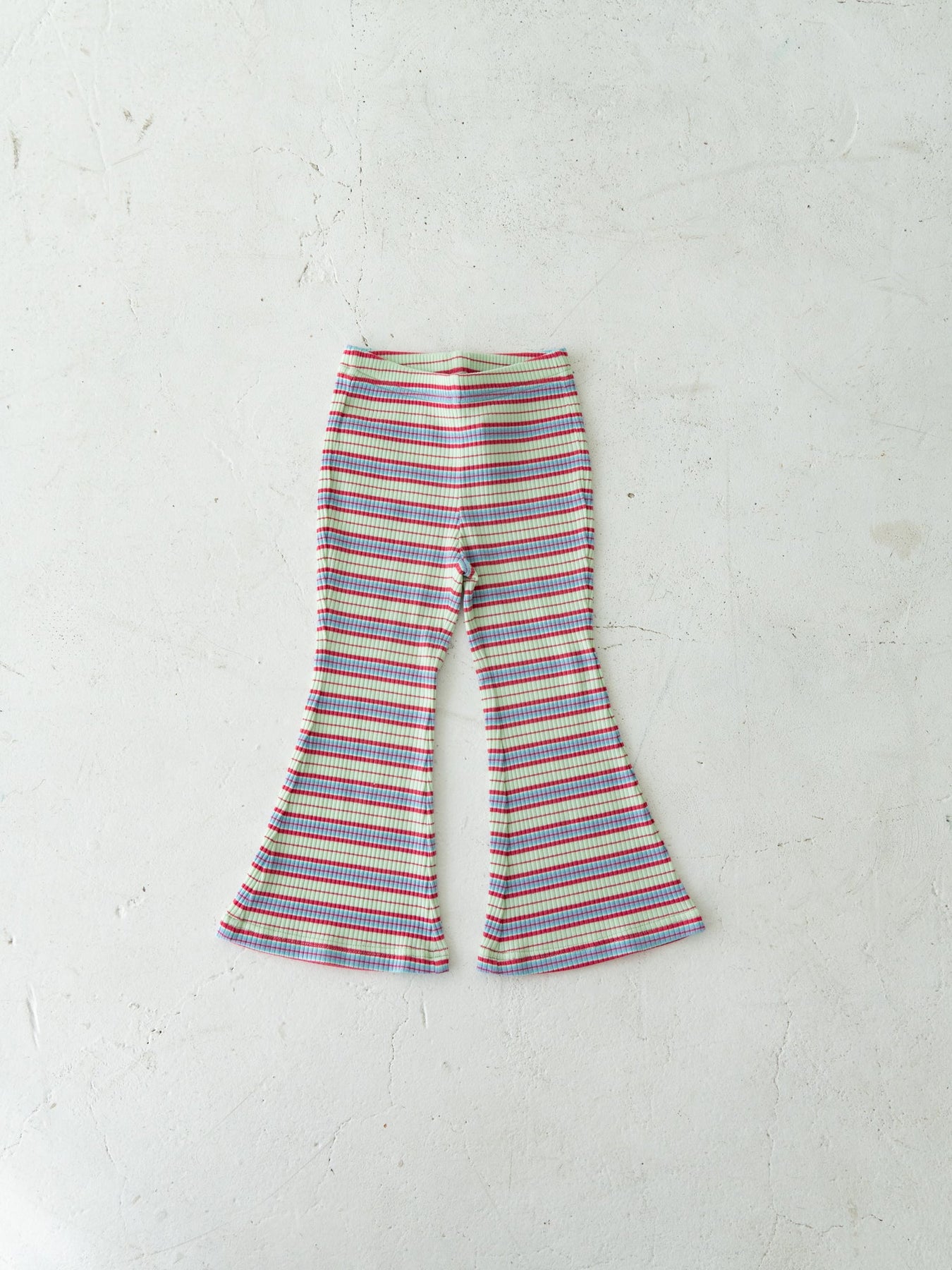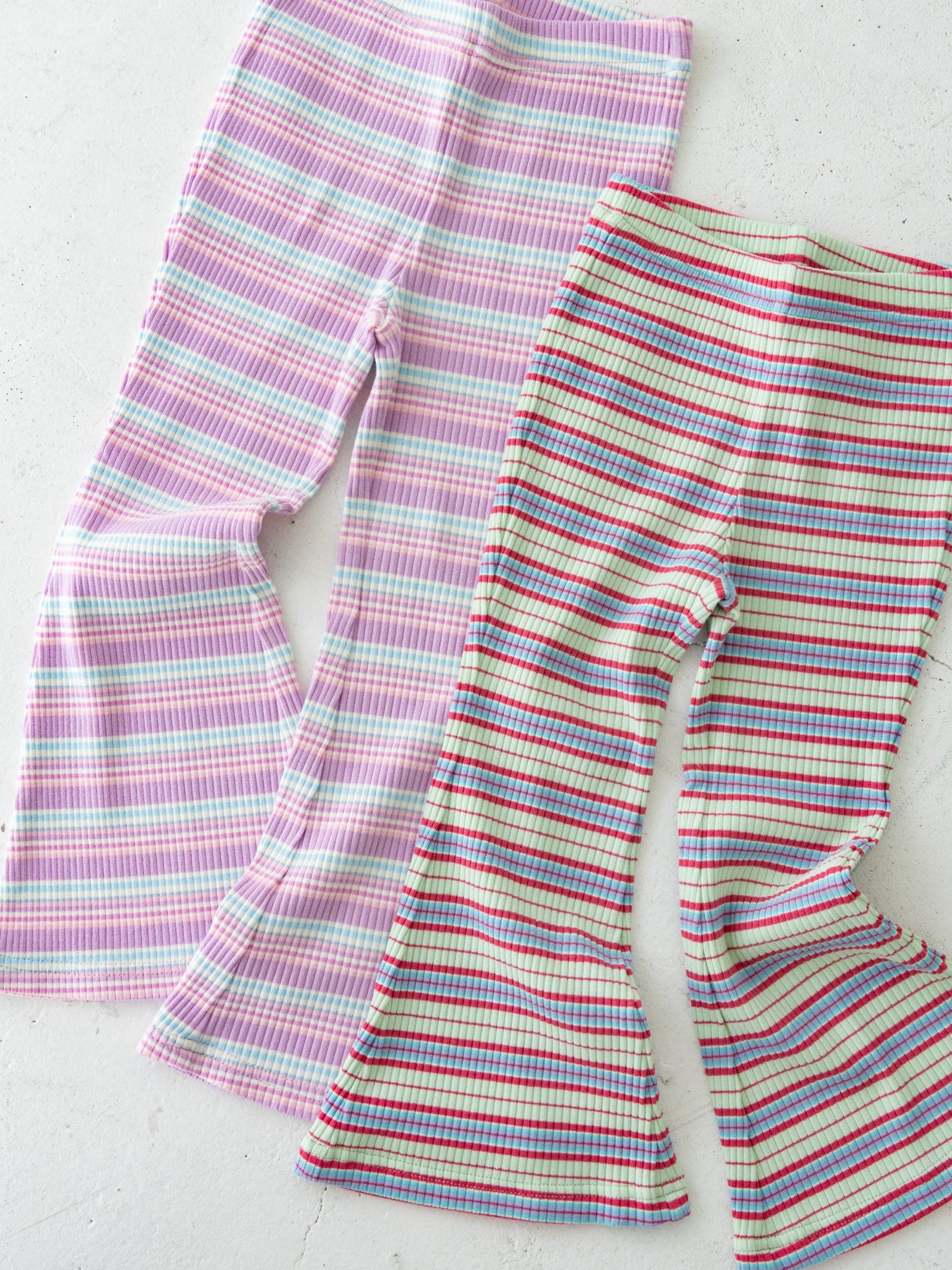 カラフルでポップなストライプが目を惹くフレアパンツ。