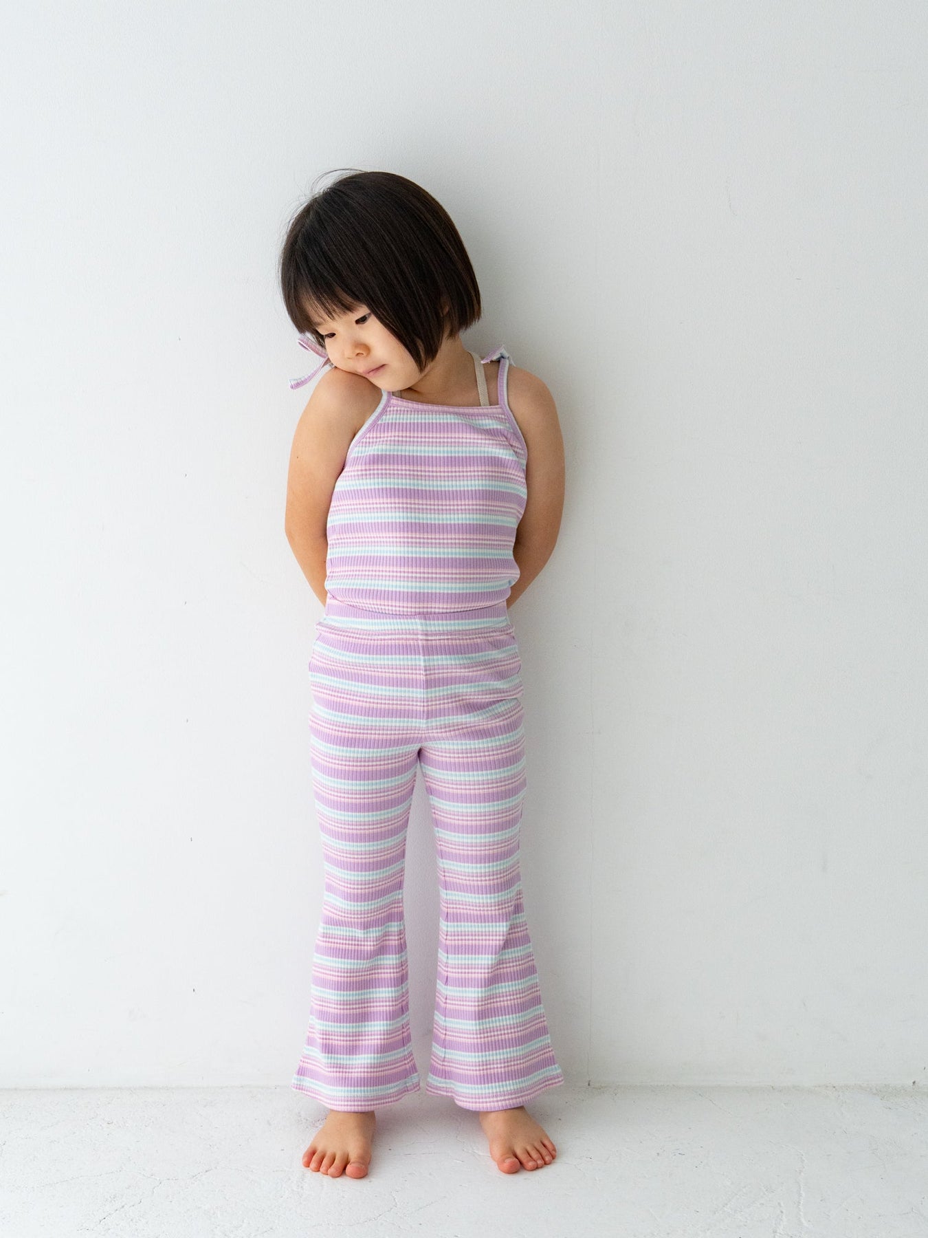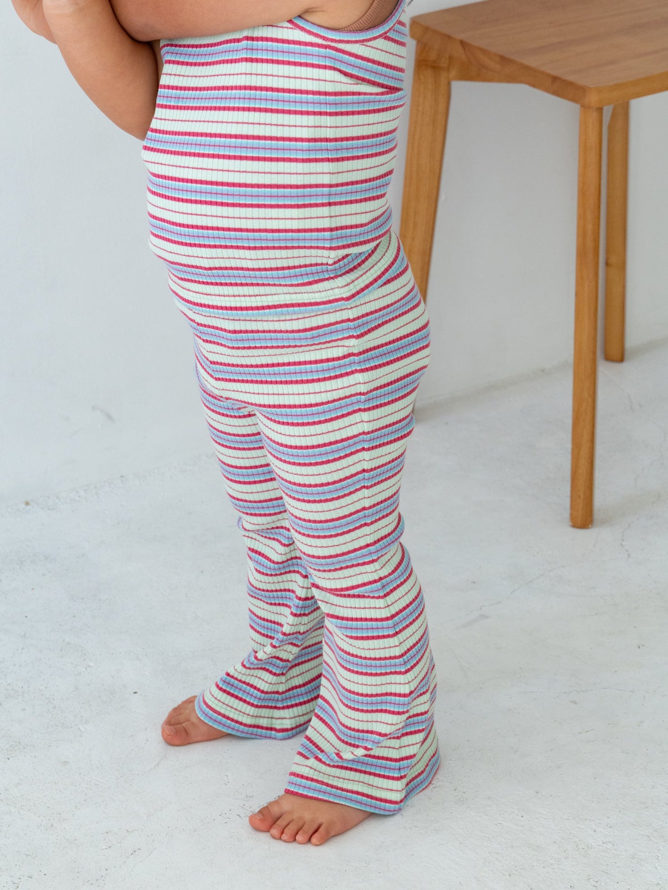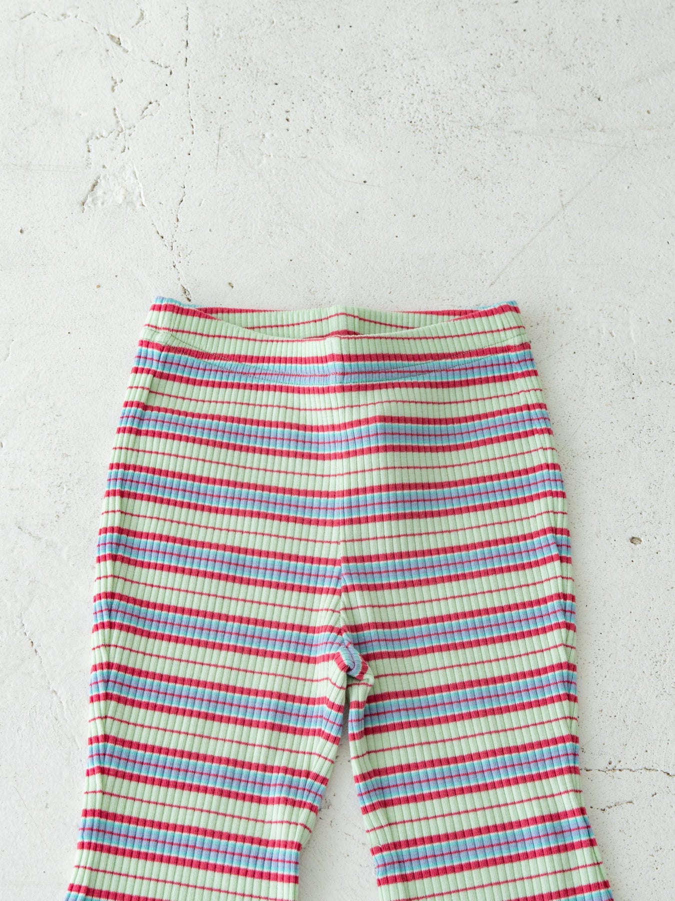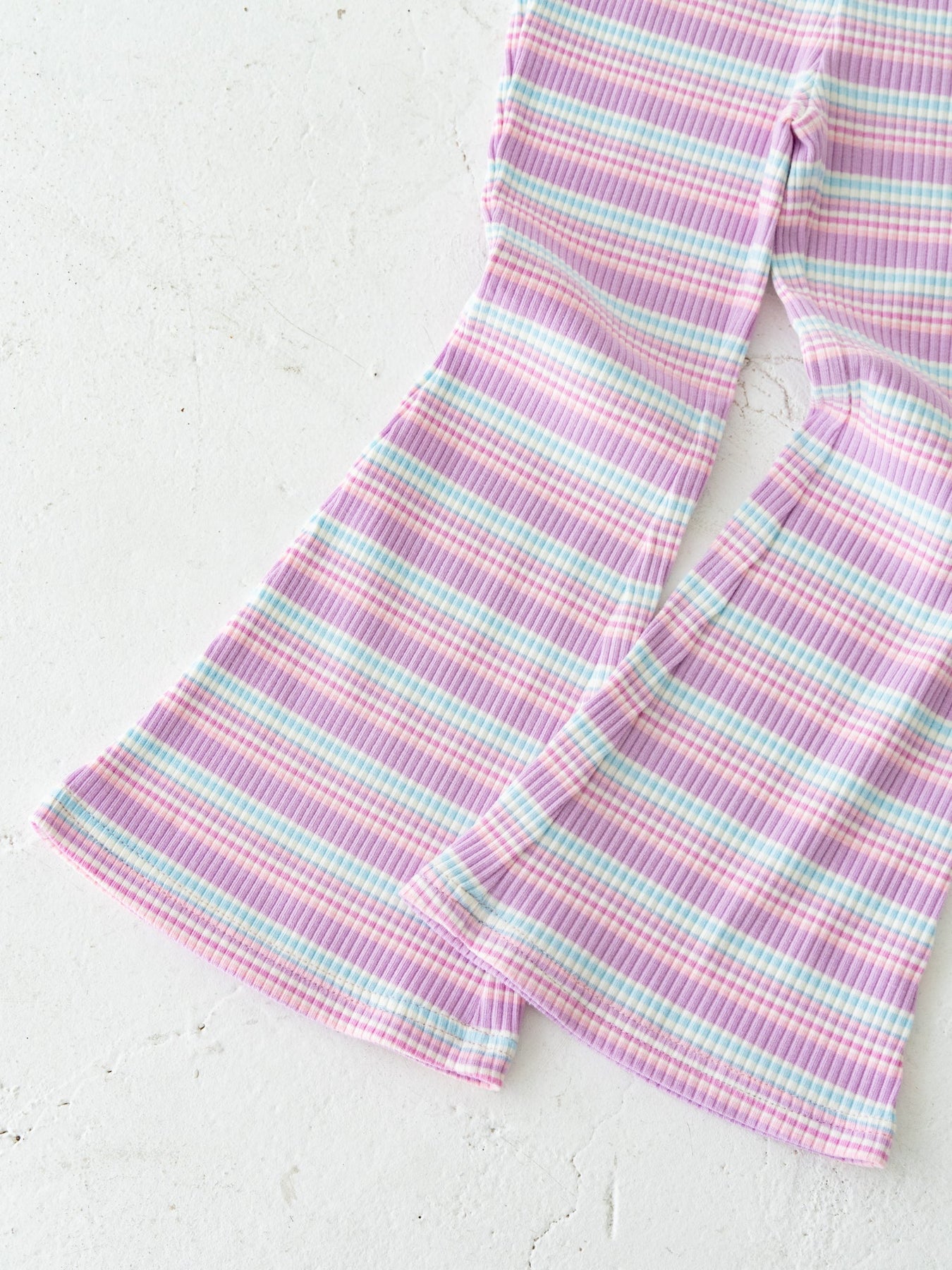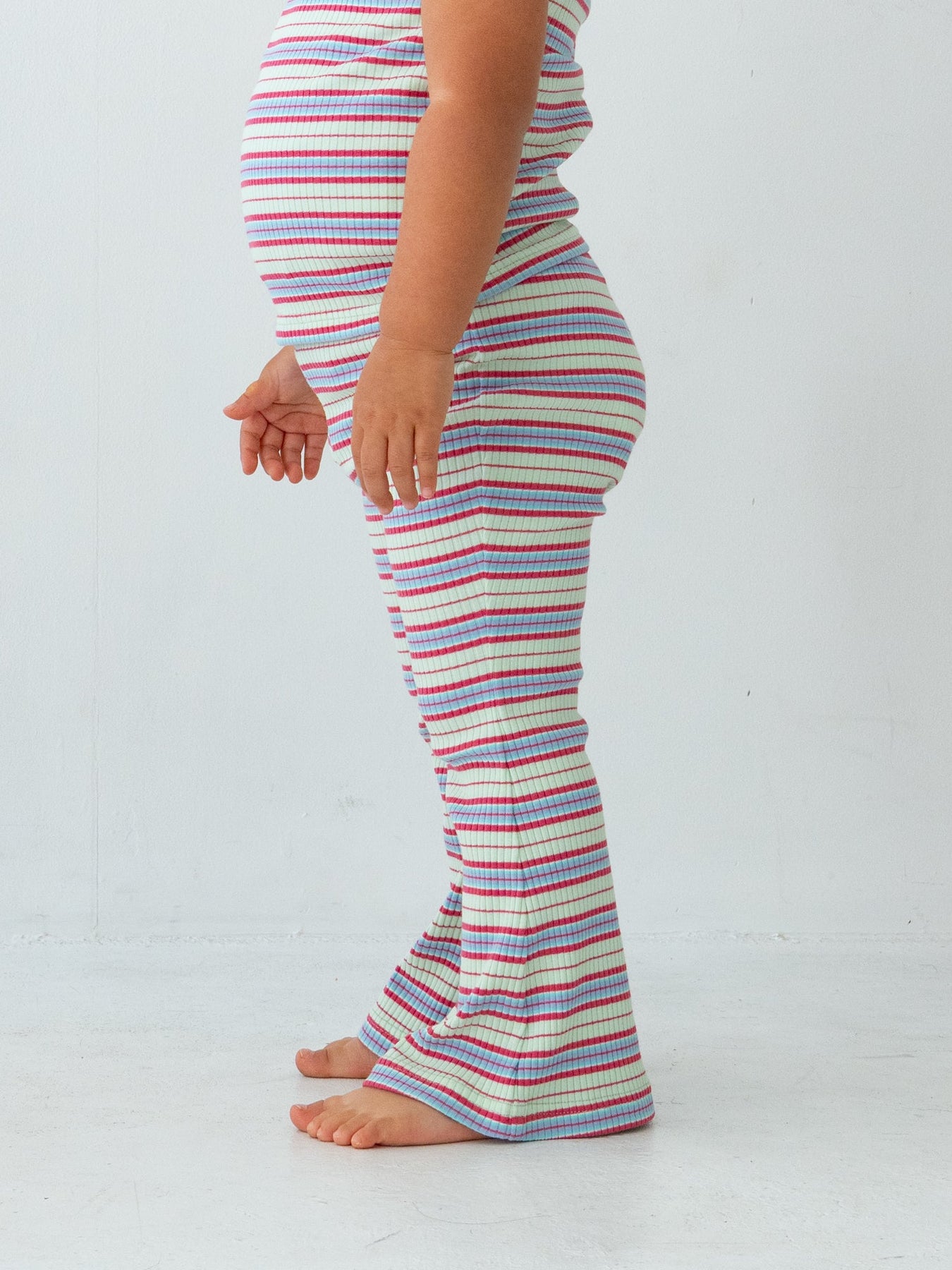 カラフルでポップなストライプが目を惹くフレアパンツ。