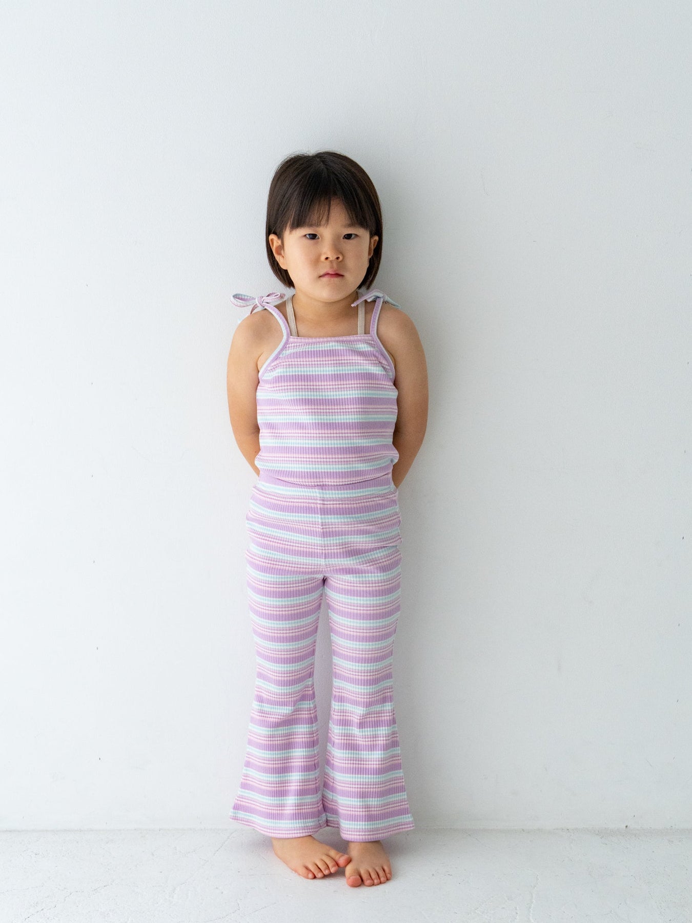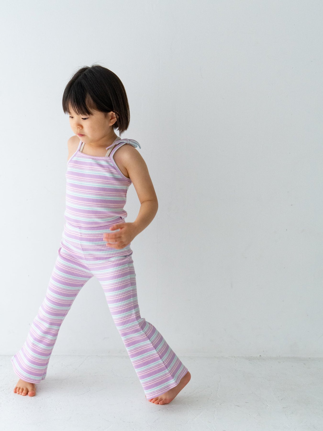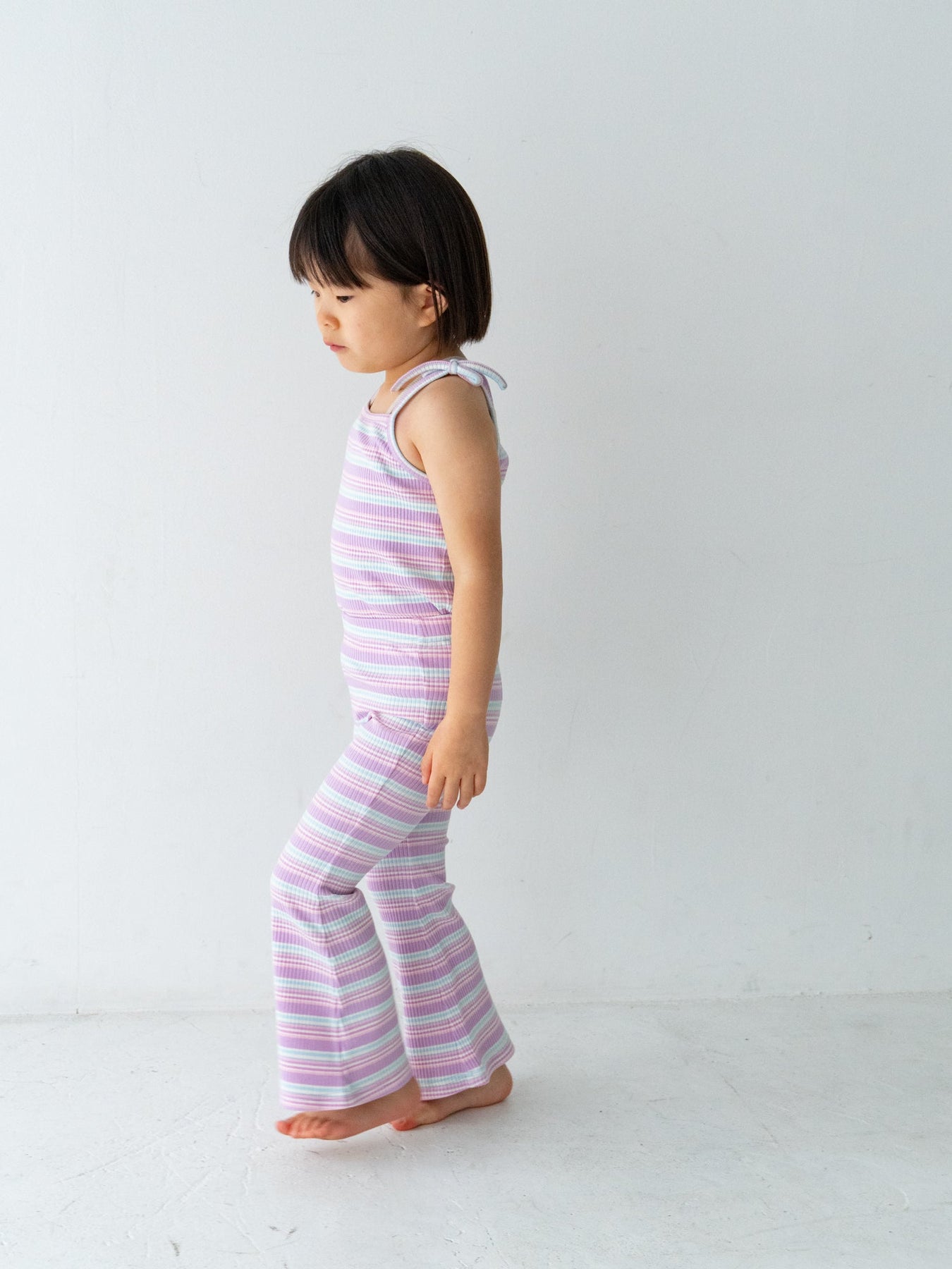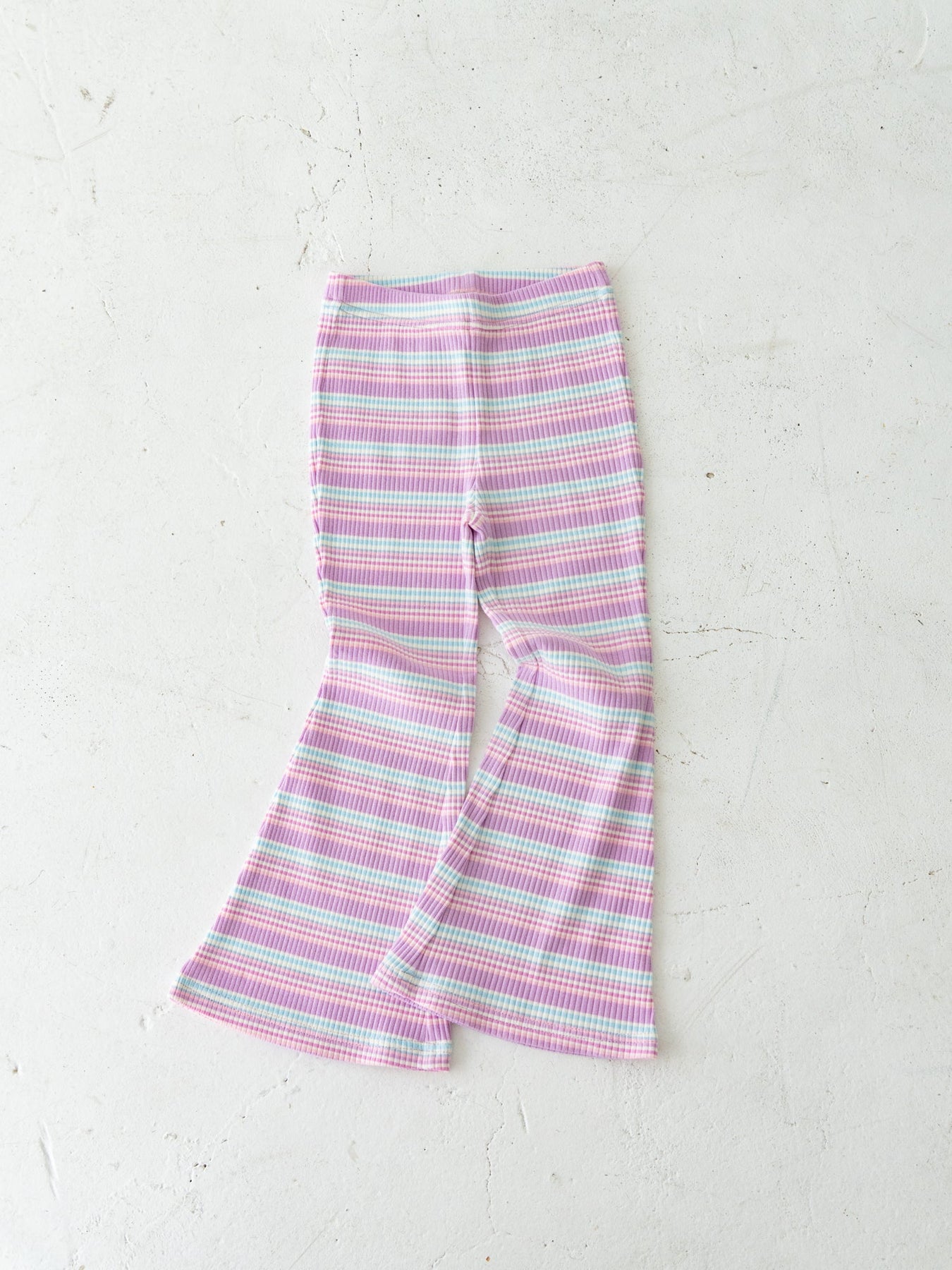 カラフルでポップなストライプが目を惹くフレアパンツ。