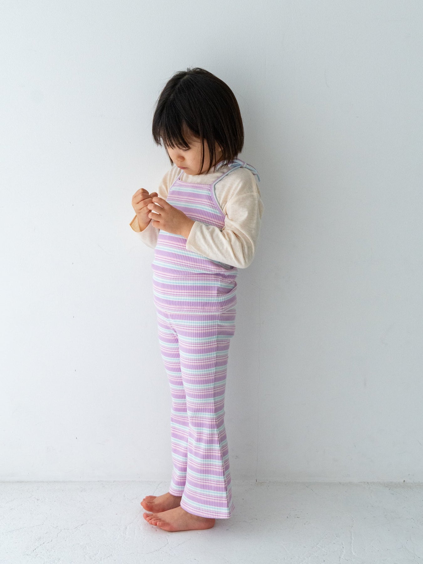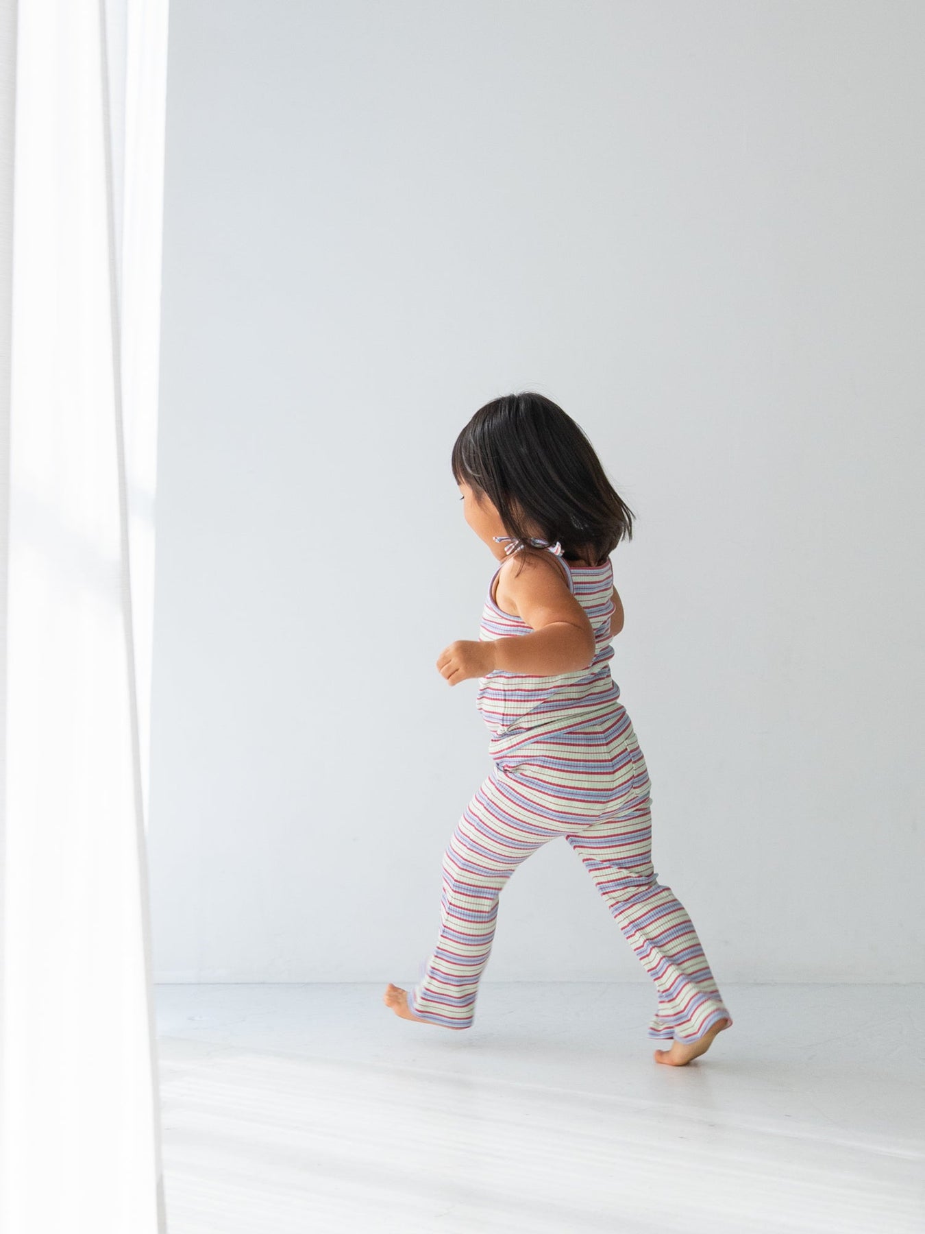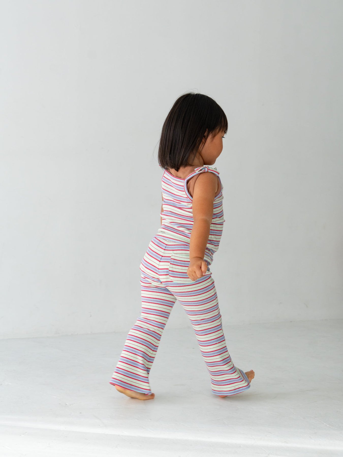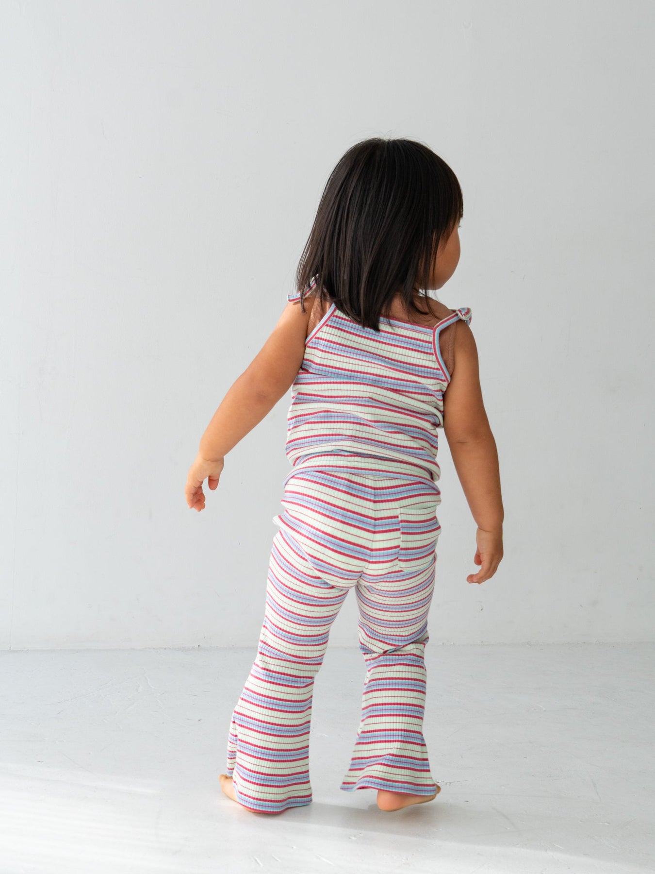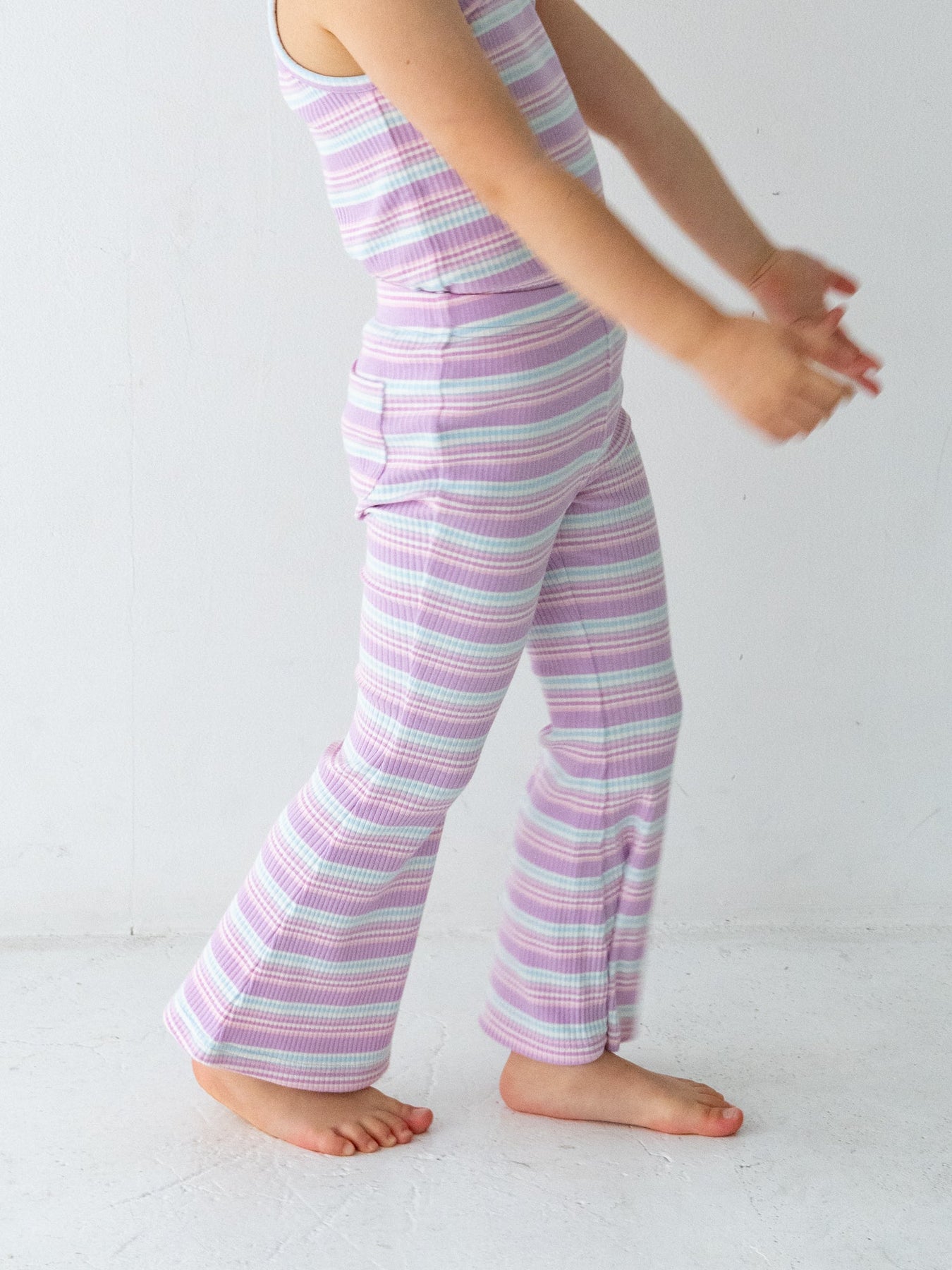 カラフルでポップなストライプが目を惹くフレアパンツ。
