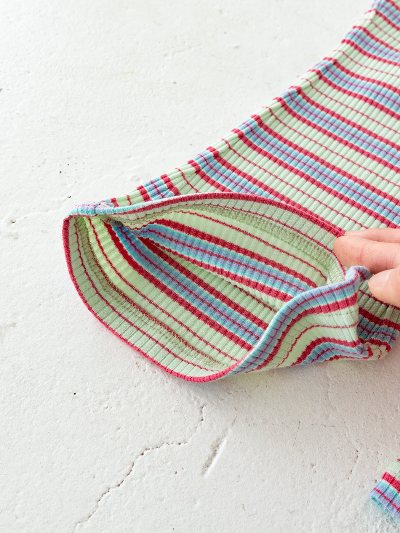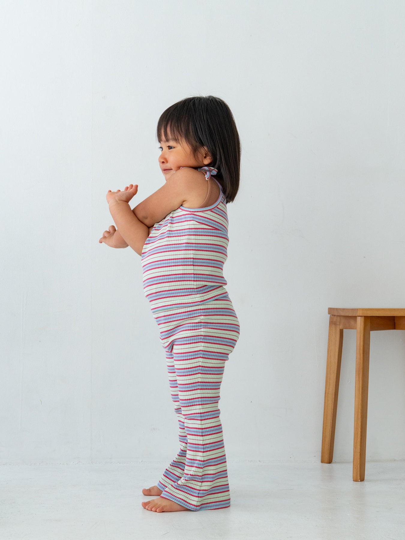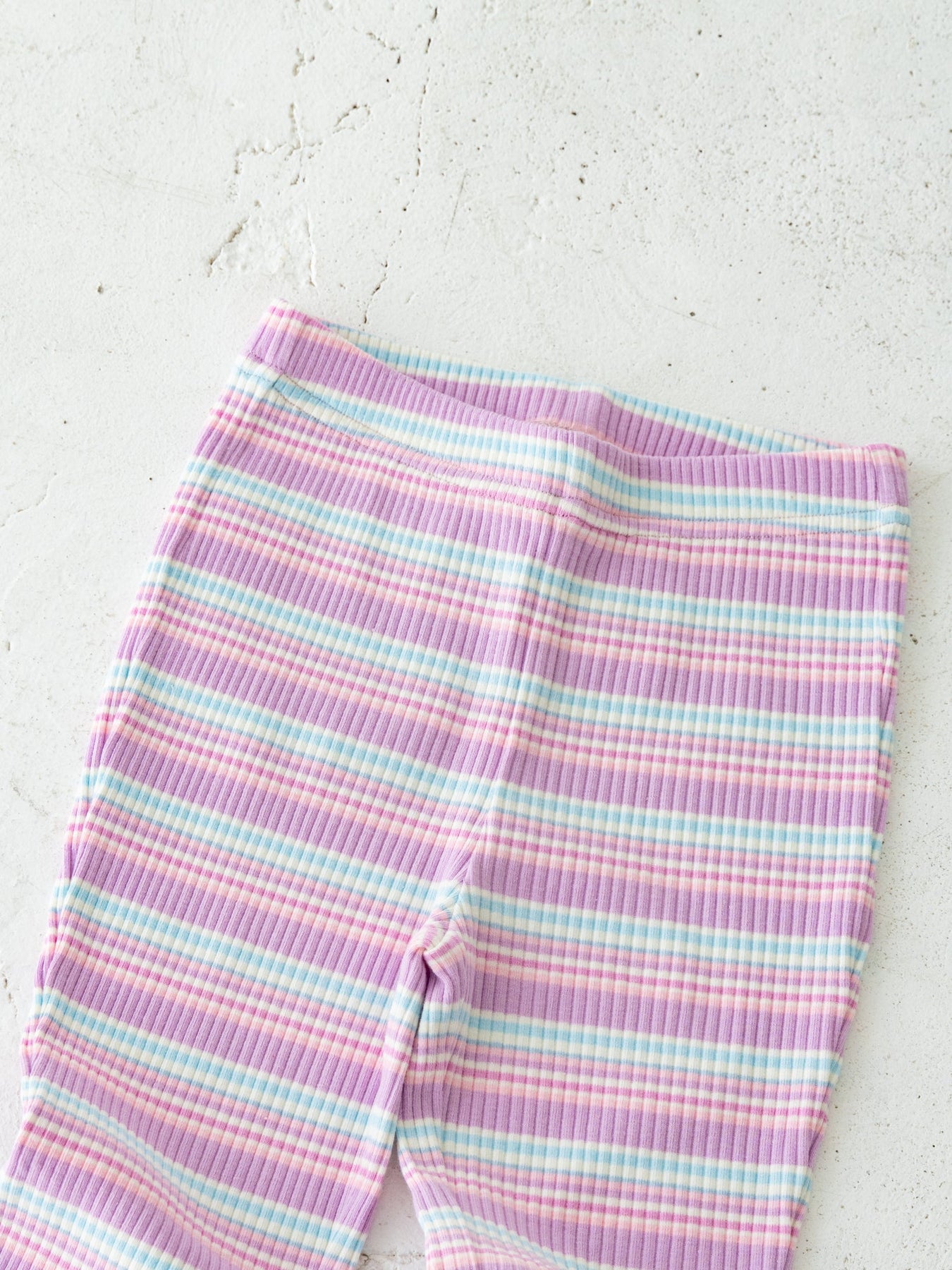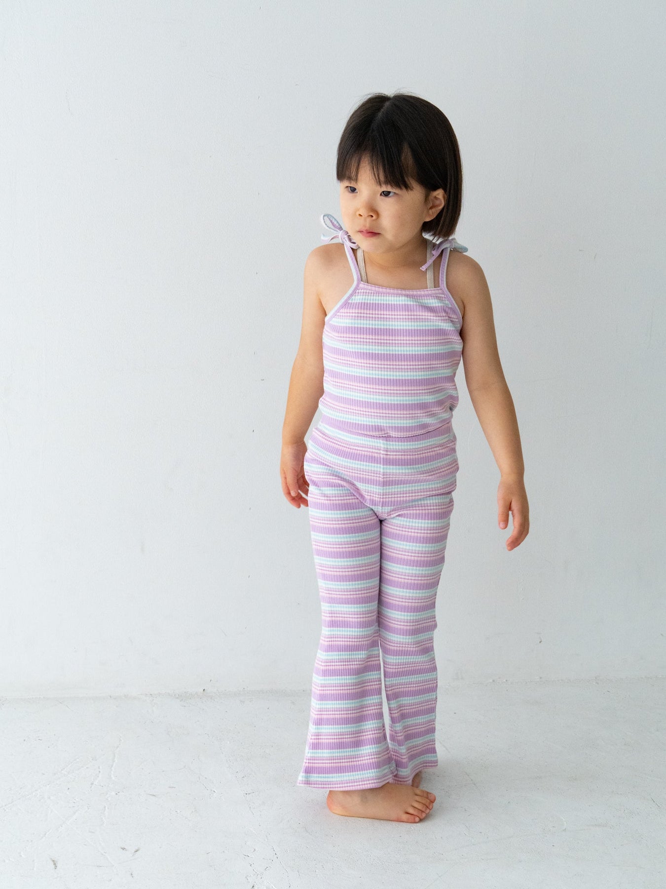 カラフルでポップなストライプが目を惹くフレアパンツ。