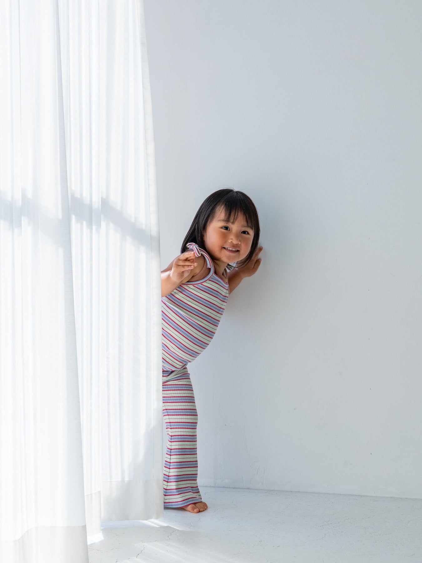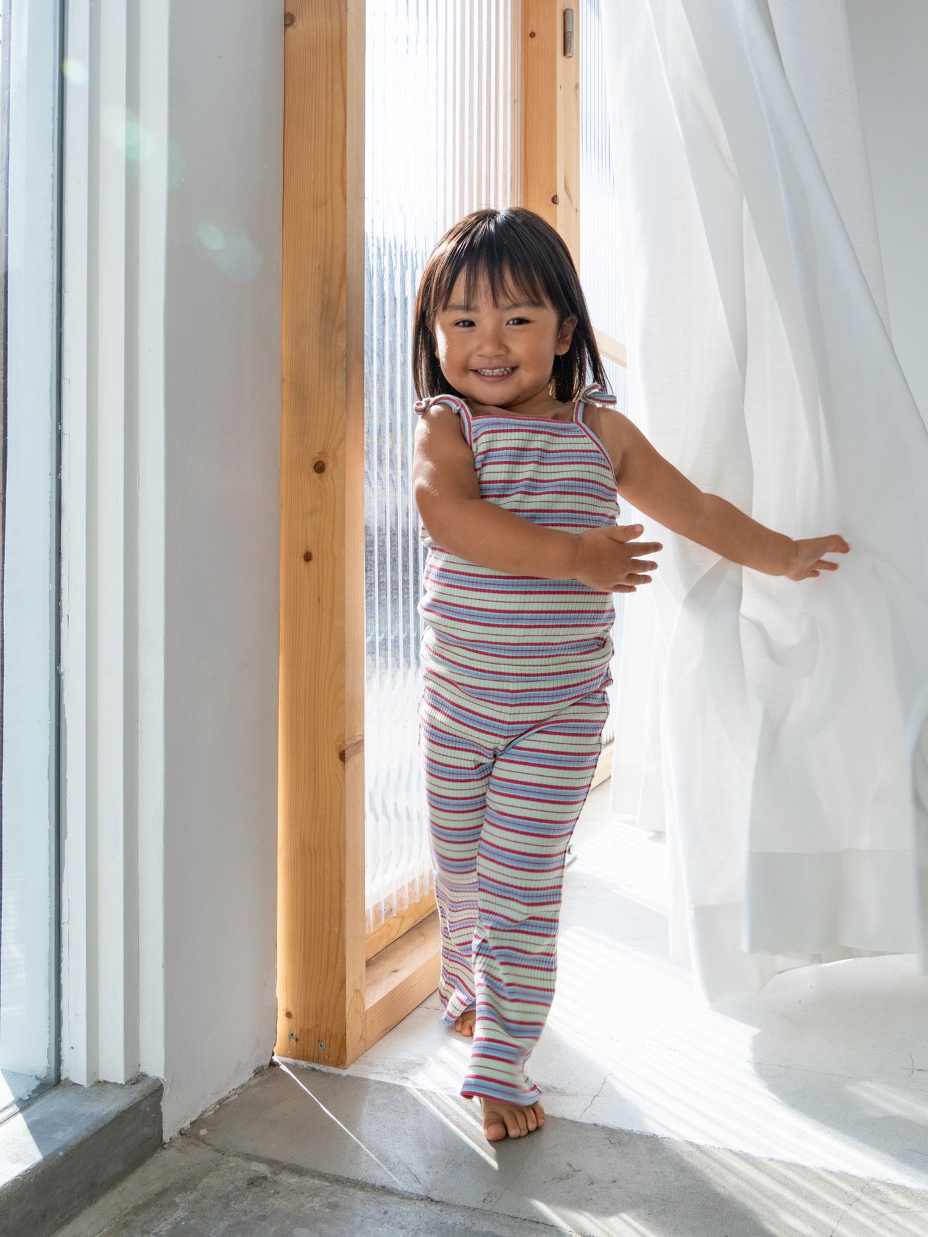 伸縮性抜群のリブ素材で、リラックスタイムにも公園遊びにも快適なはき心地です。